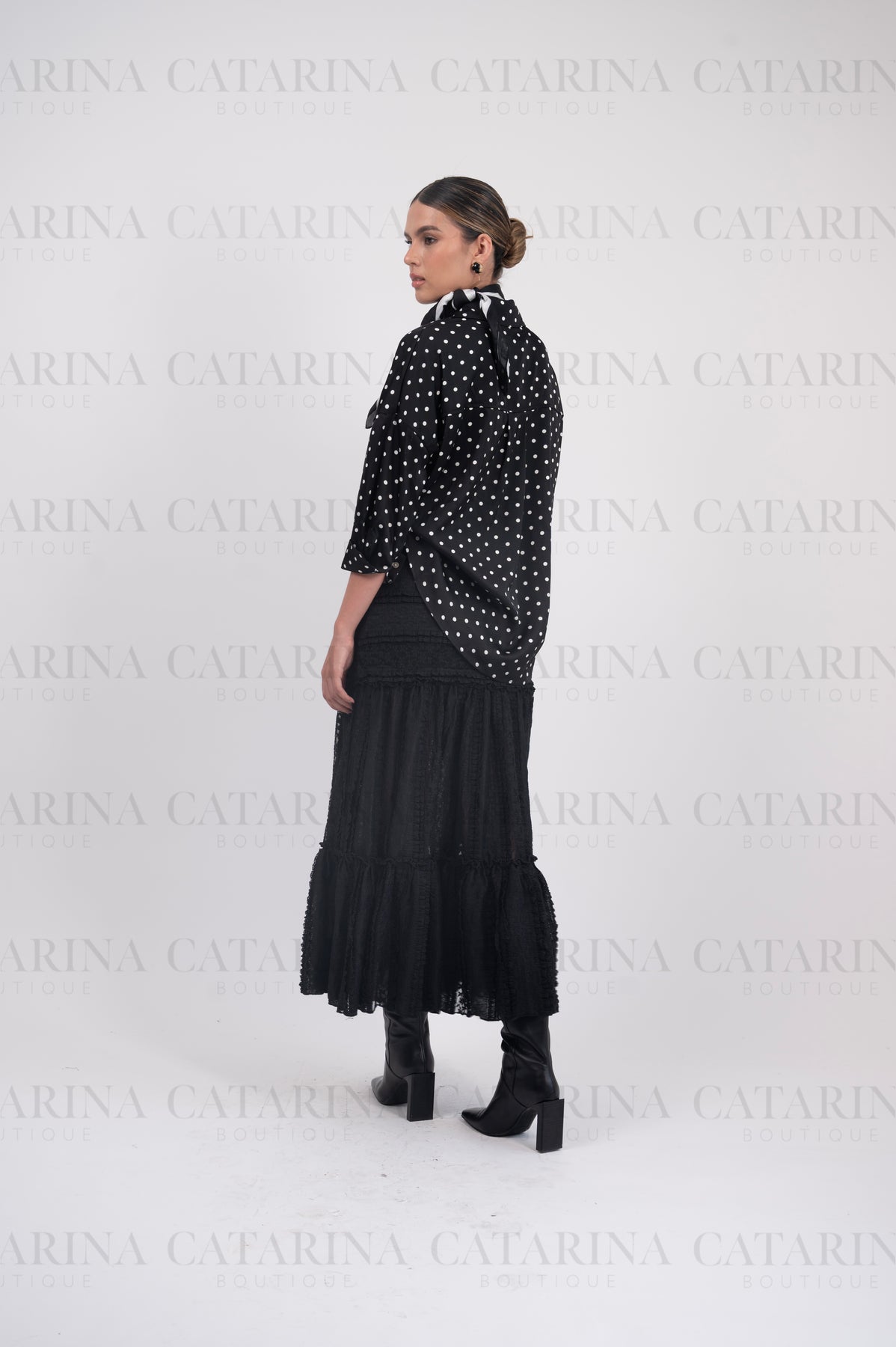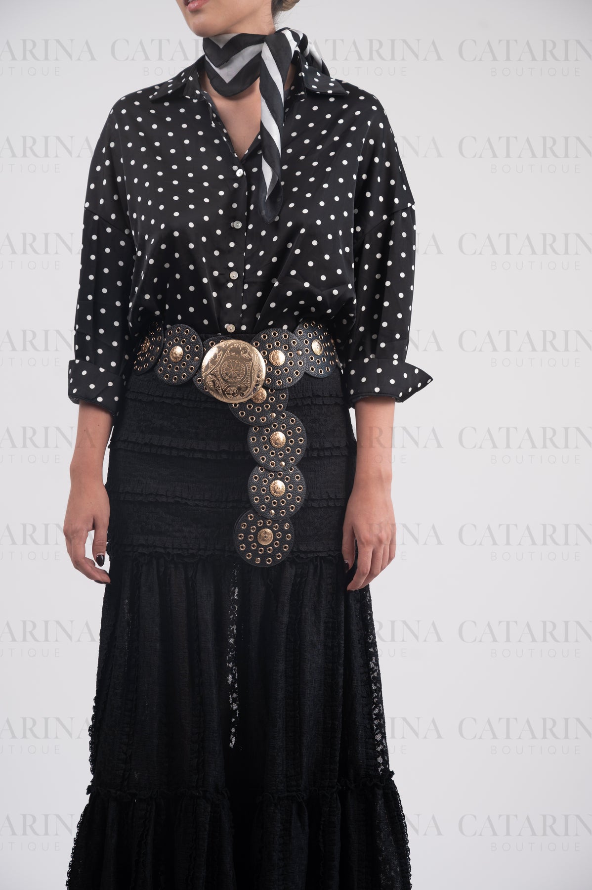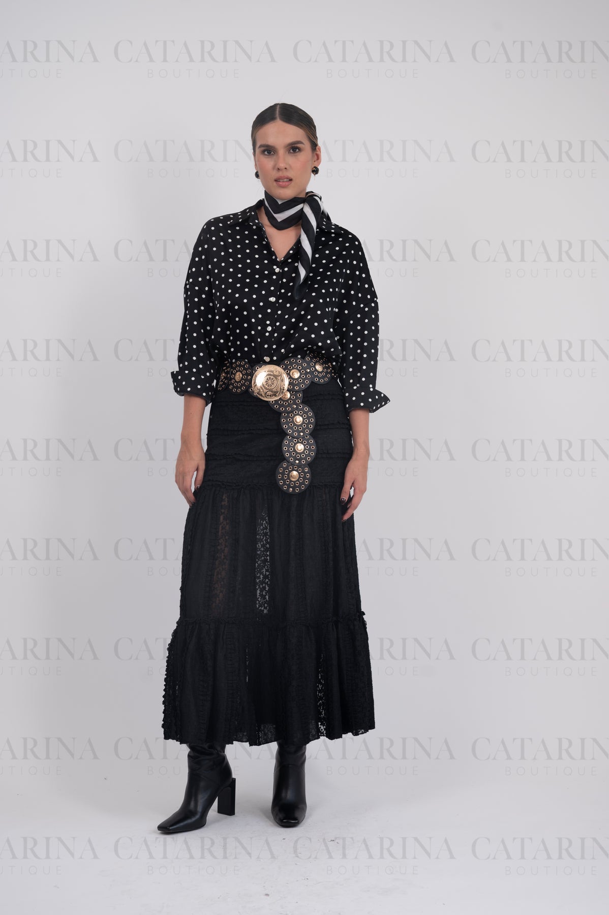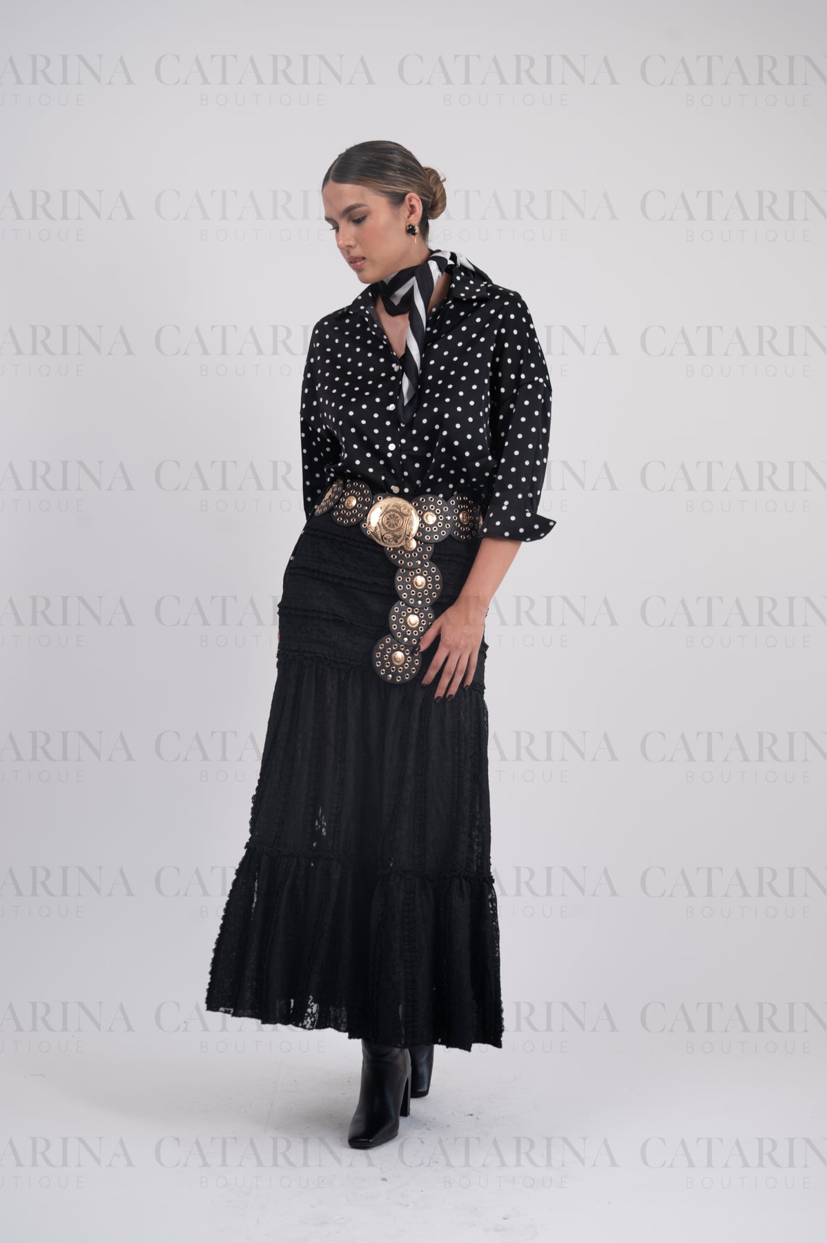 Camisa manga larga. Cuello tipo americano. Botones al frente. Bajo acabado recto.