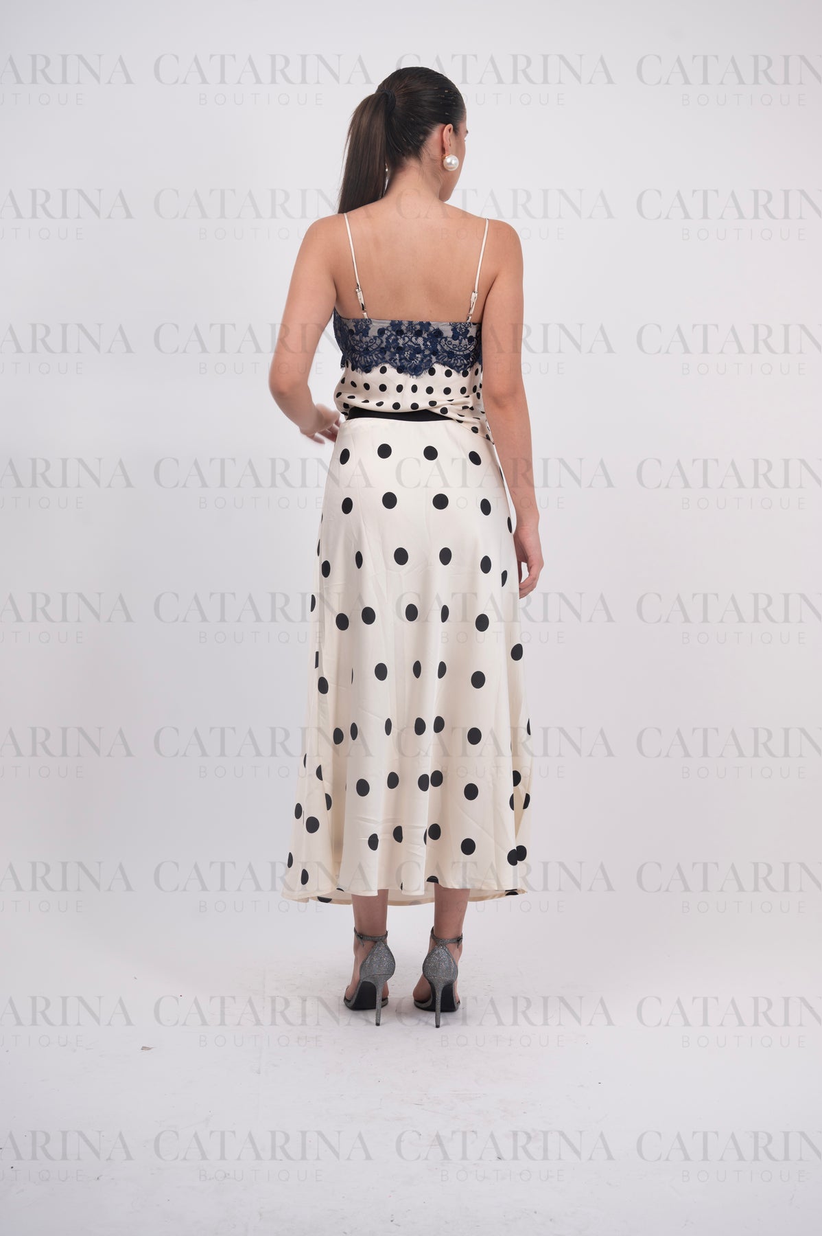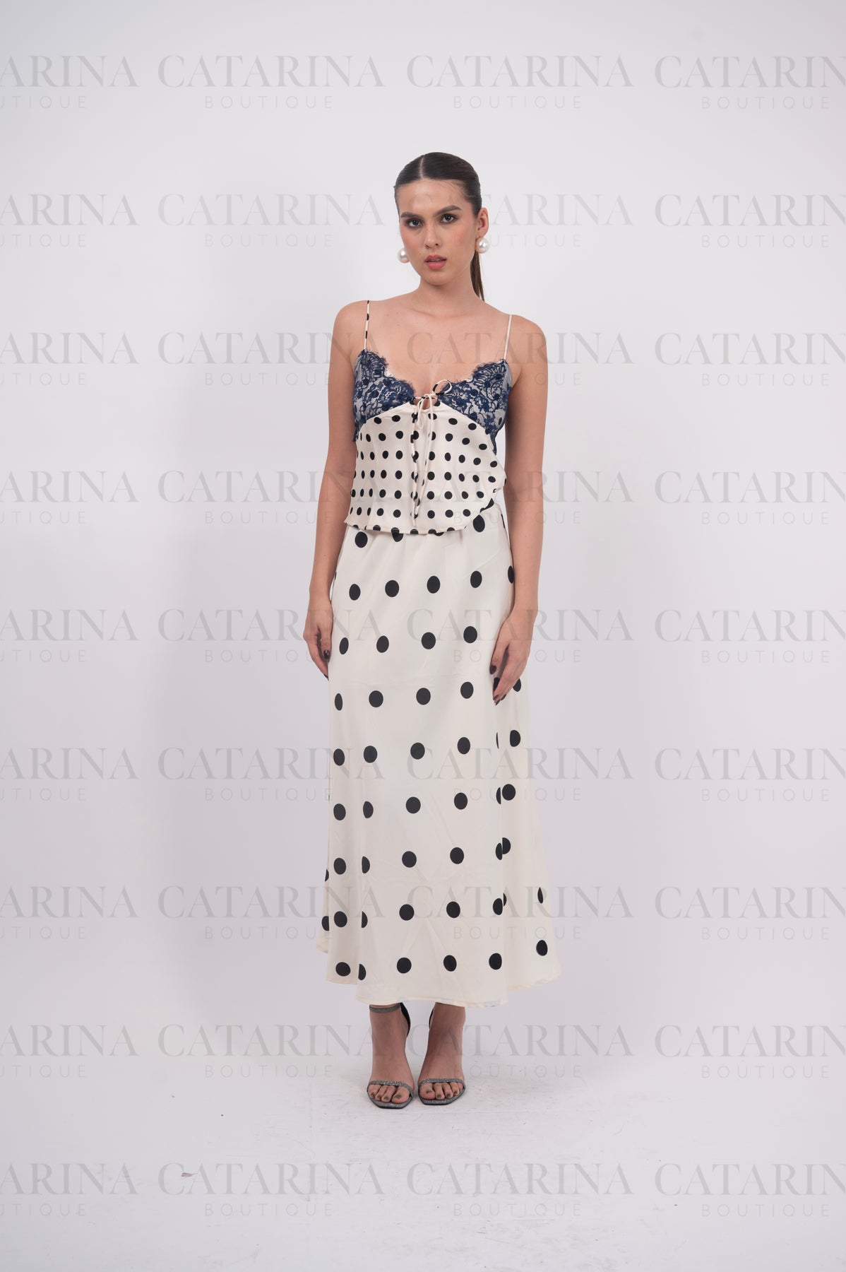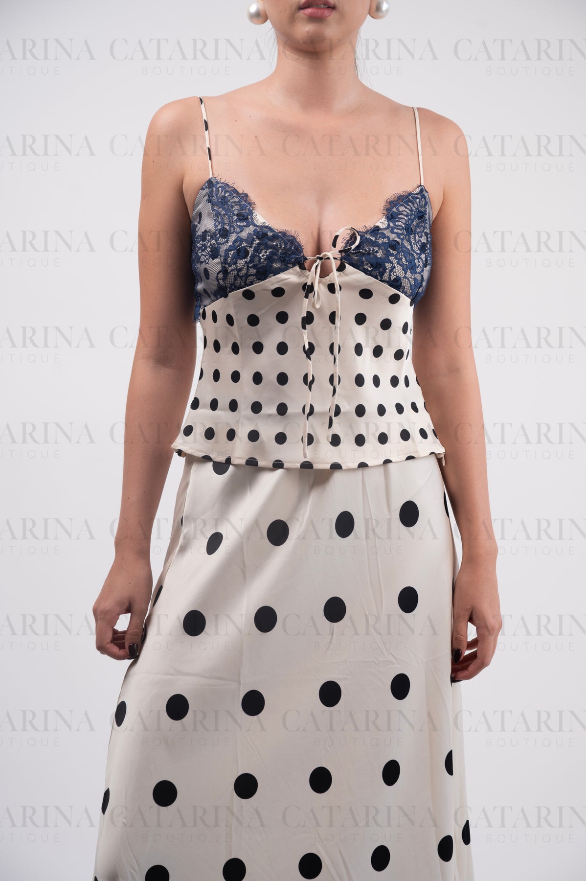 Blusa de tirante delgado. Estampado de lunares. Escote pronunciado. Bajo acabado recto. Detalle de encaje en busto.
