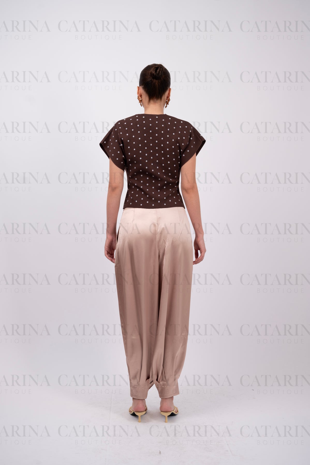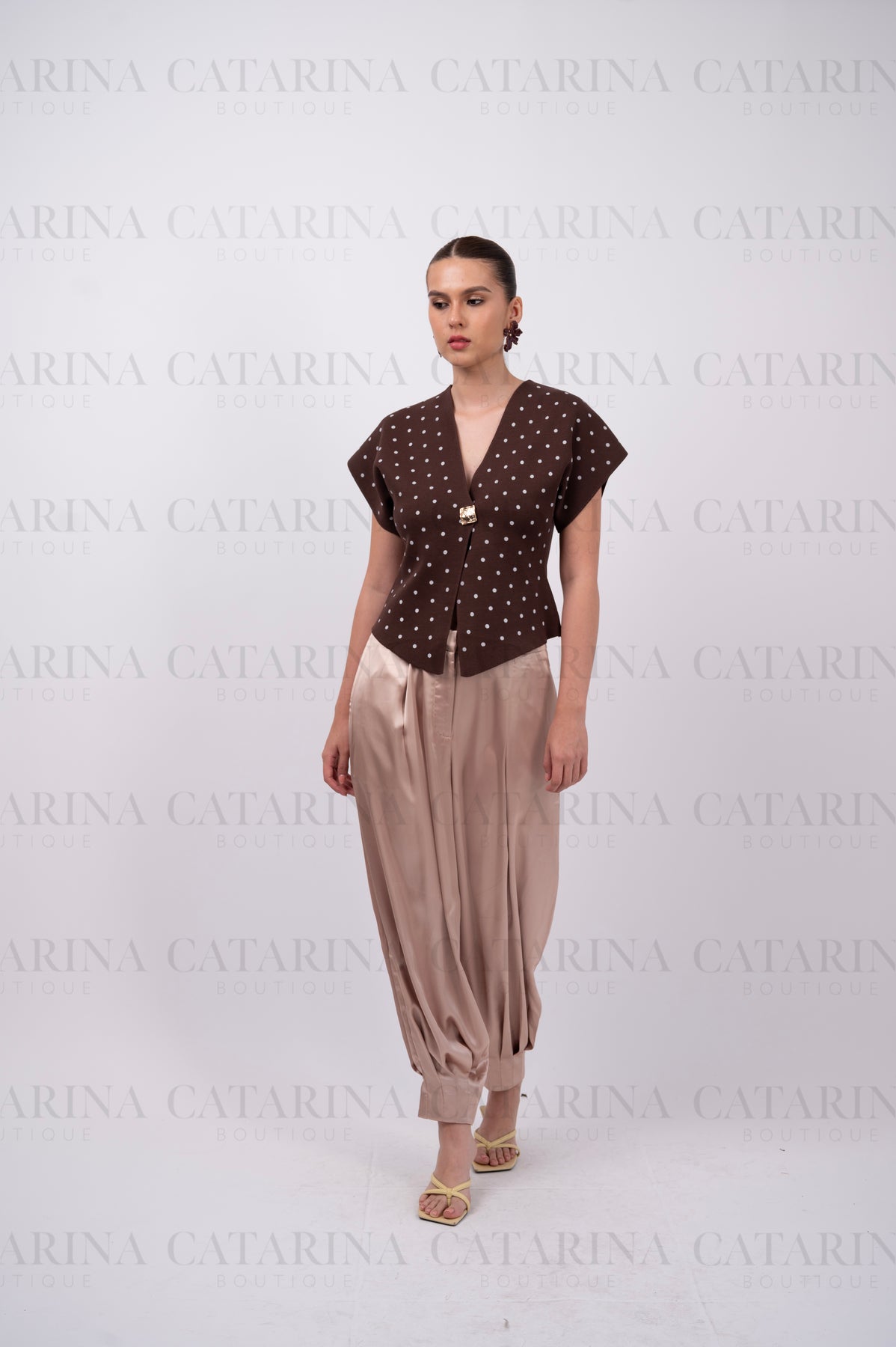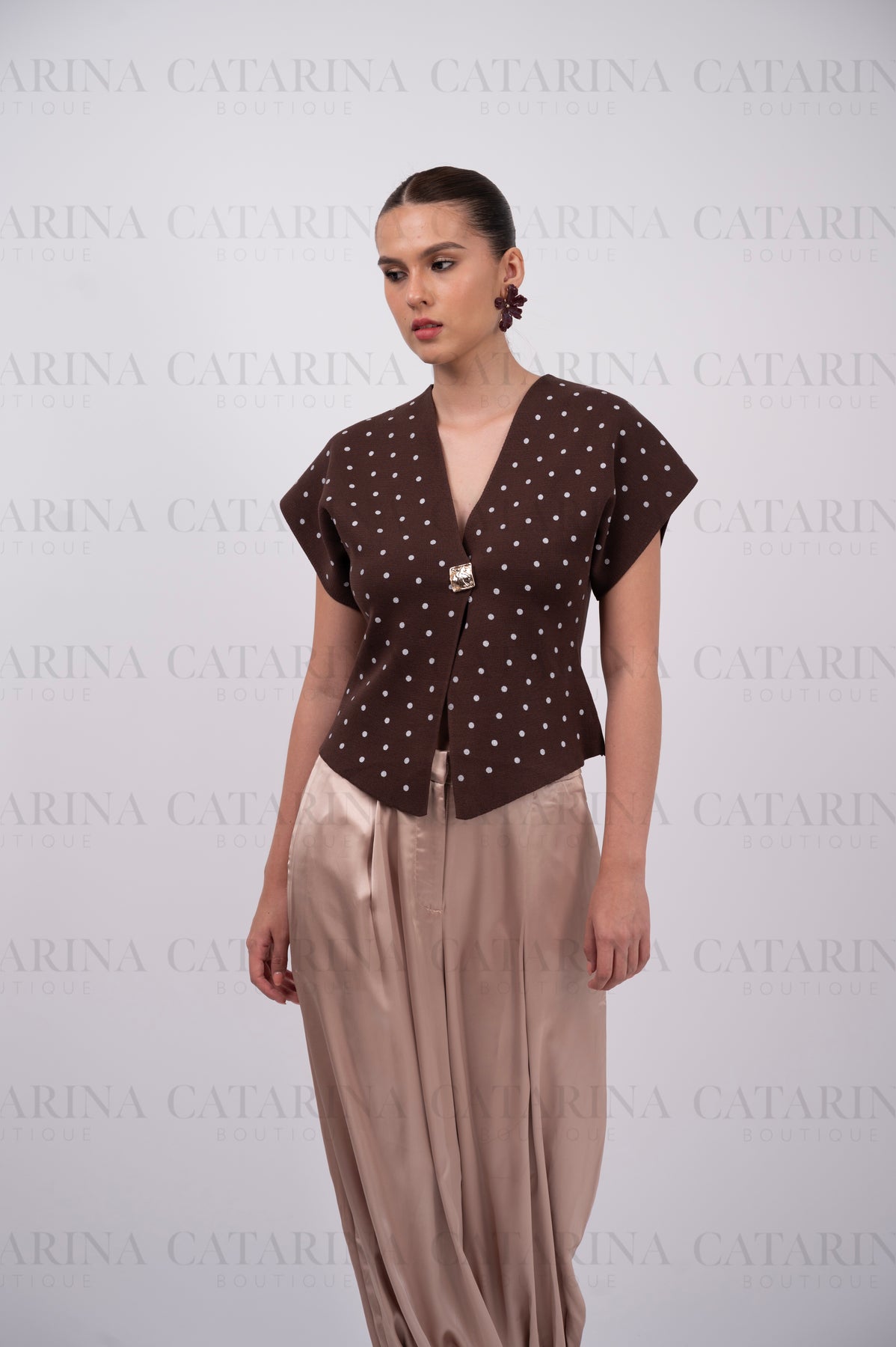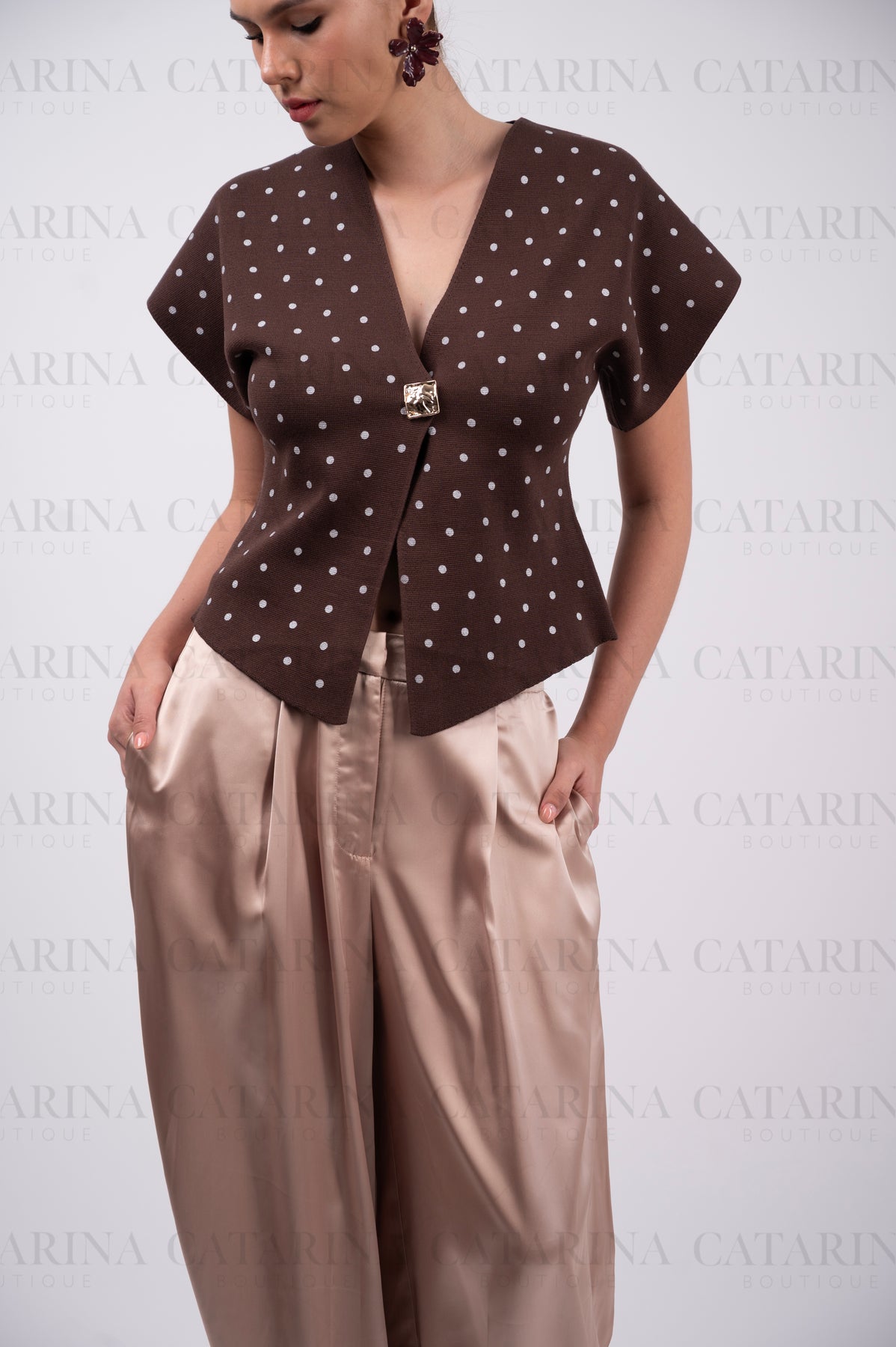 Blusa de color liso con estampado boleado. Escote en v. Bajo acabado recto. Botón al frente.