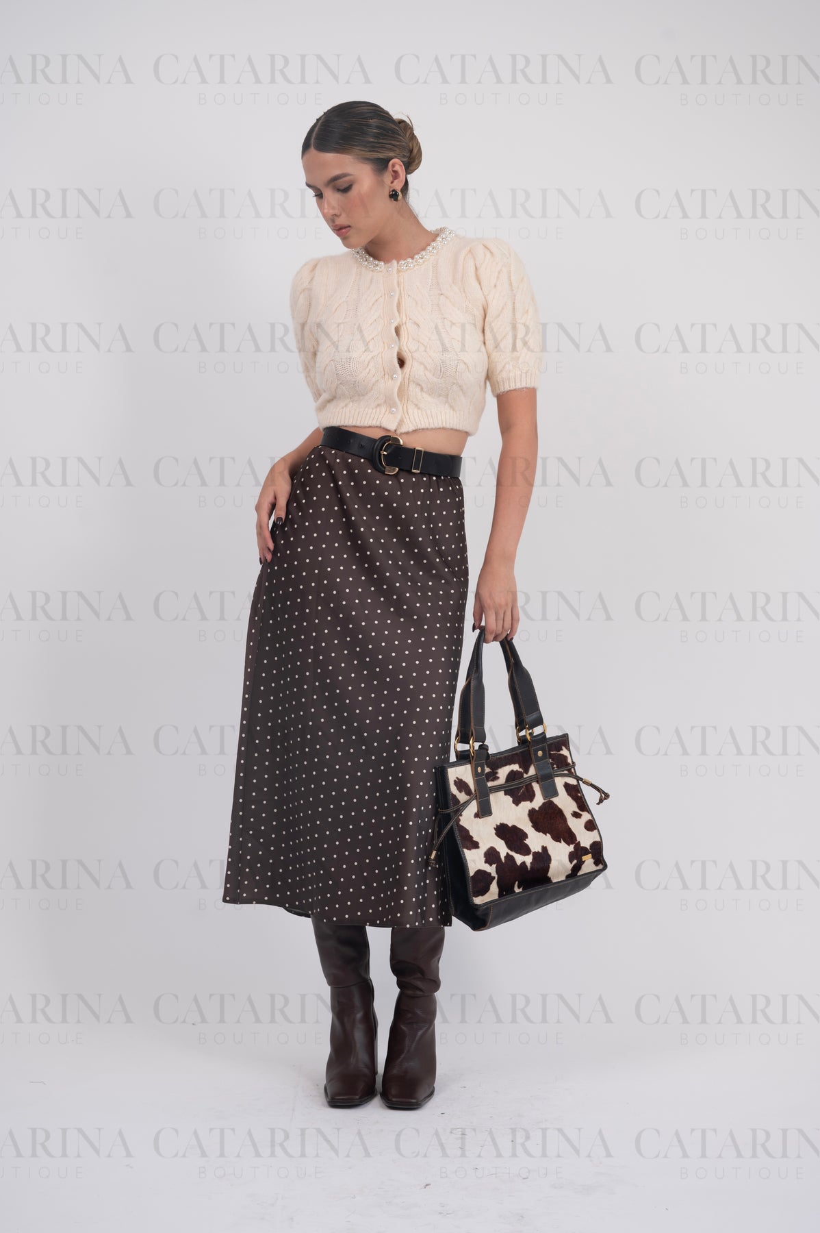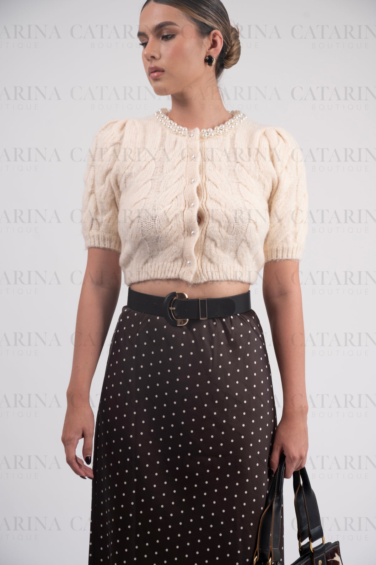 Blusa de color liso. Manga corta abullonada. Cuello redondo con detalle de perlas. Botones al frente. Bajo acabado recto. COMPOSICIÓN:100% PoliésterMaterial que no se estira ni se encoge.NO INCLUYE ACCESORIOS