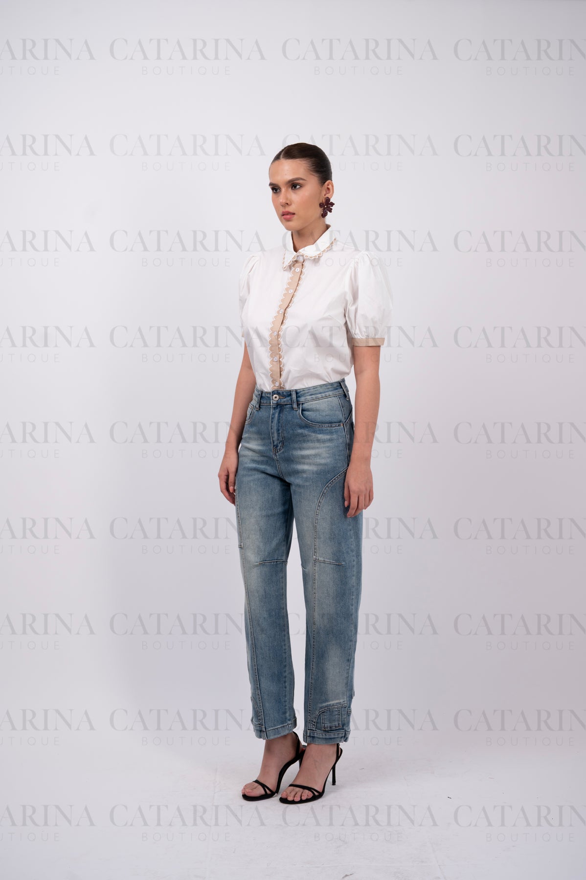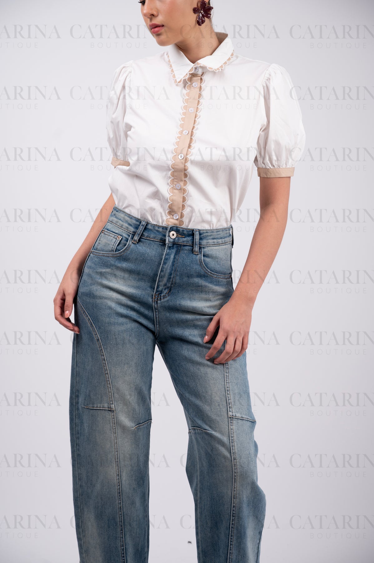 Camisa manga corta abullonada. Cuello tipo americano. Botones al frente. Bajo acabado recto.