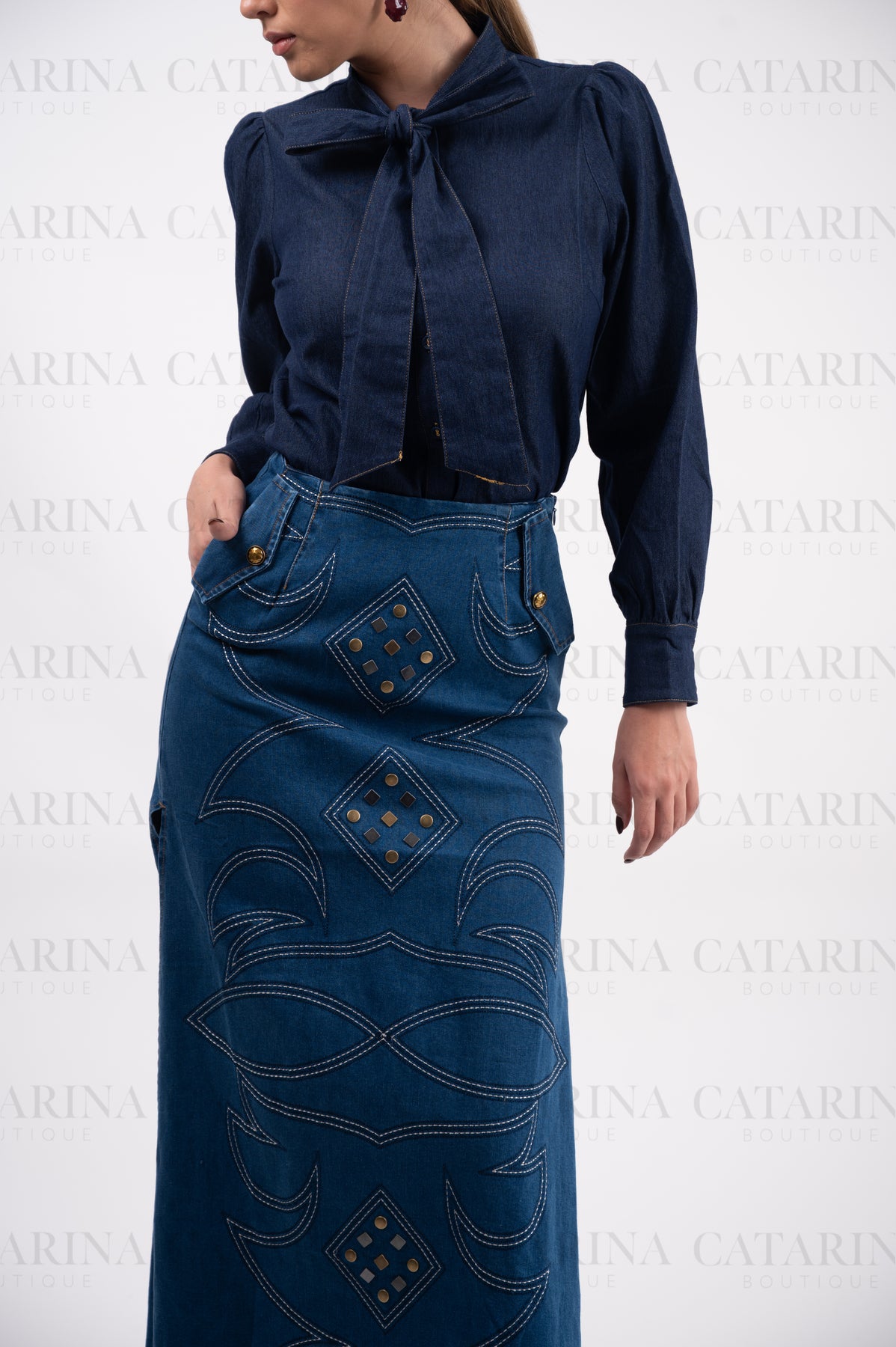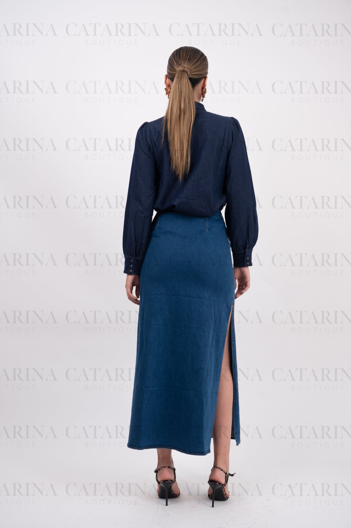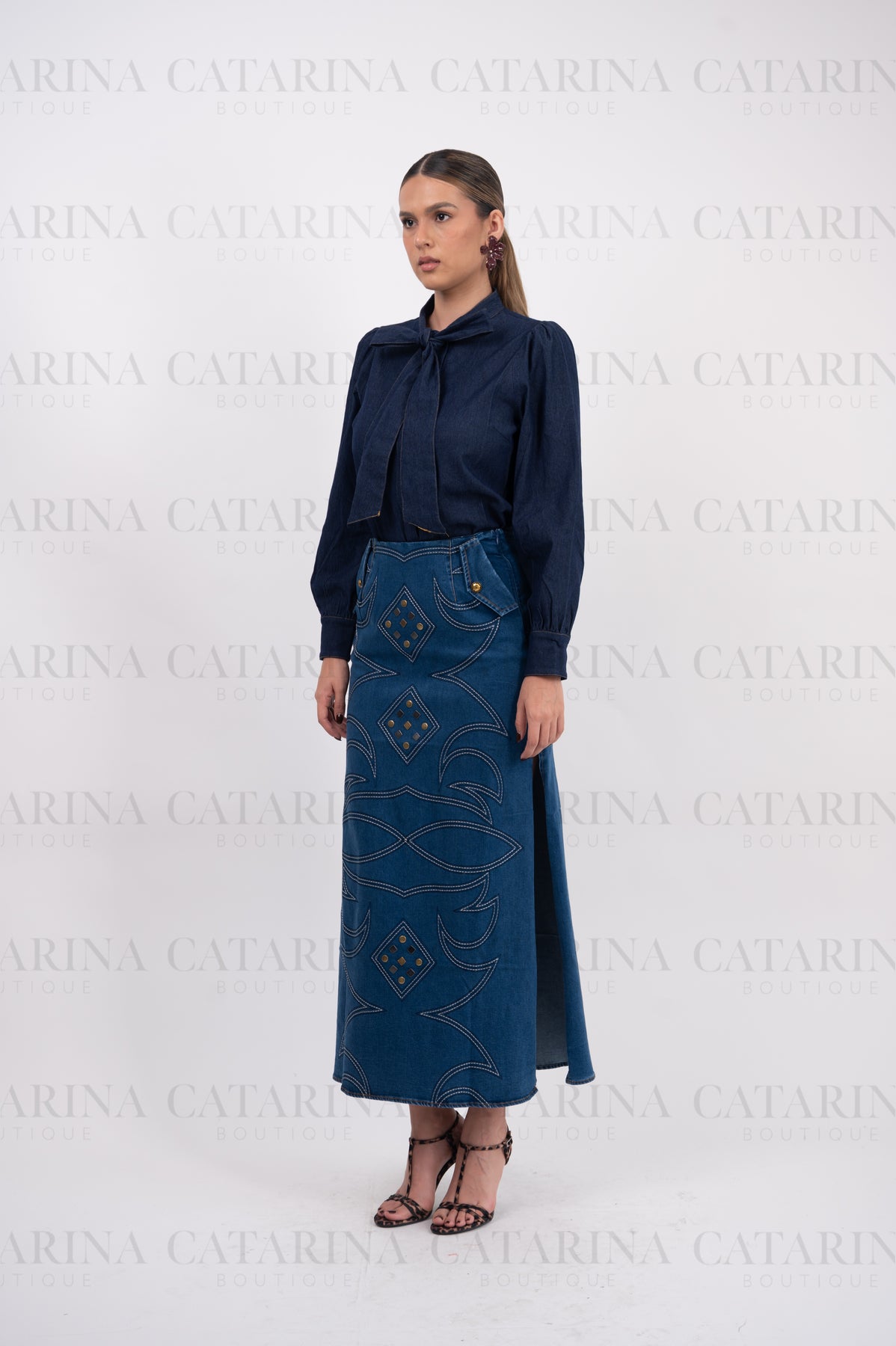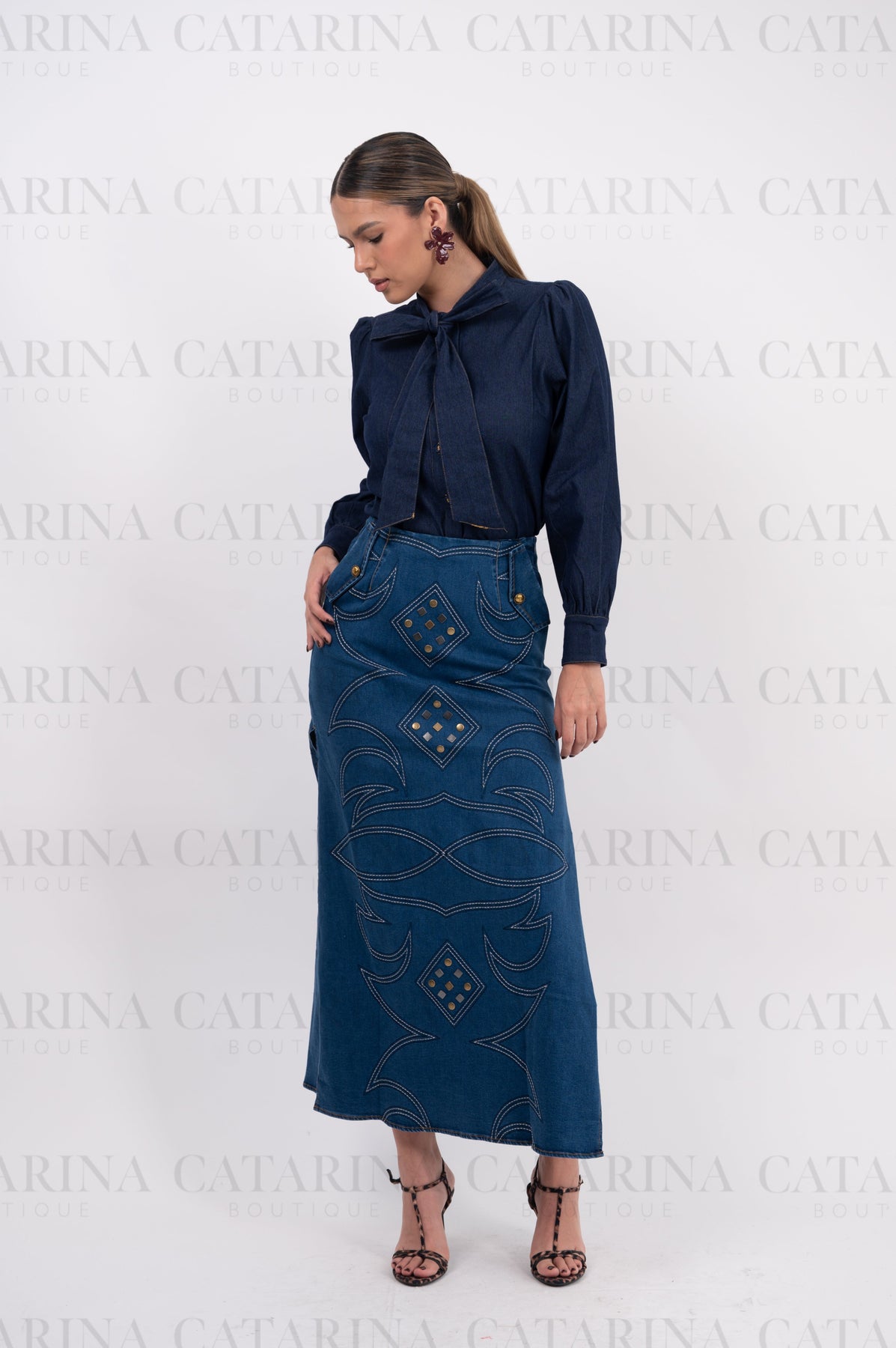 Camisa manga larga. Cuello tipo americano con detalle de lazadas. Botones al frente. Bajo acabado recto.