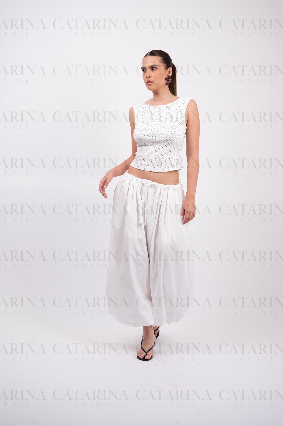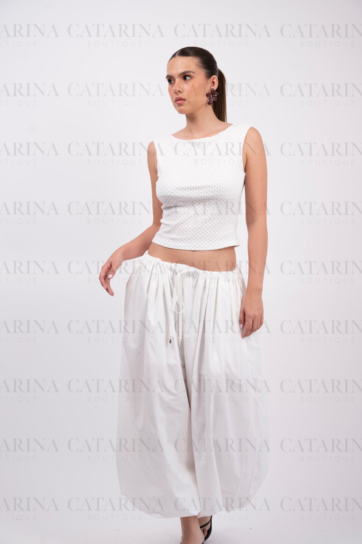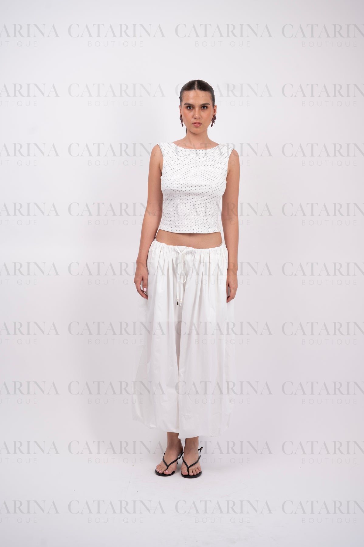 Elegante blusa de silueta minimalista en color blanco, adornada con un delicado y tupido estampado de lunares (polka dots) en negro.
