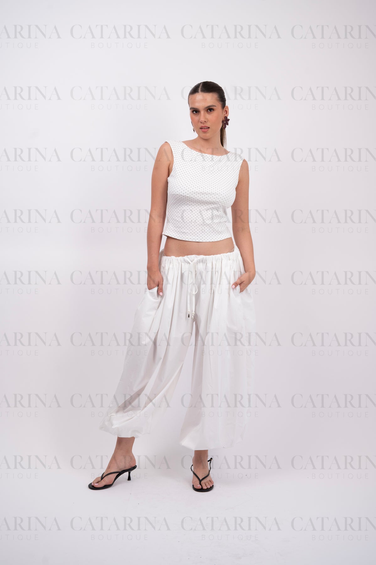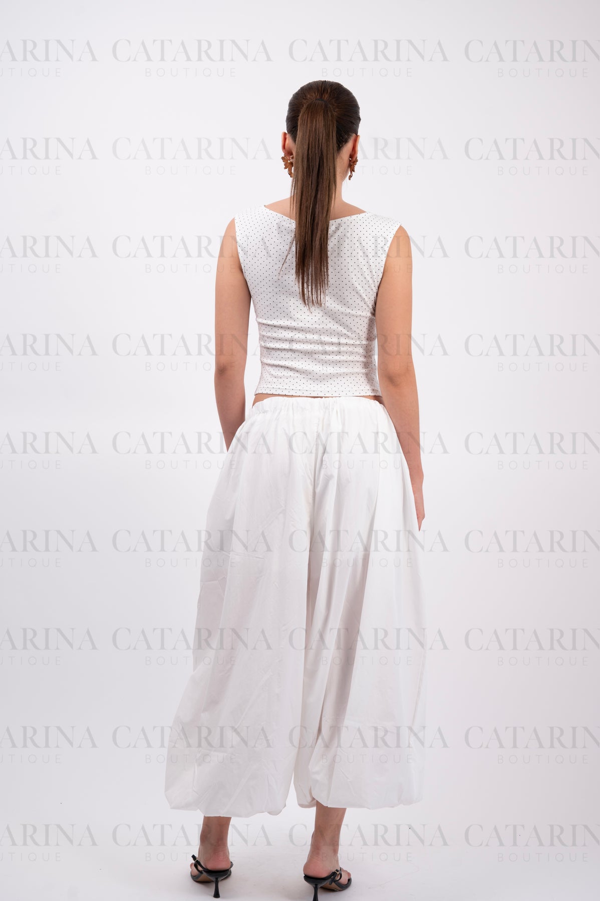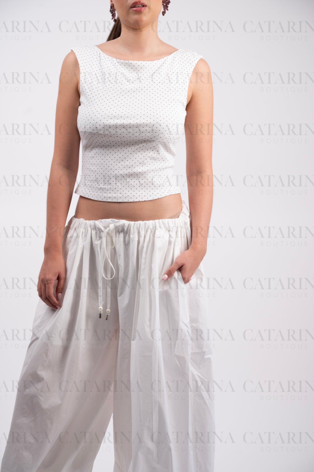 Elegante blusa de silueta minimalista en color blanco, adornada con un delicado y tupido estampado de lunares (polka dots) en negro.