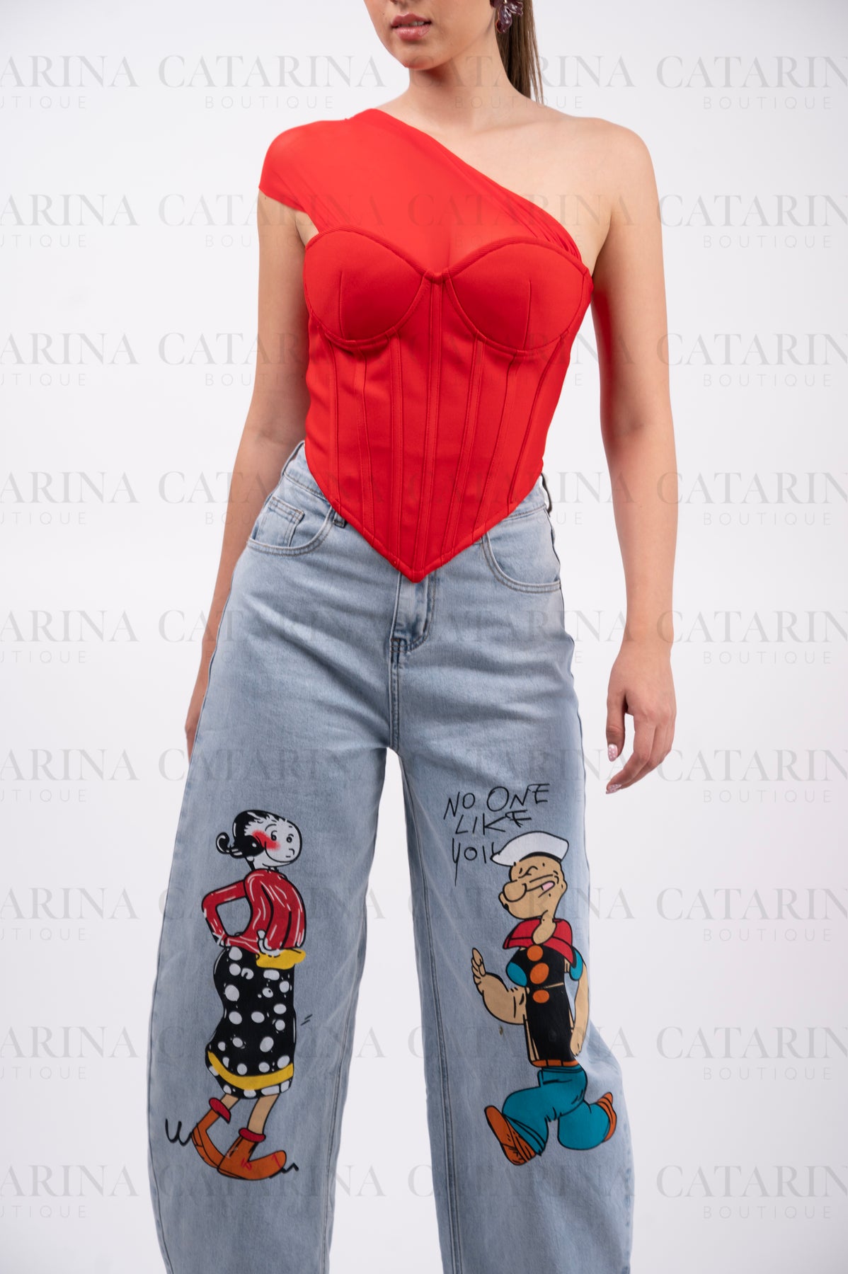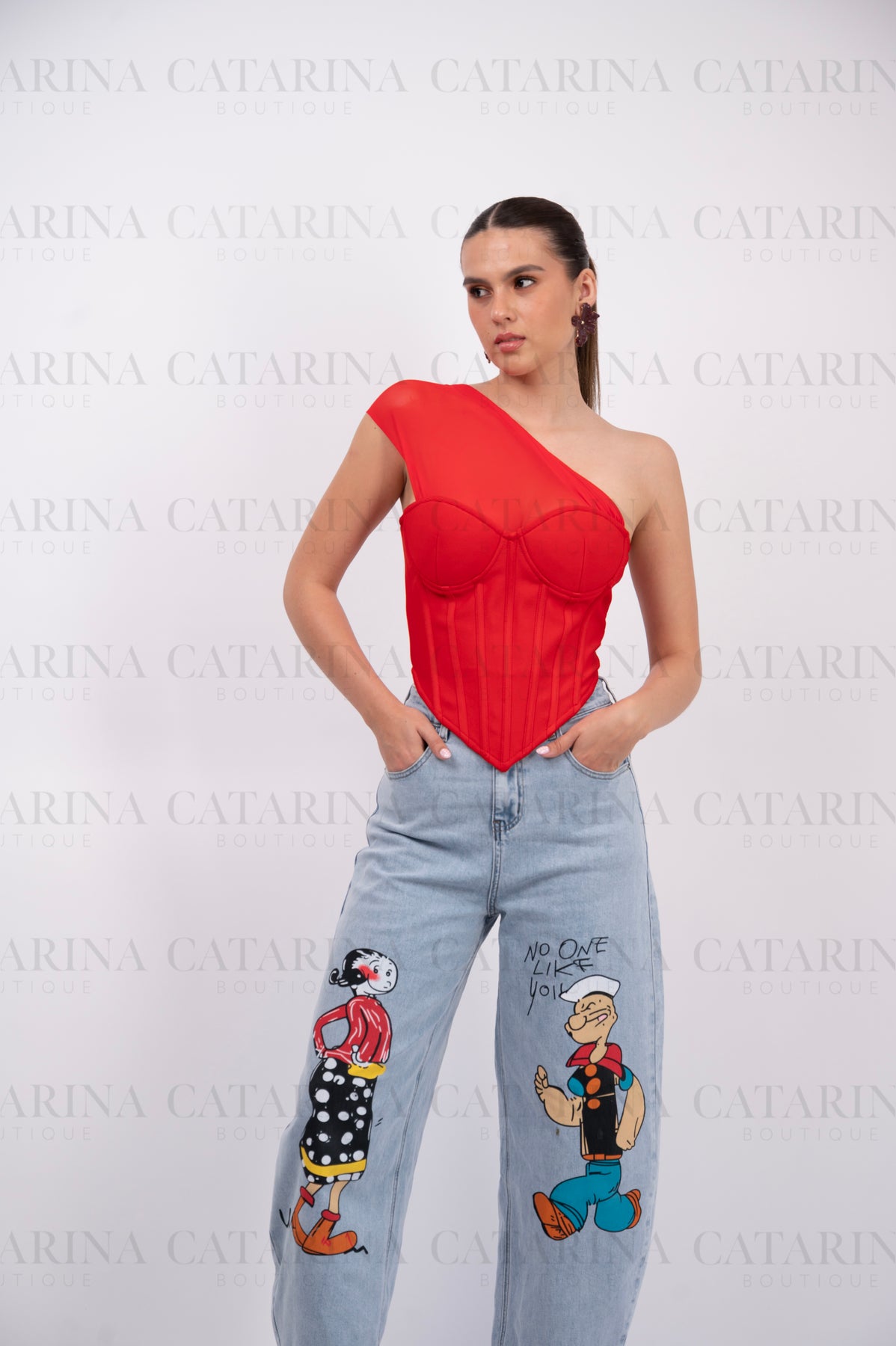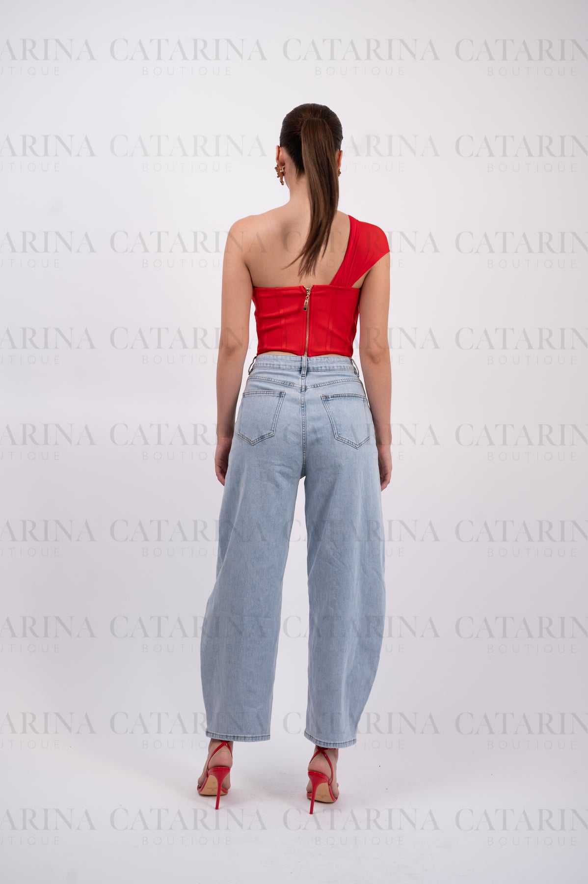 Top de silueta tipo corsé en un vibrante color rojo. Presenta un diseño vanguardista con escote asimétrico con un elegante drapeado en tul sobre uno de los hombros. La estructura frontal cuenta con copas preformadas y varillas verticales que definen y estilizan la cintura, terminando en un acabado en punta que aporta un toque moderno y seductor.