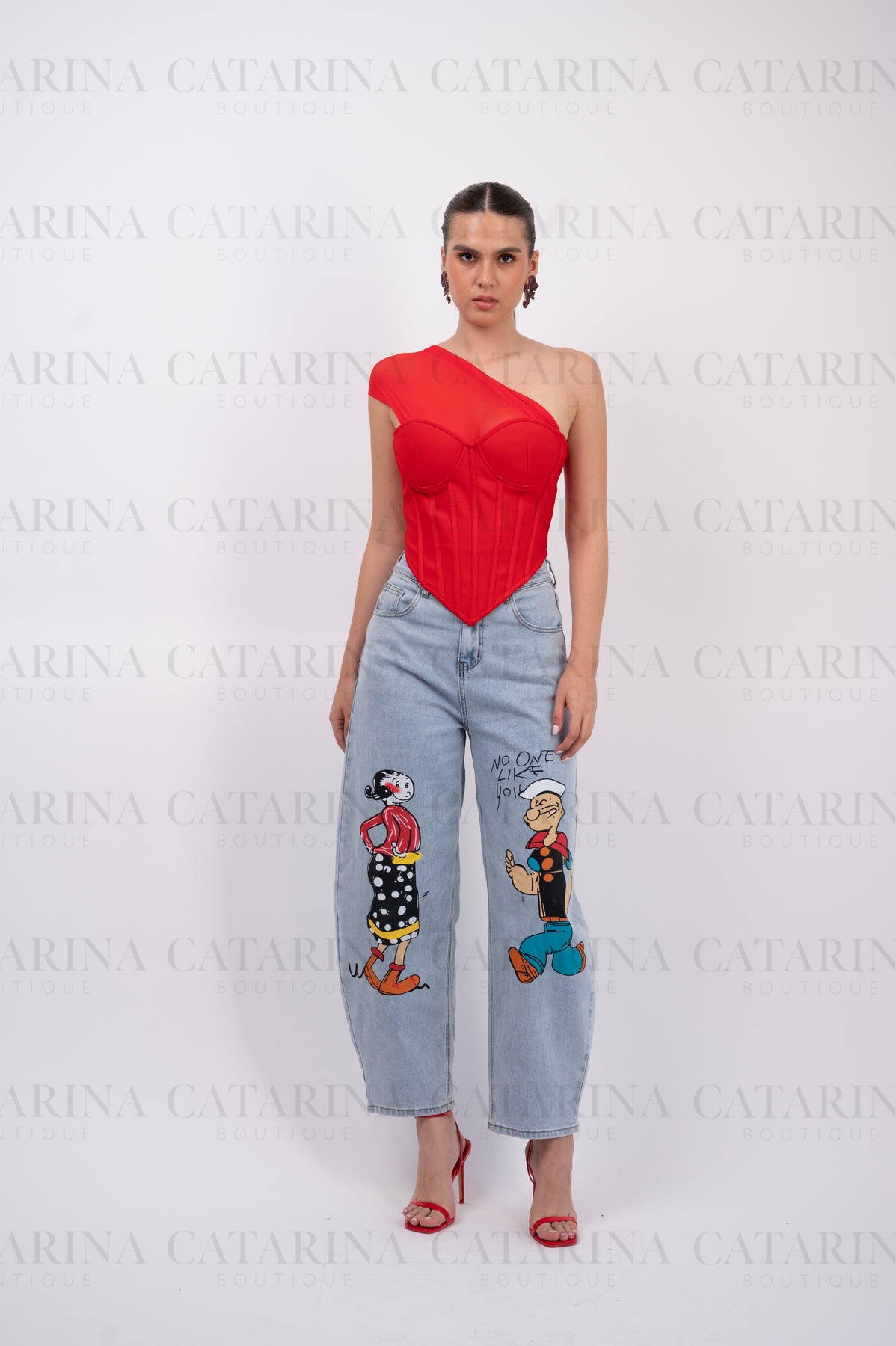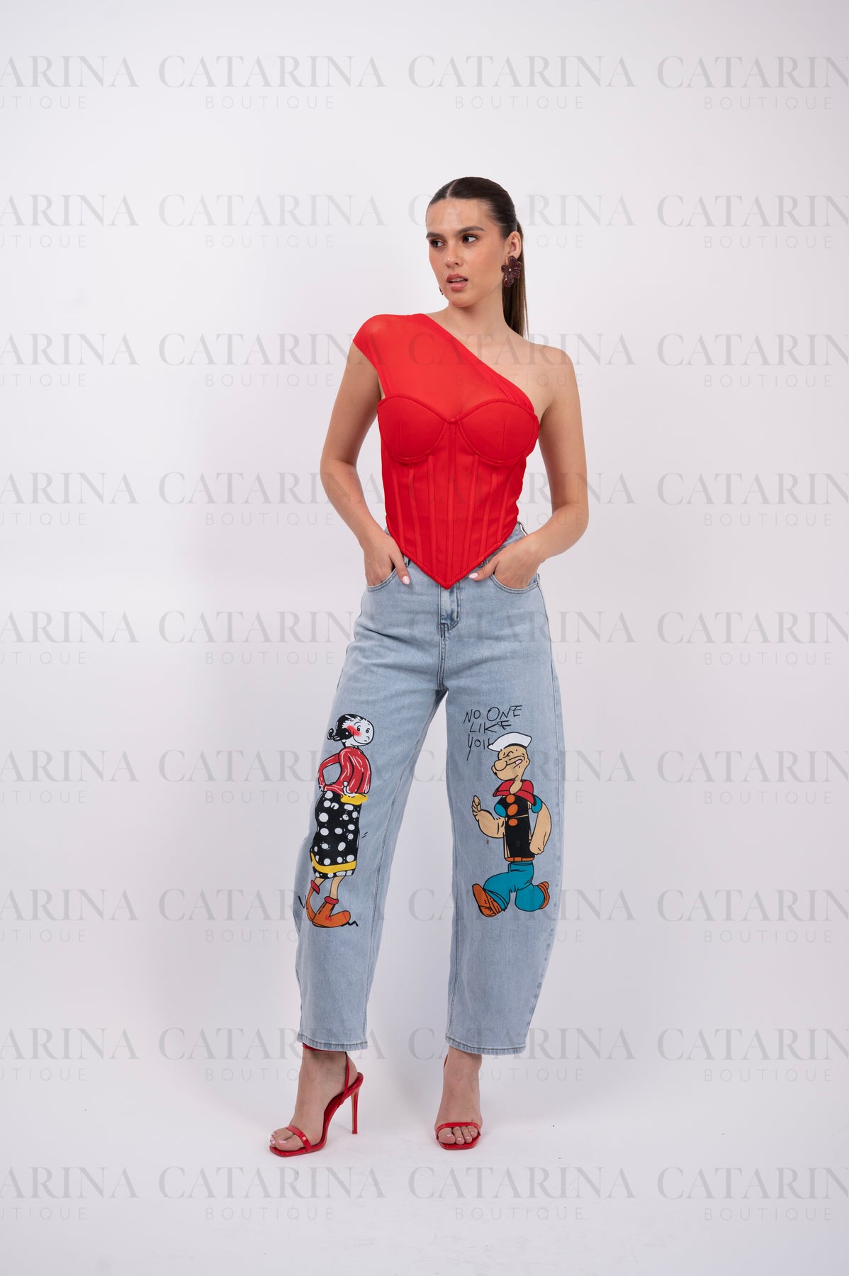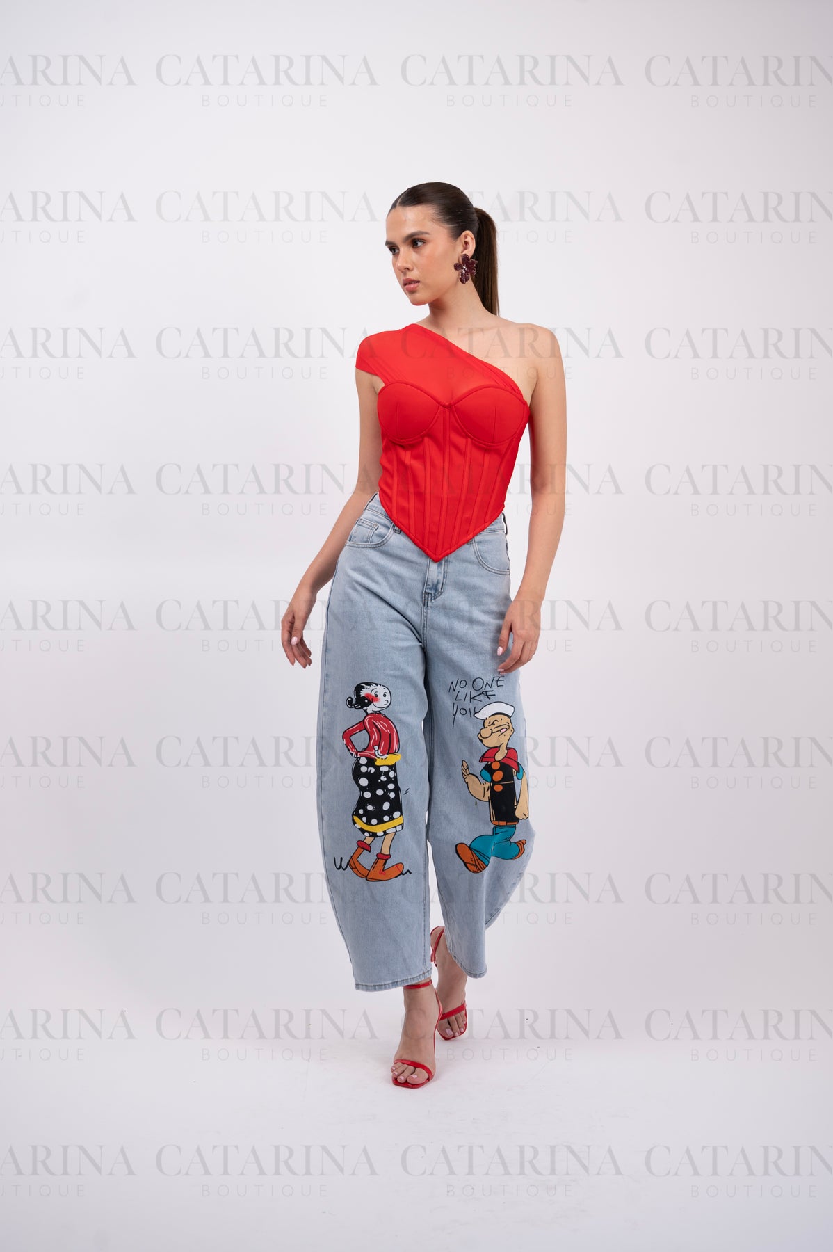 Top de silueta tipo corsé en un vibrante color rojo. Presenta un diseño vanguardista con escote asimétrico con un elegante drapeado en tul sobre uno de los hombros. La estructura frontal cuenta con copas preformadas y varillas verticales que definen y estilizan la cintura, terminando en un acabado en punta que aporta un toque moderno y seductor.