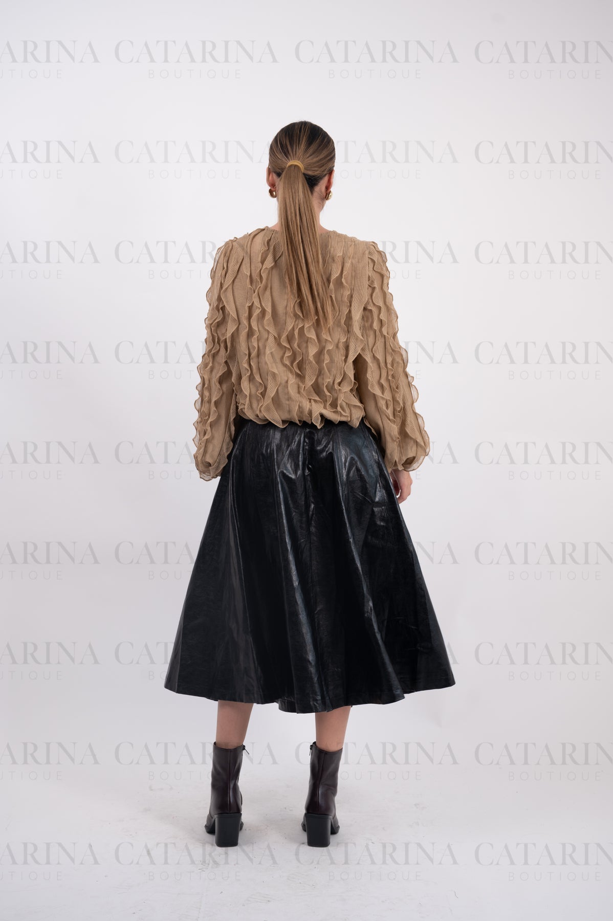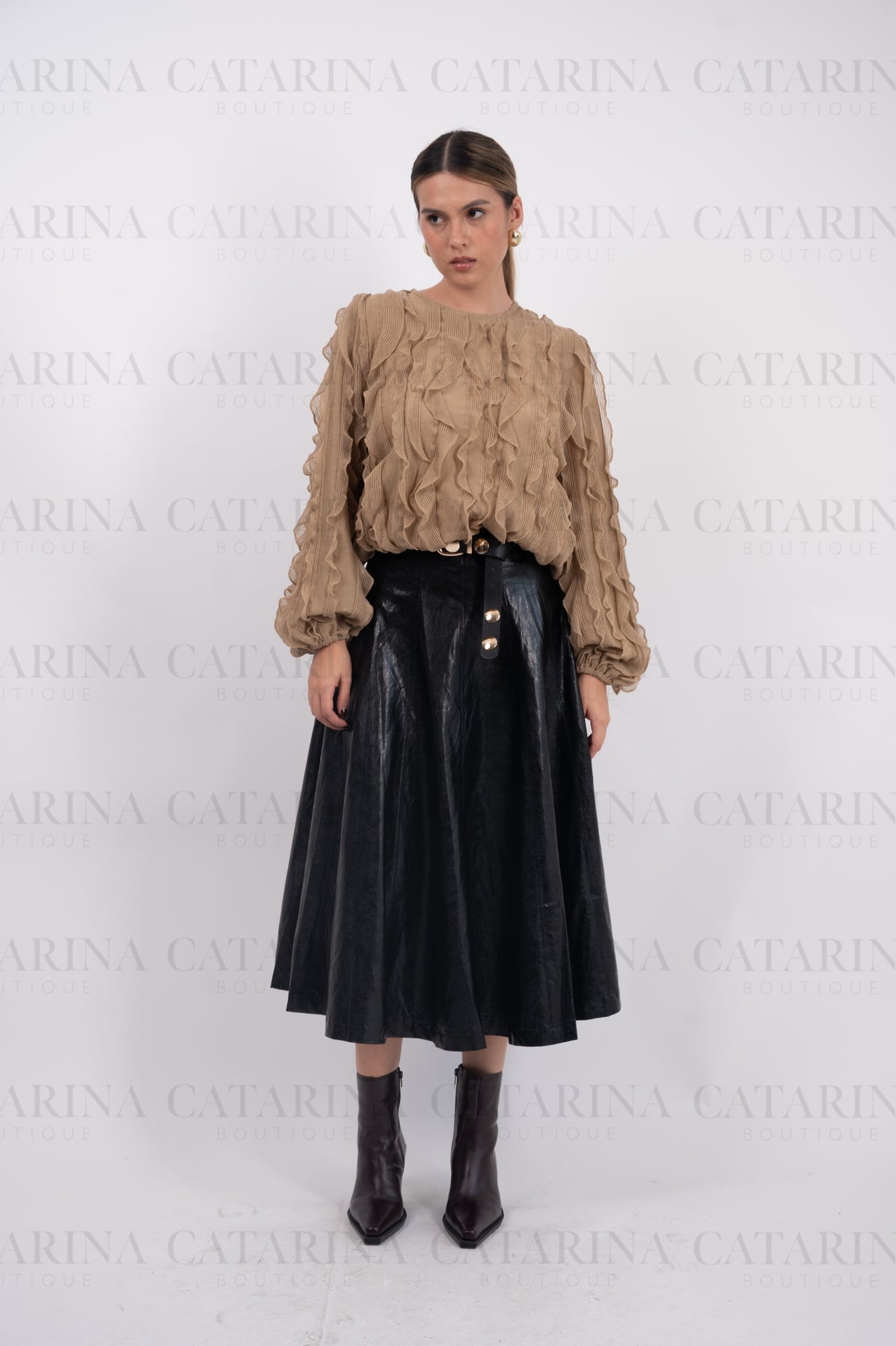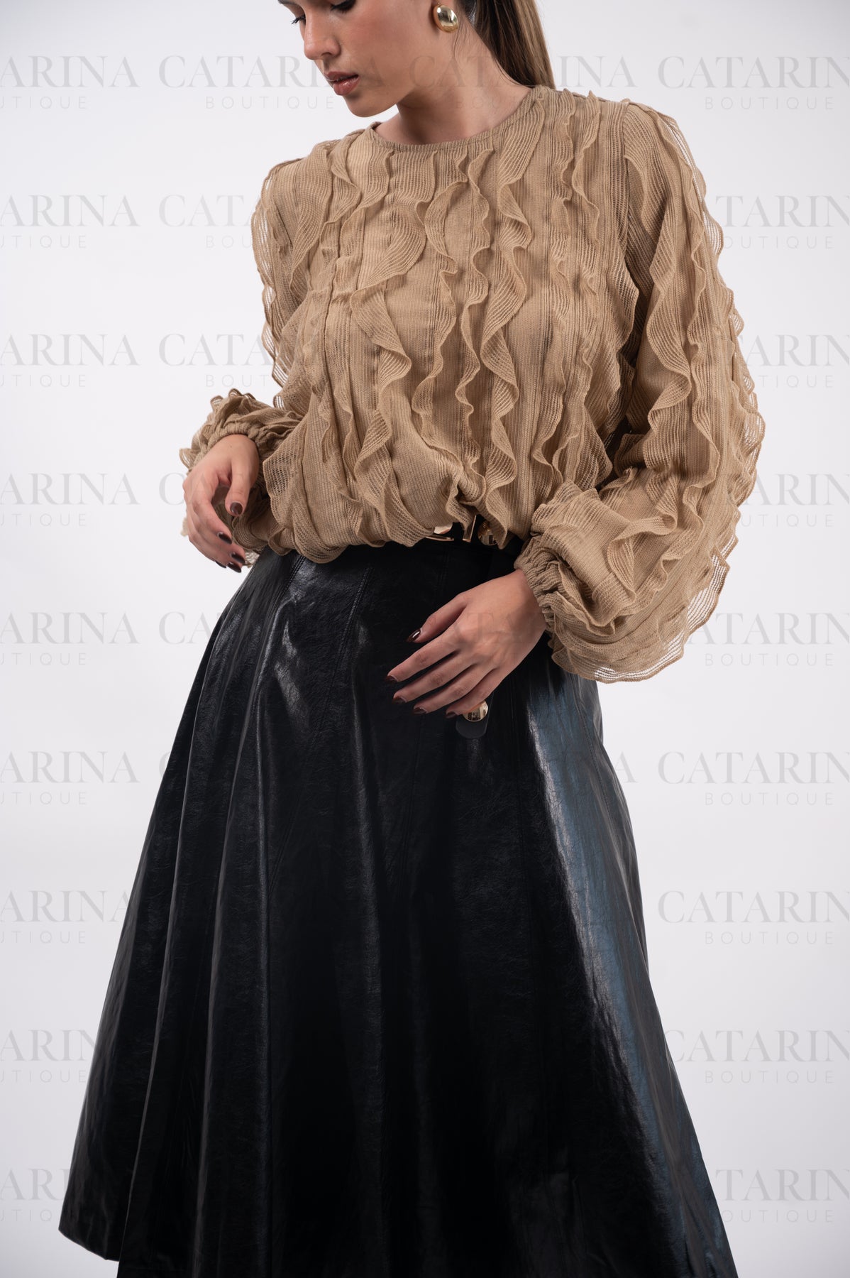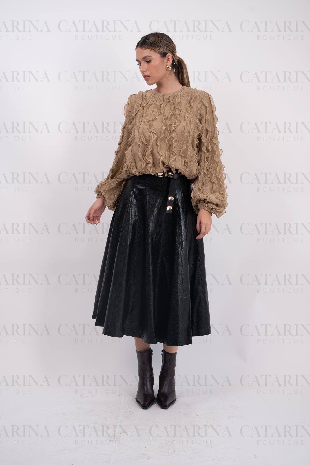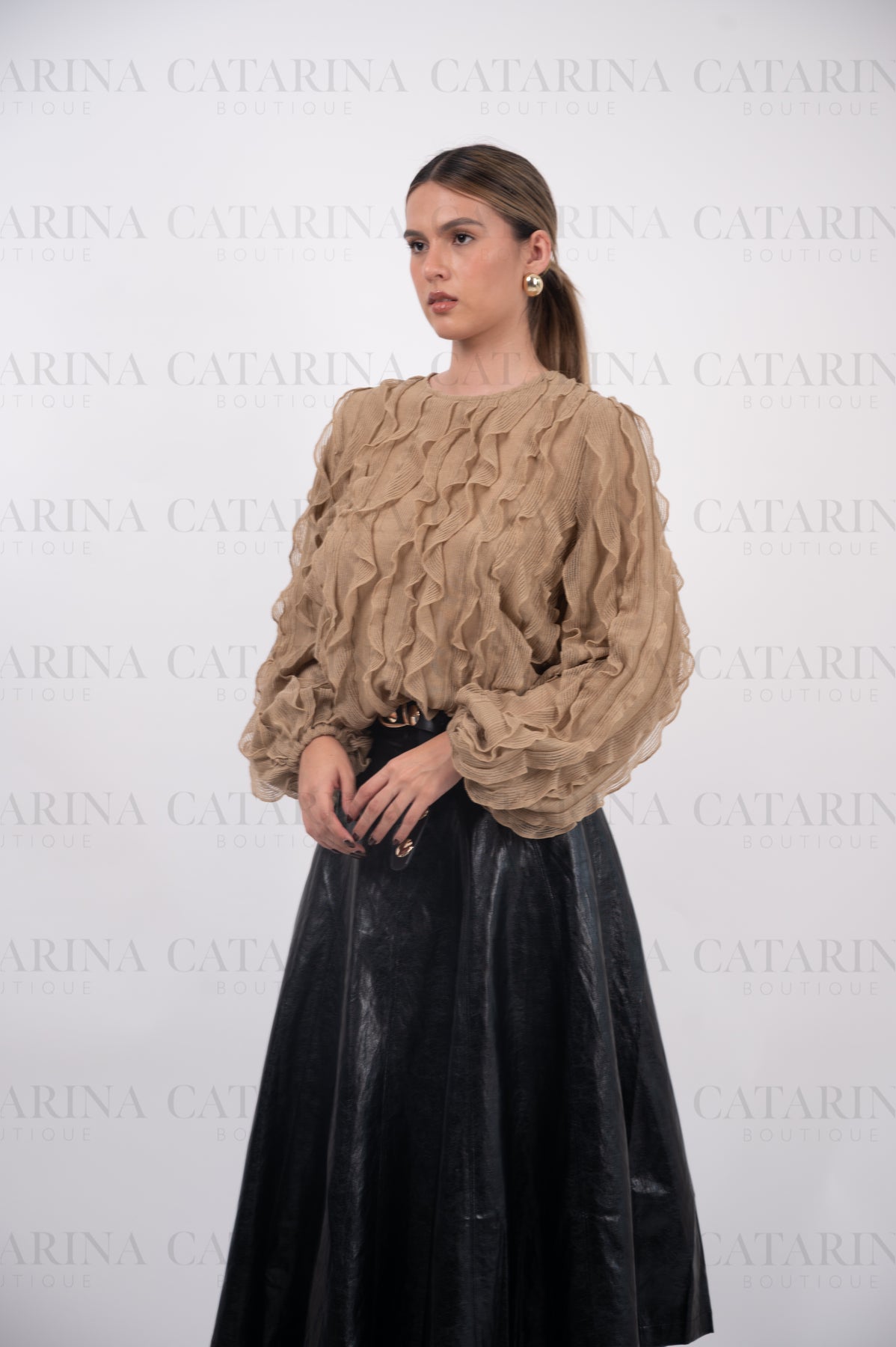 Camisa manga larga. Cuello tipo americano. Botones y olanes al frente. Bajo acabado recto.