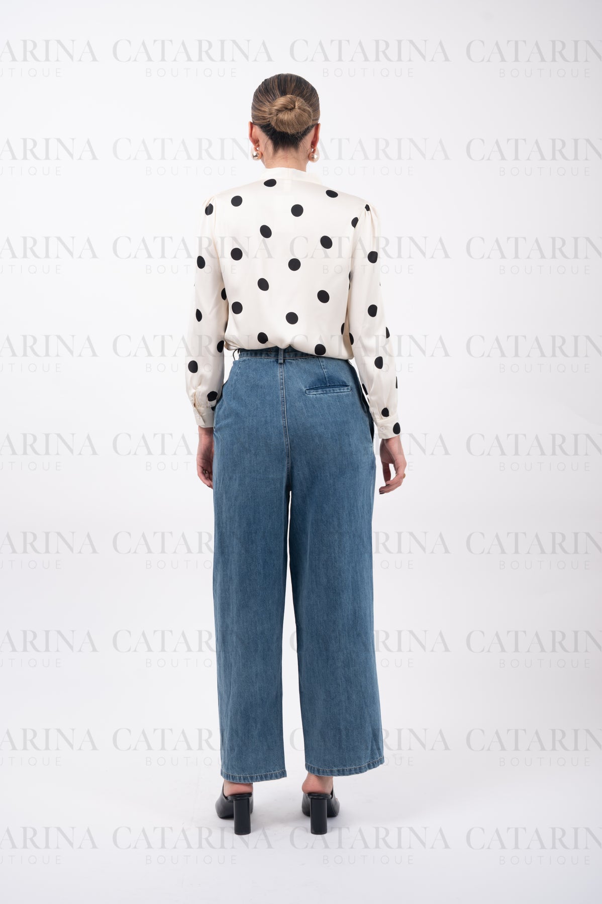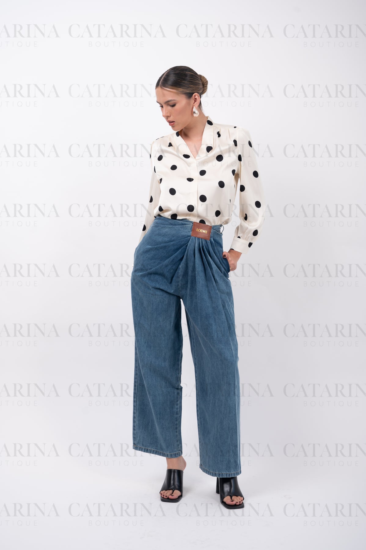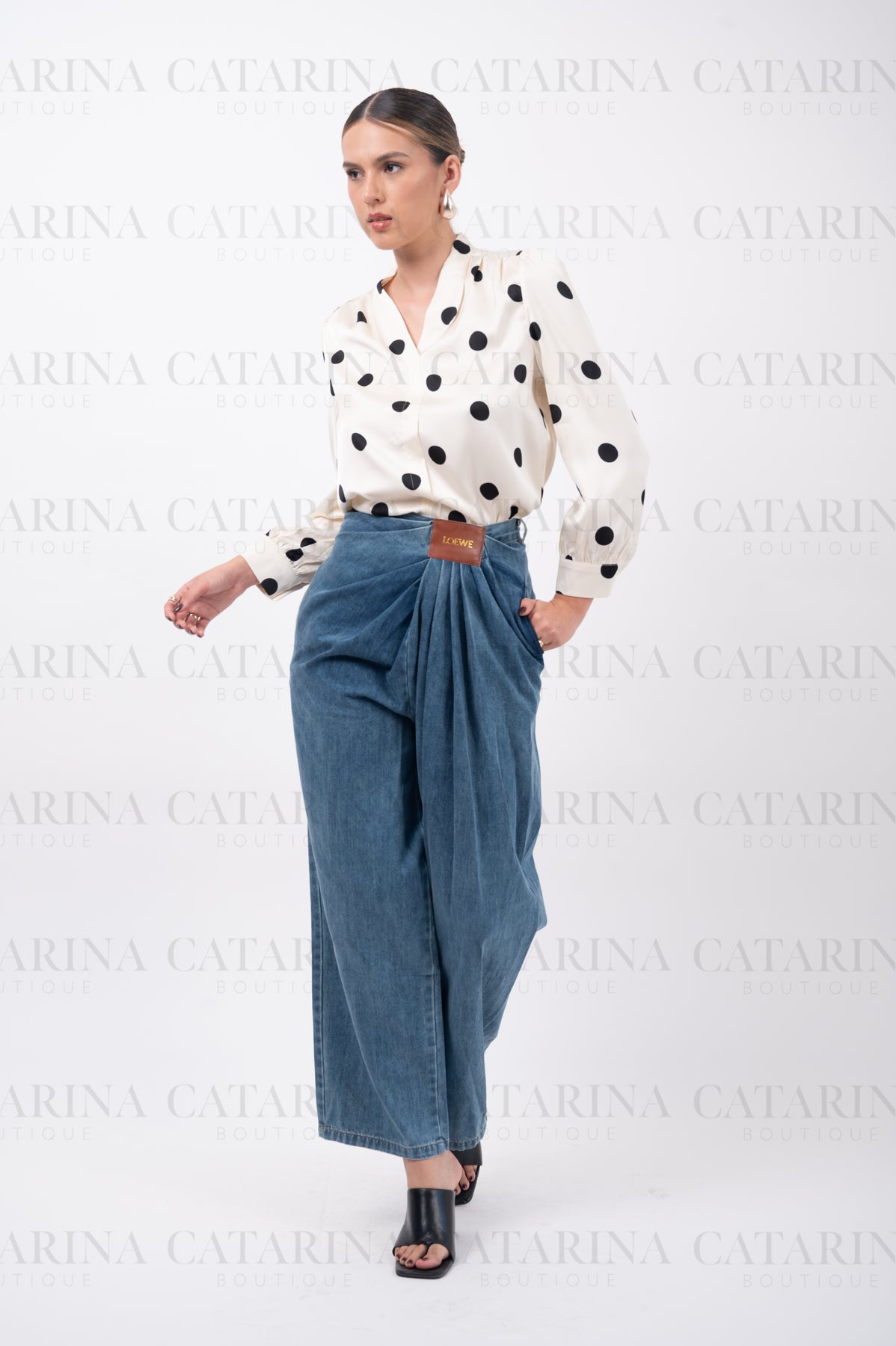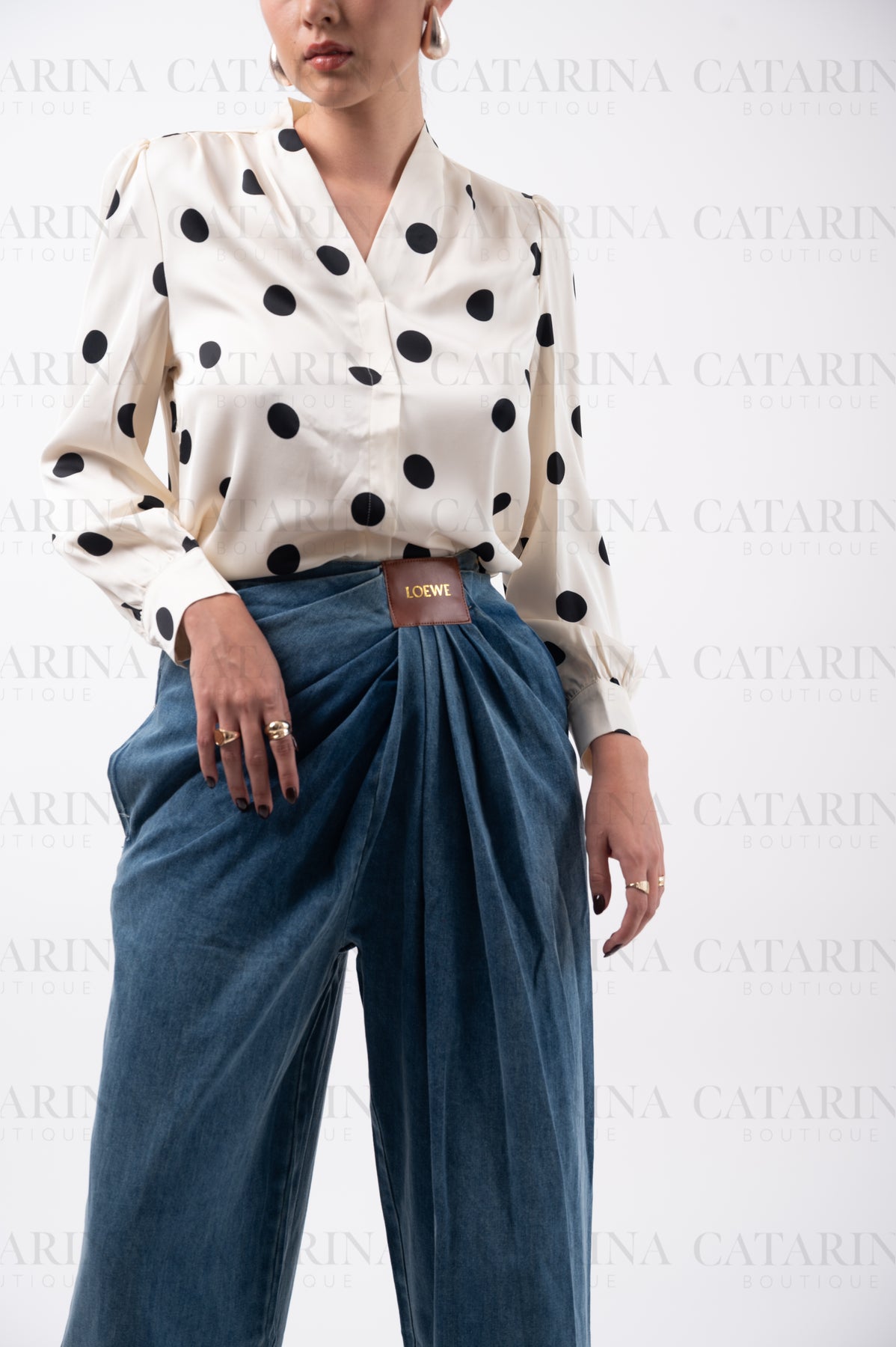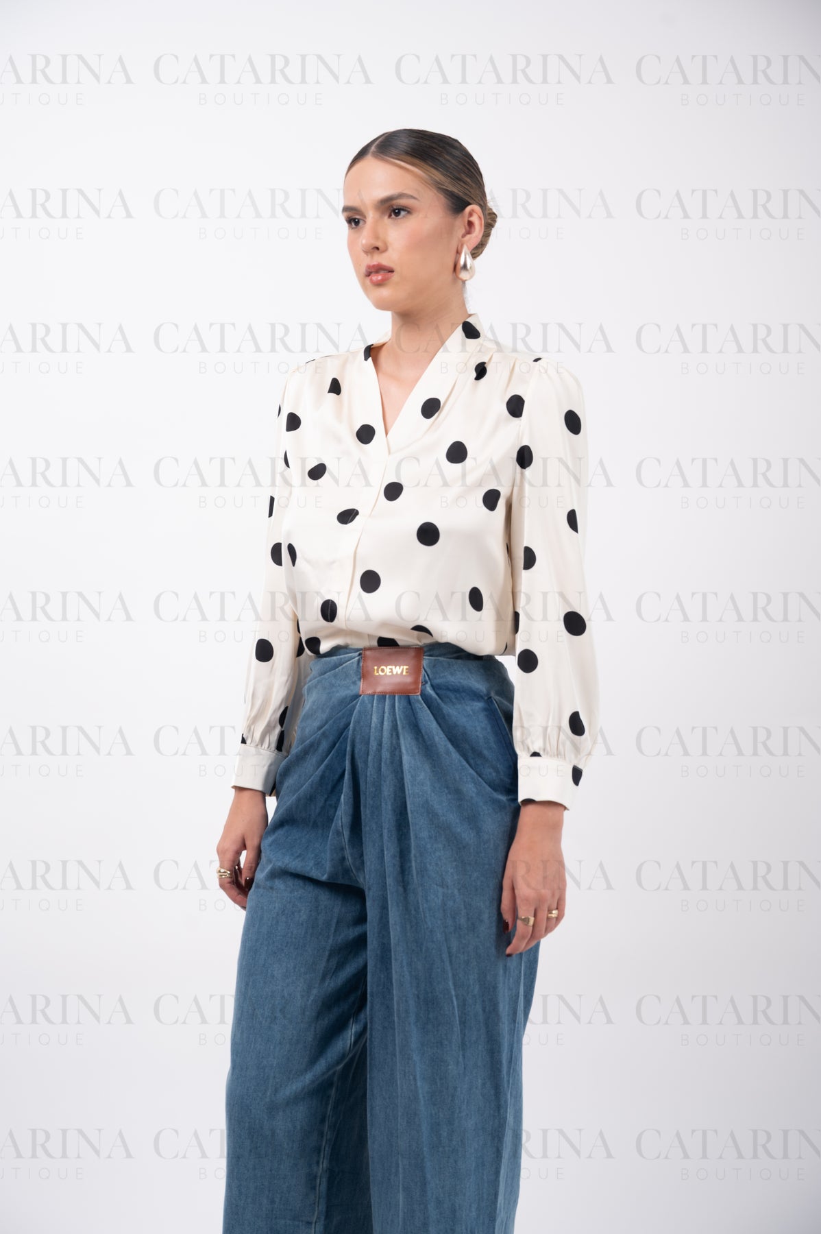Camisa manga larga. Cuello en v. Botones al frente. Bajo acabado recto. Detalle de estampado boleado.