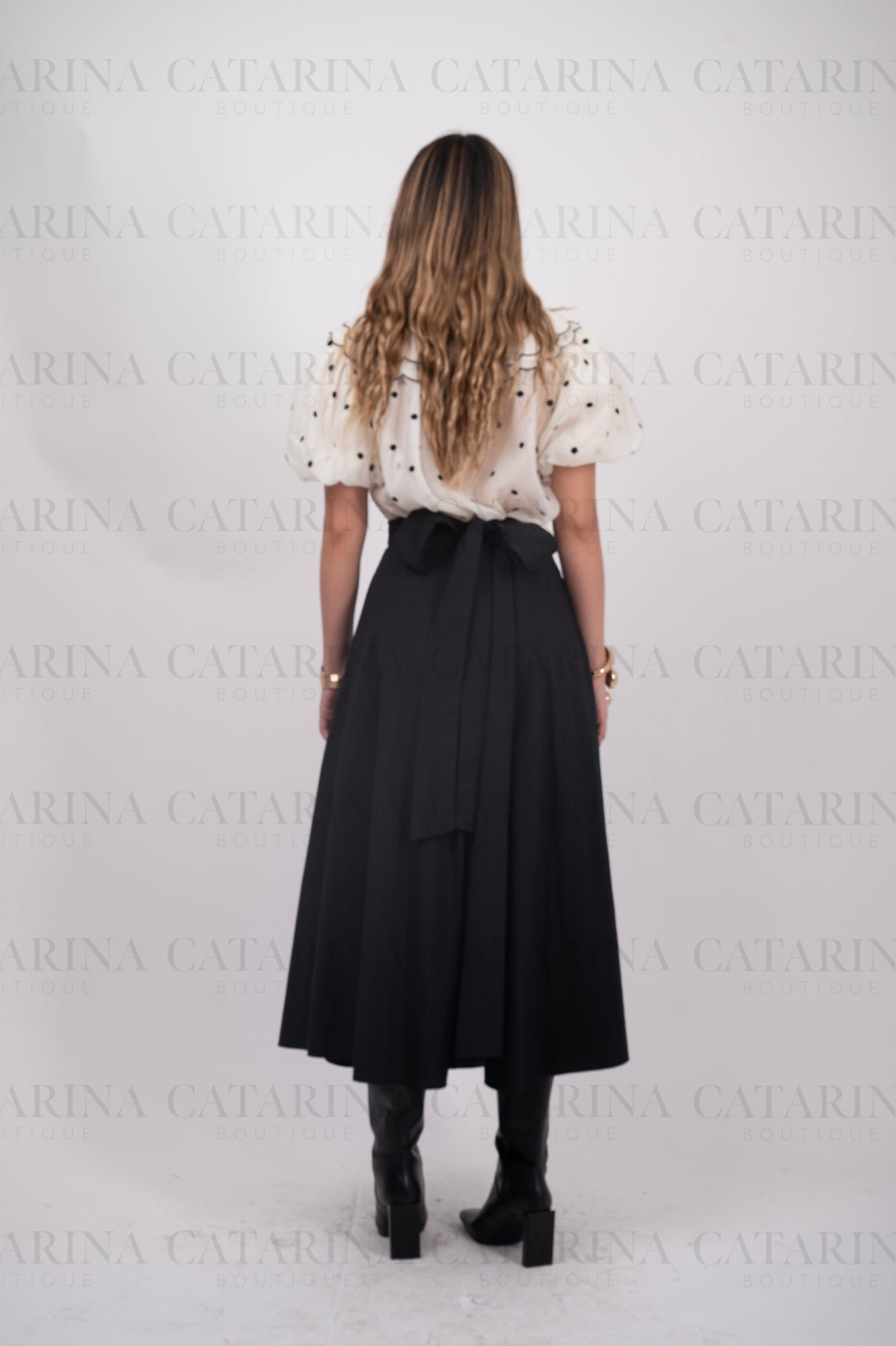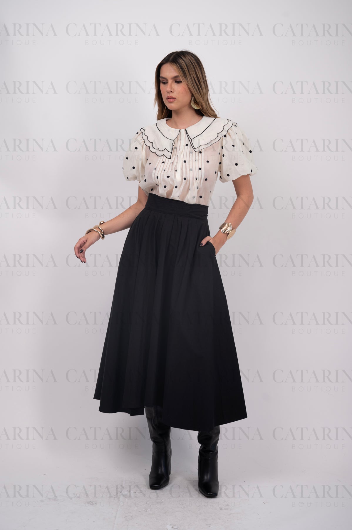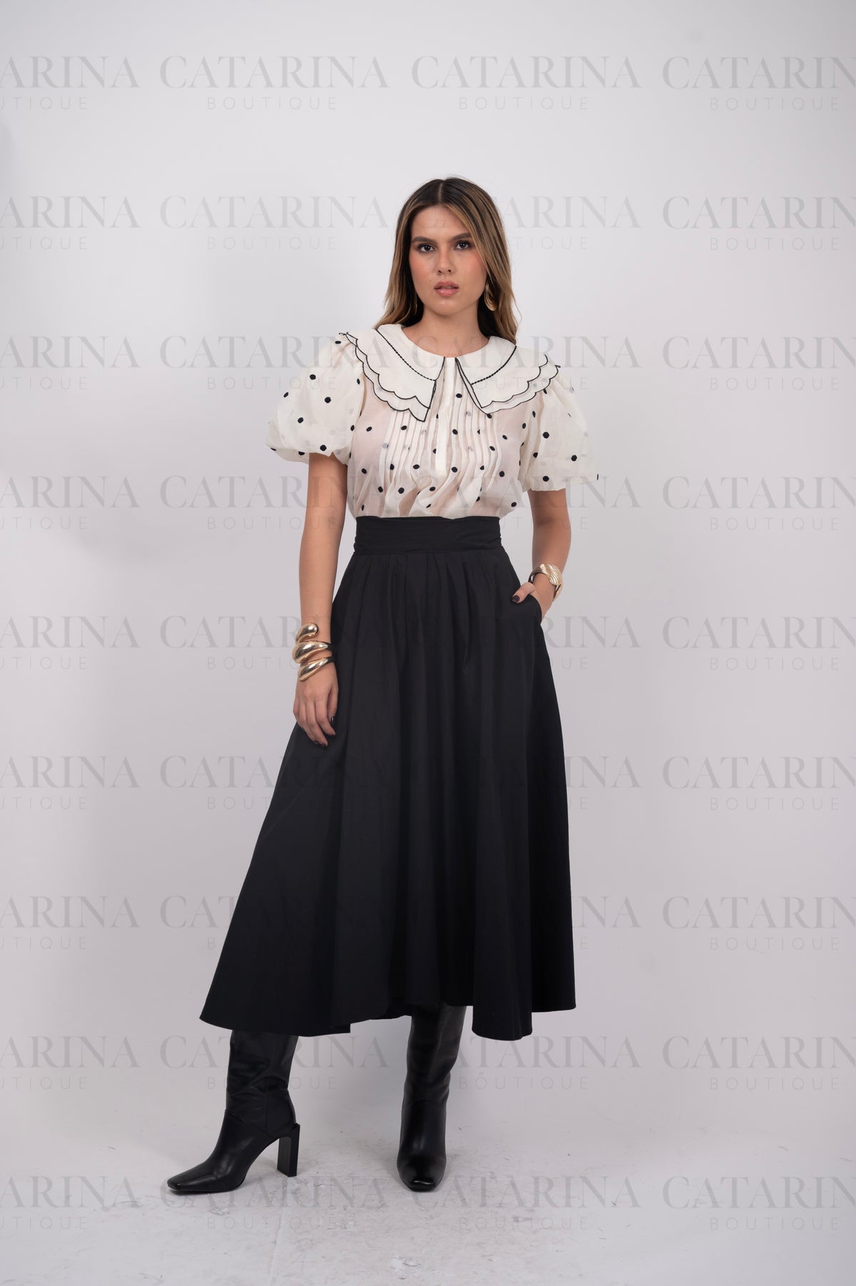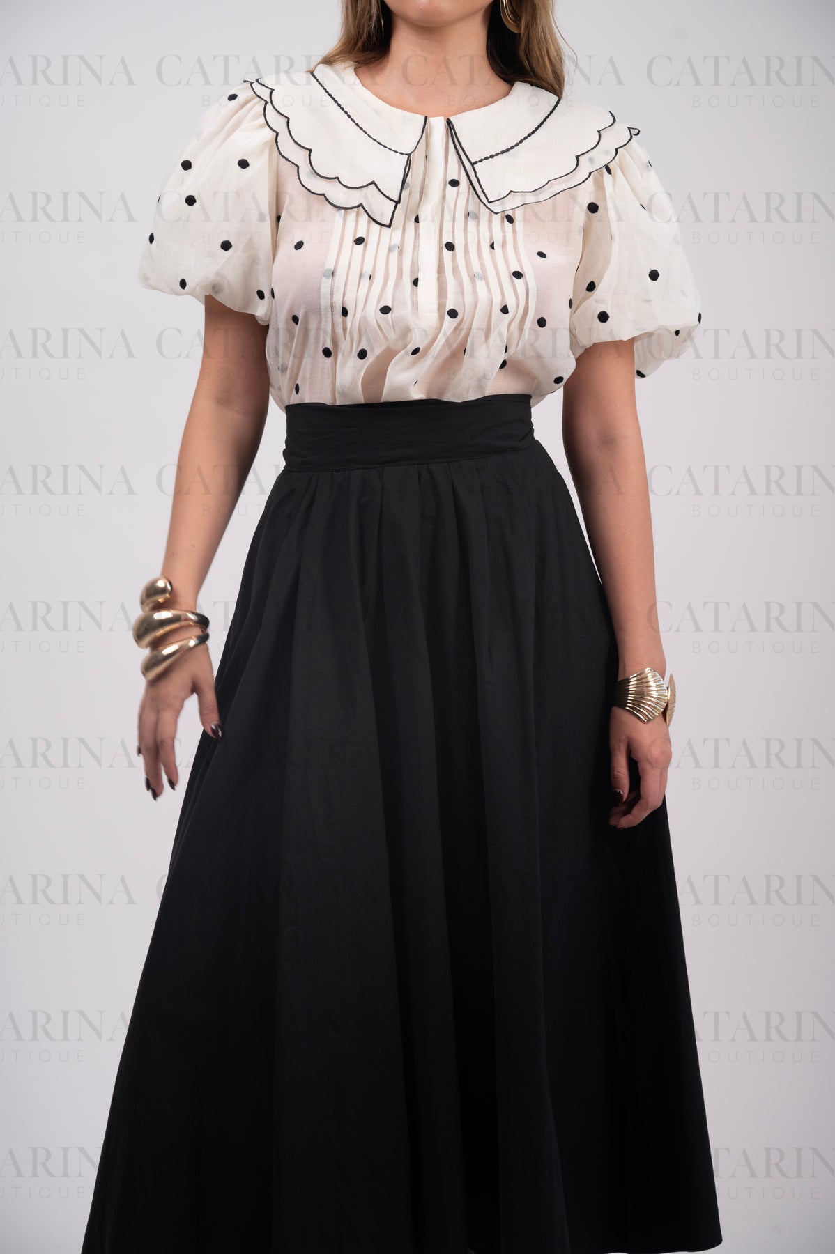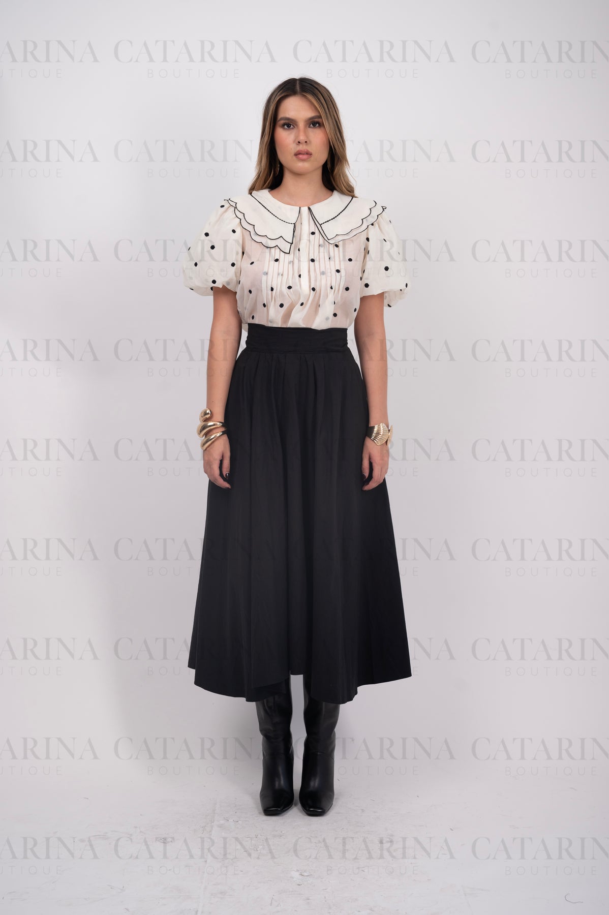 Blusa de corte suelto y fluido. Print de lunares negros. Cuello tipo Peter Pan con bordes ondulados y un ribete negro que lo enmarca. Escote redondo con una pequeña abertura en V. Mangas cortas y abullonadas.