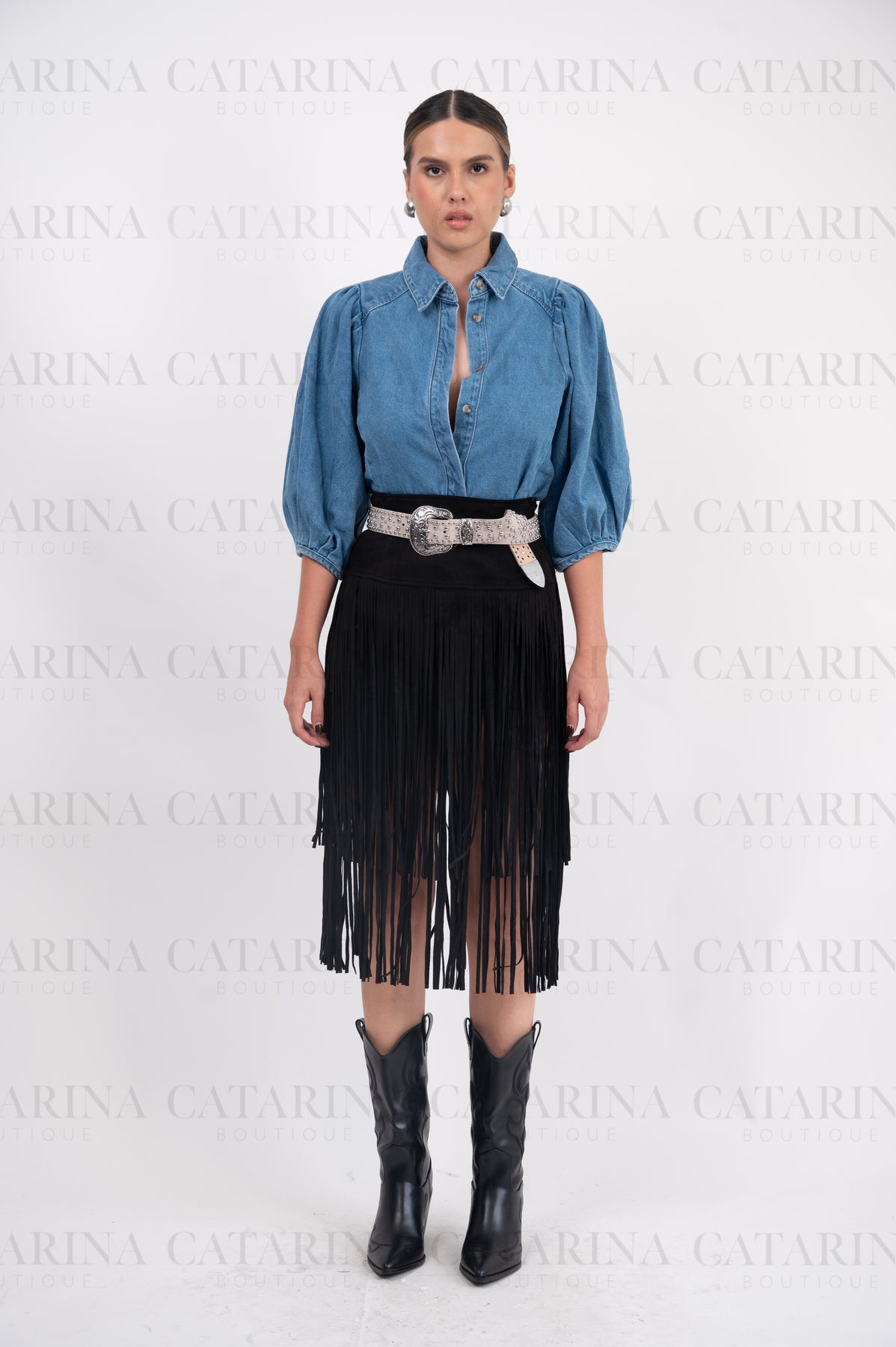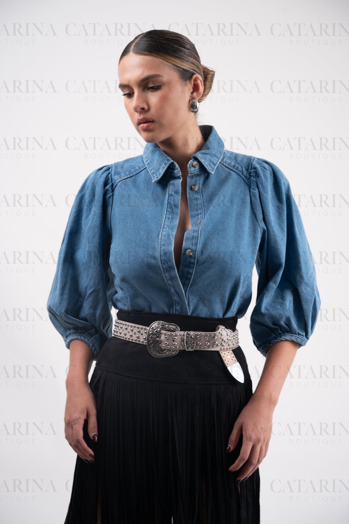 Camisa manga larga abullonada. Cuello tipo americano. Botones al frente. Bajo acabado recto.