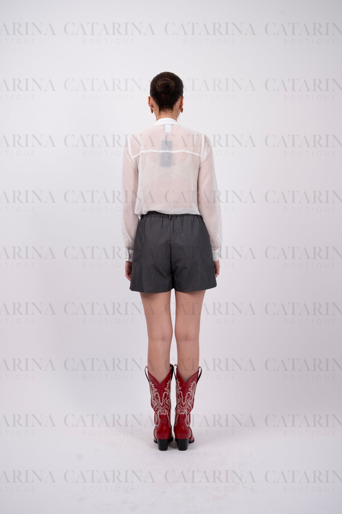 Camisa manga larga. Cuello redondo. Botones al frente. Bajo acabado recto.