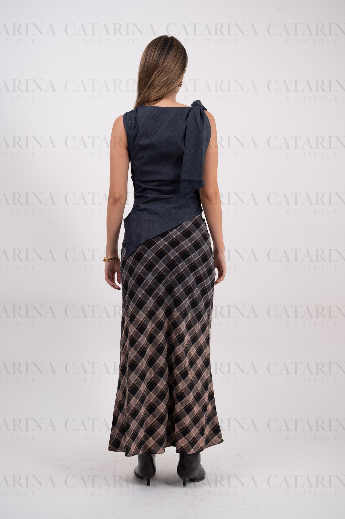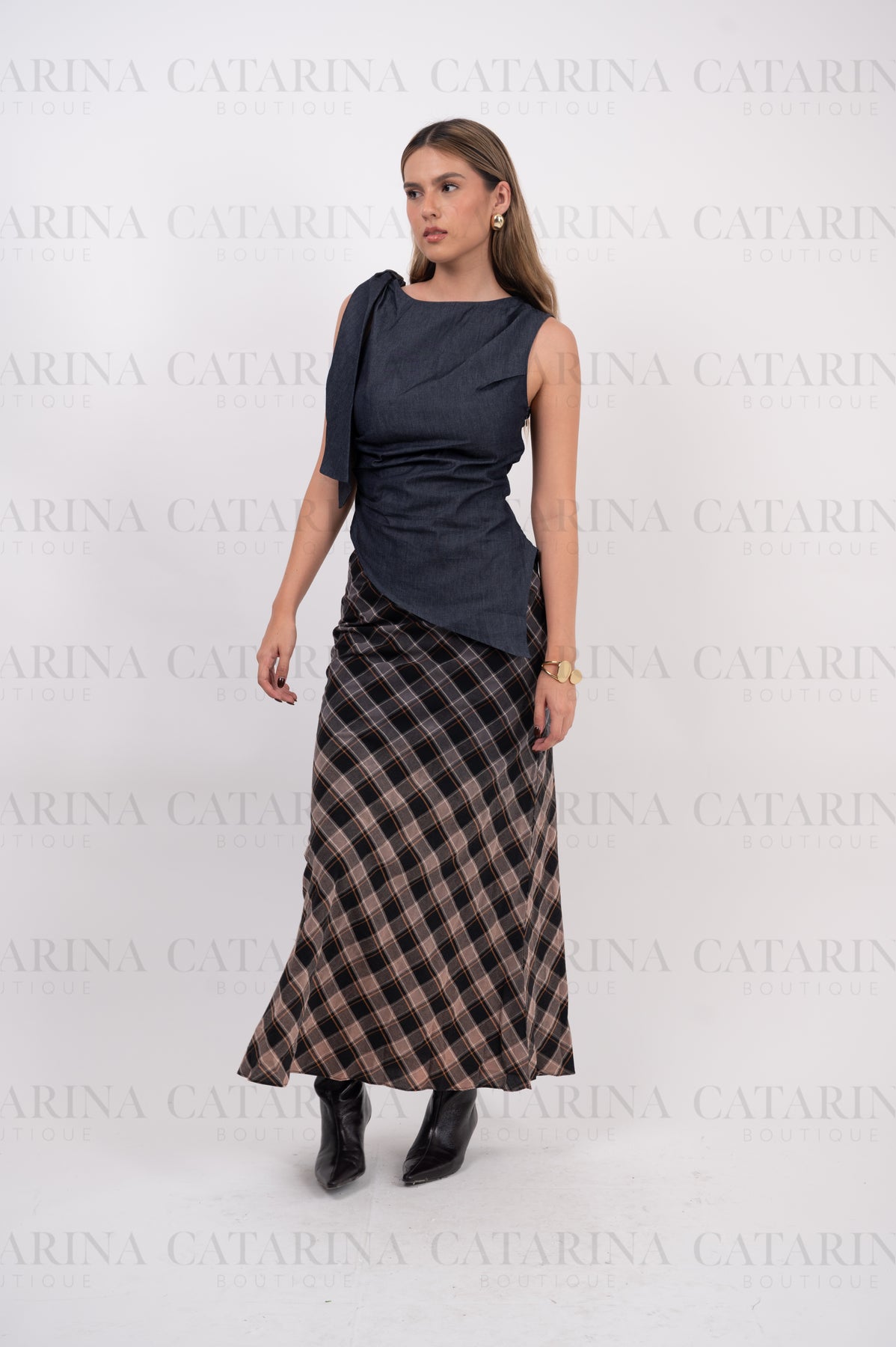 Blusa de color liso. Escote redondo. Bajo acabado asimétrico. Detalle de lazadas e ilusión de nudo en hombro.