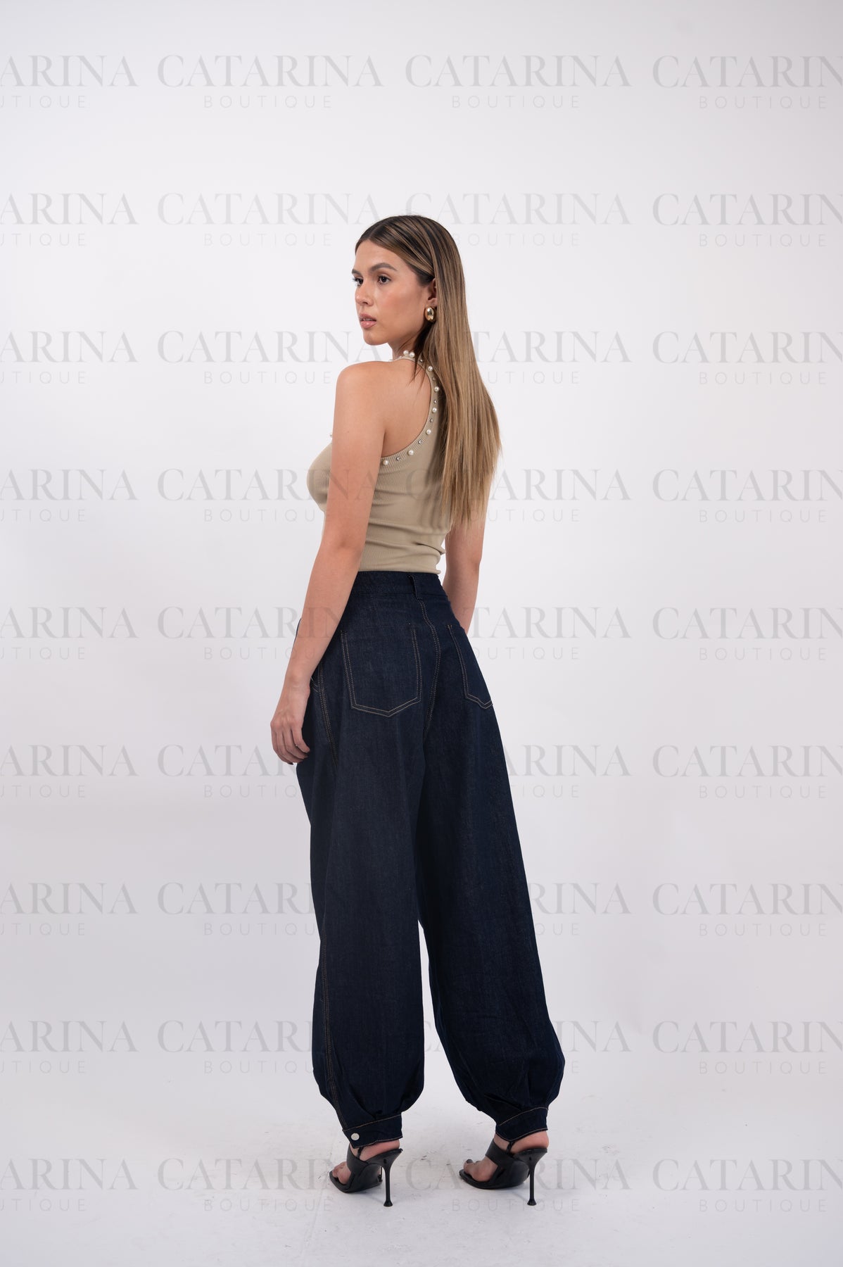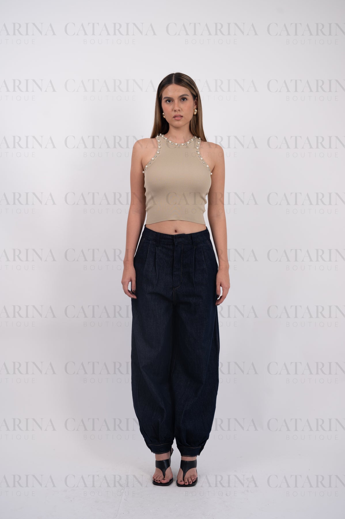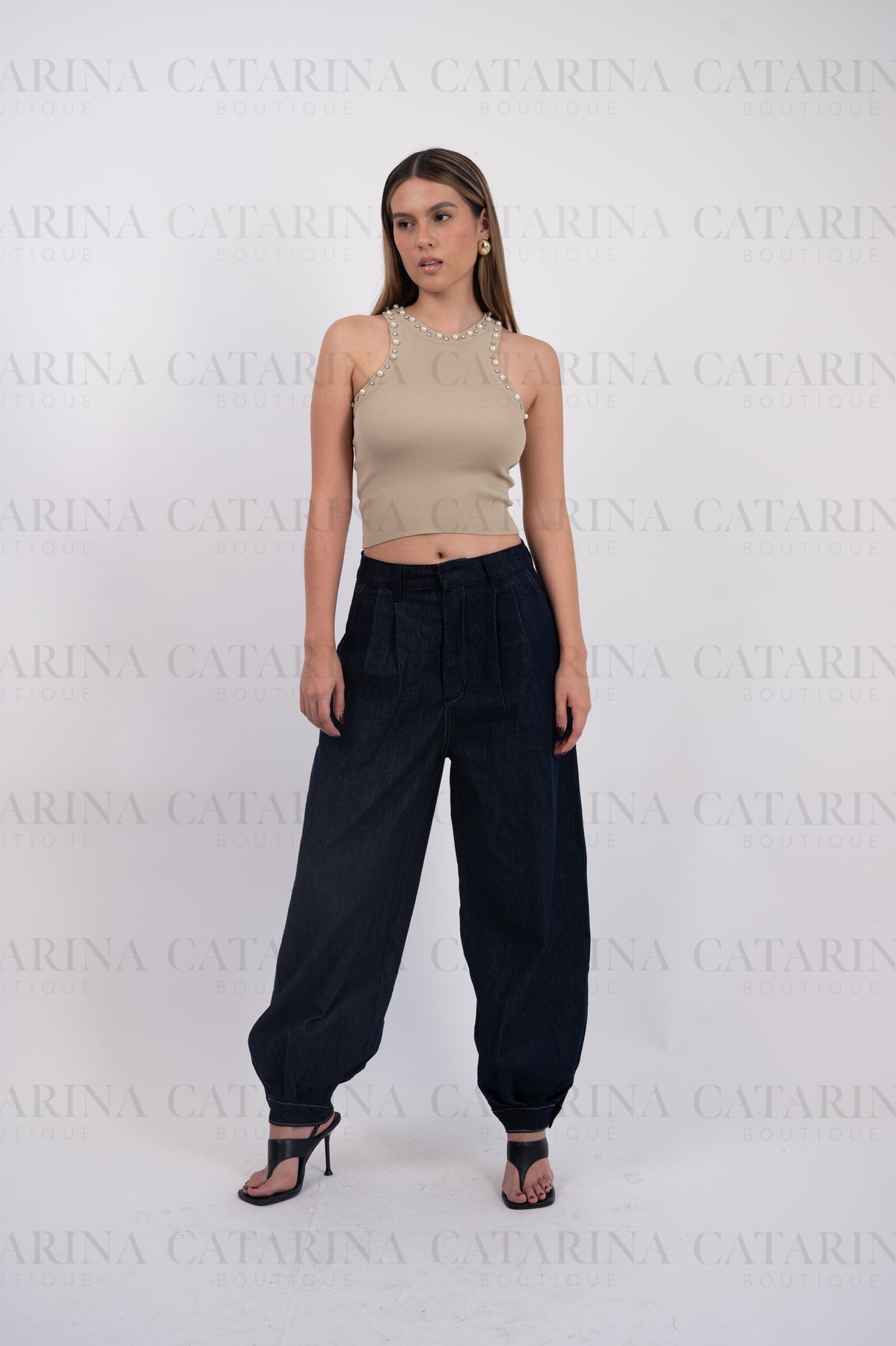Blusa de color liso. Manga tipo sisa. Escote redondo. Detalle de perlas y pedrería.