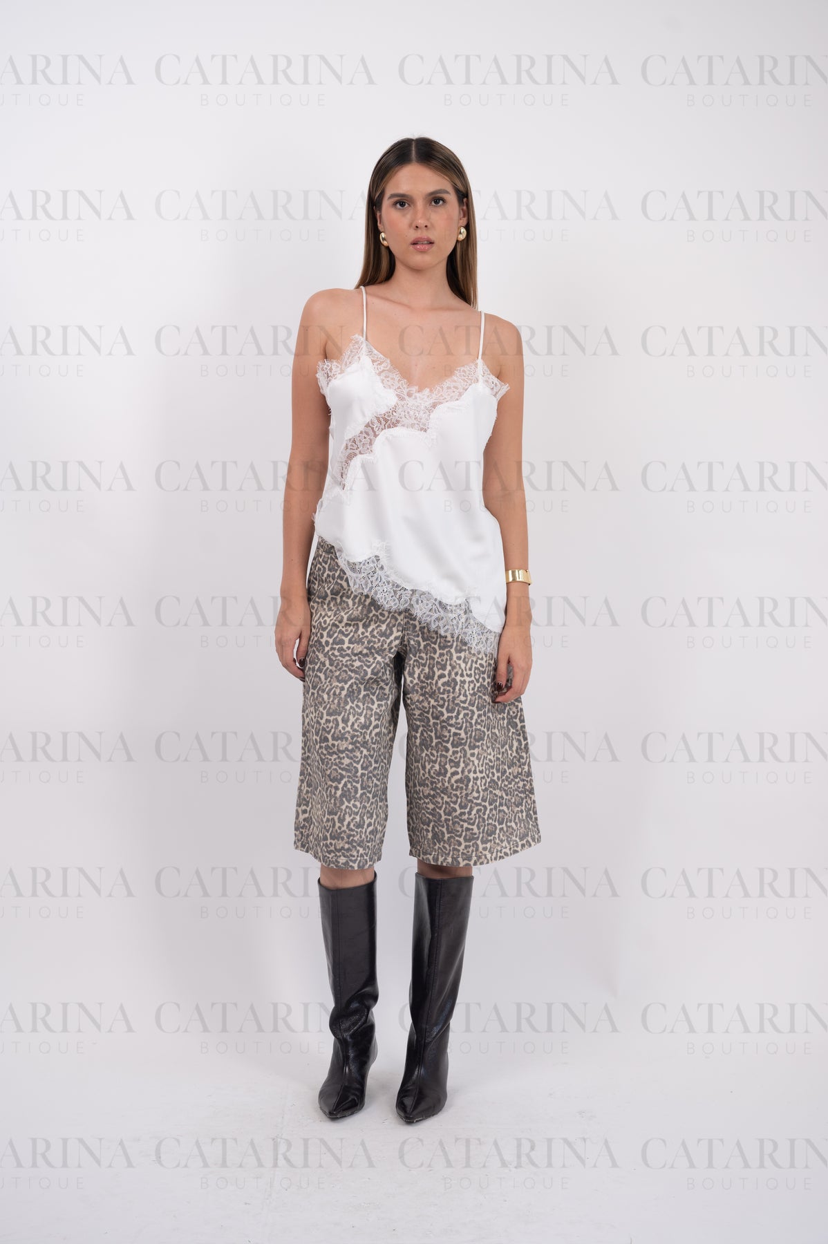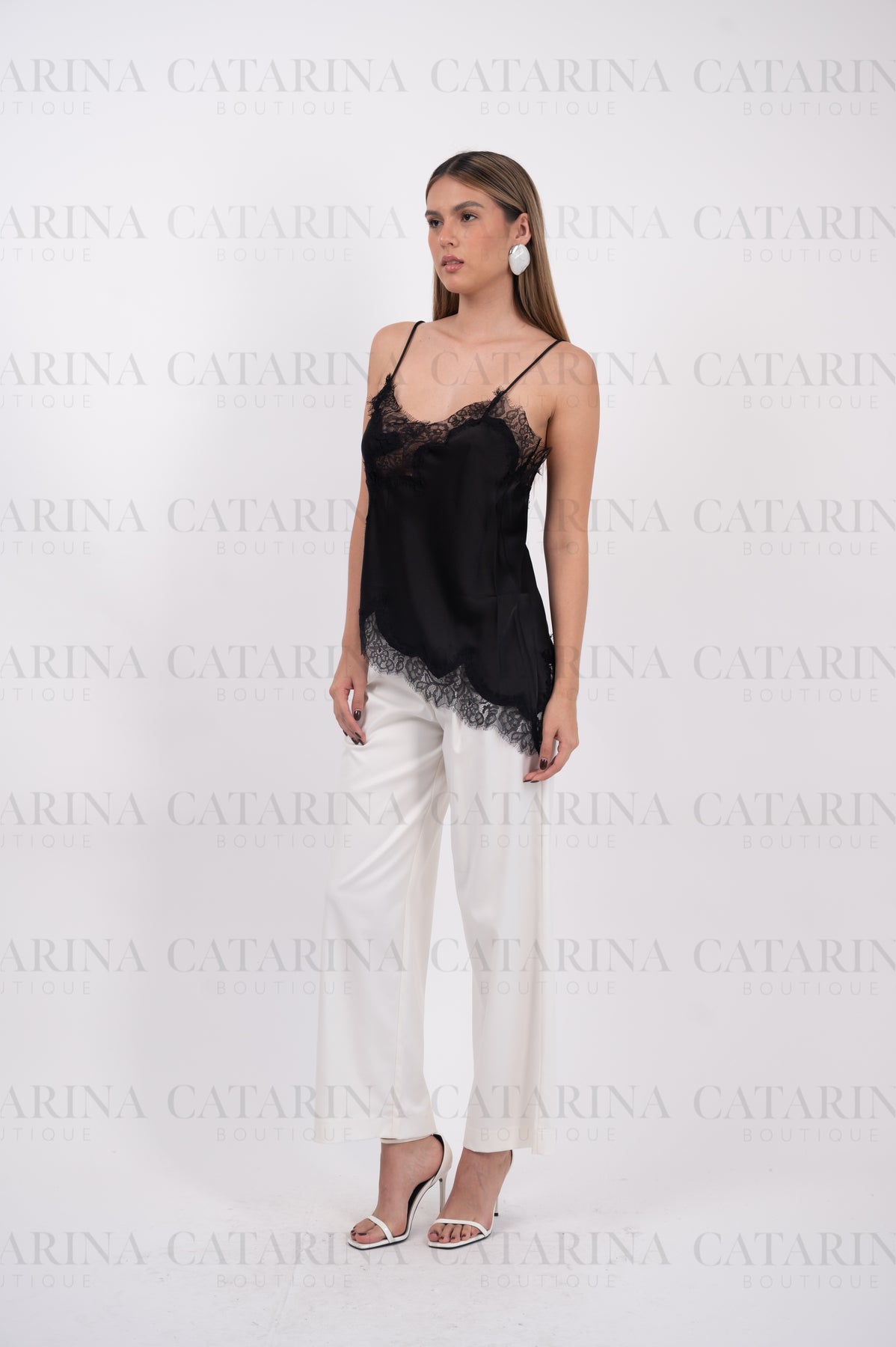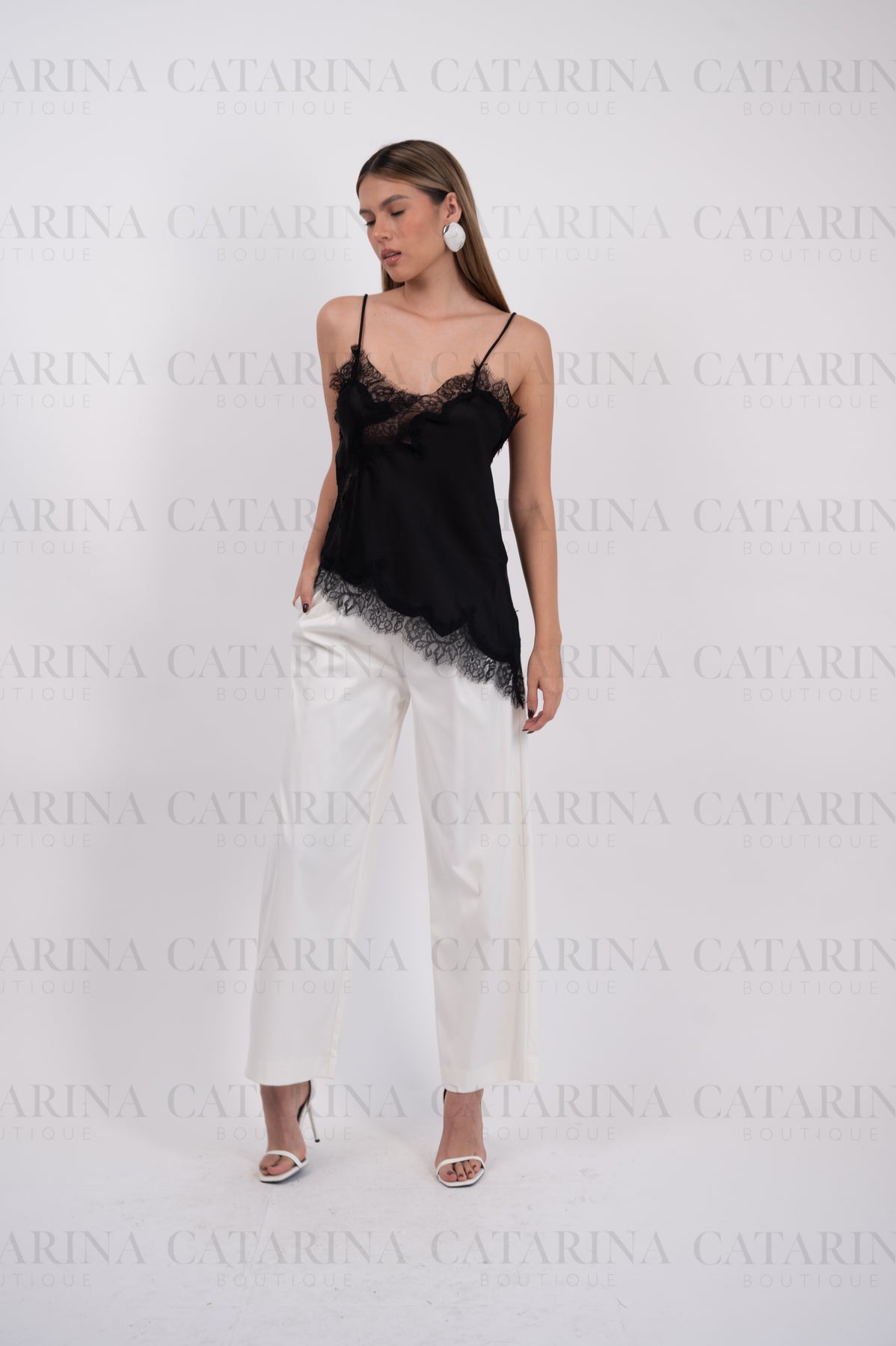 Blusa lisa de tirantes delgados. Escote con detalle de encaje. Bajo acabado asimétrico.