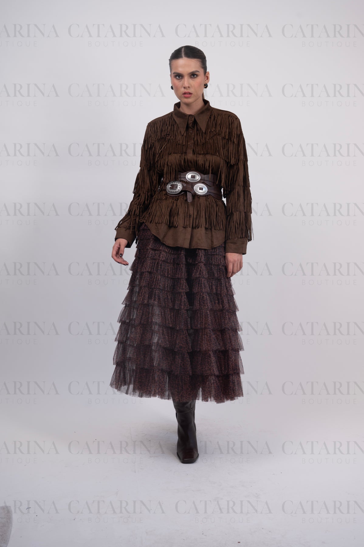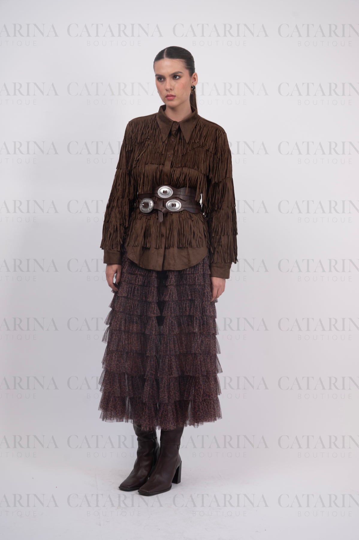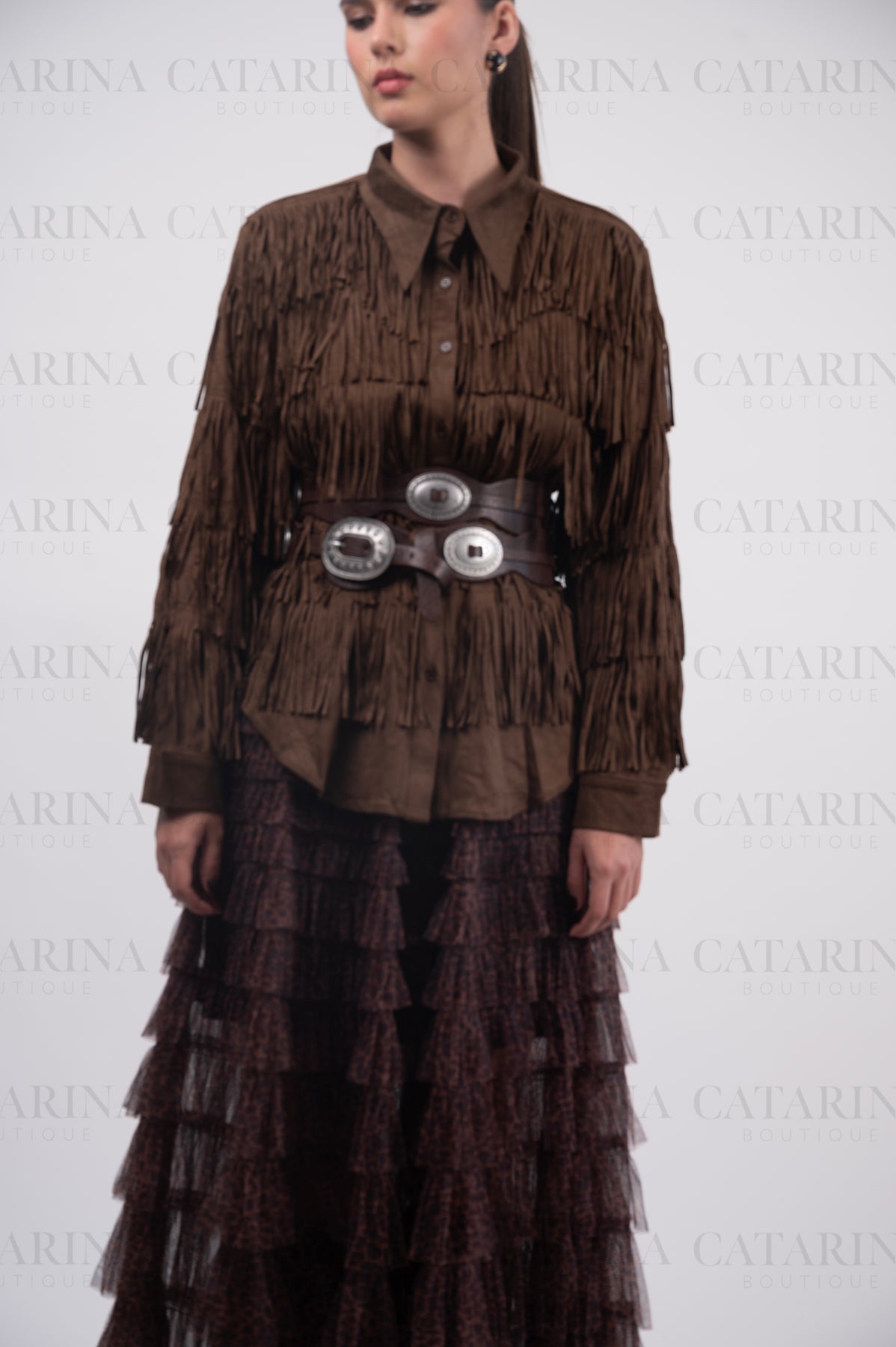 Camisa manga larga. Cuello tipo americano. Botones al frente. Bajo acabado recto. Detalle de flequillos.