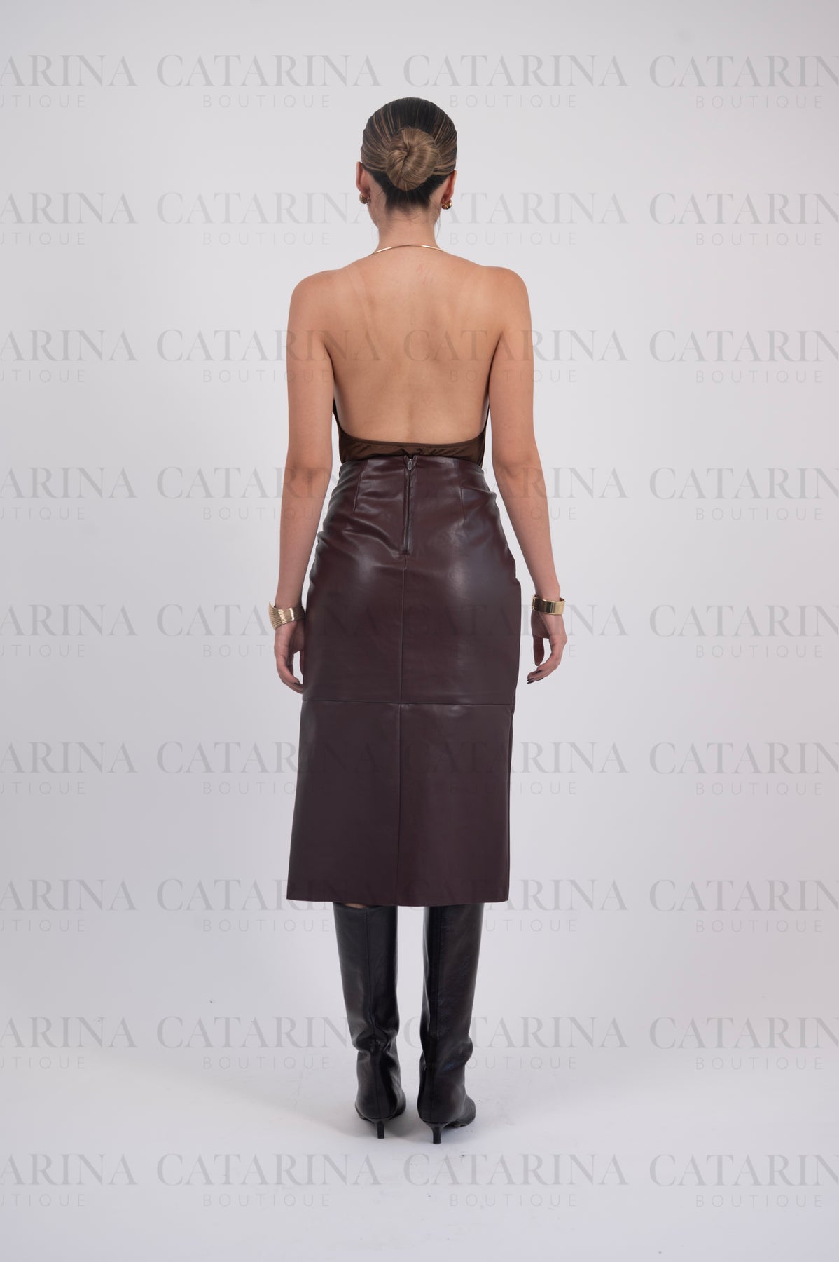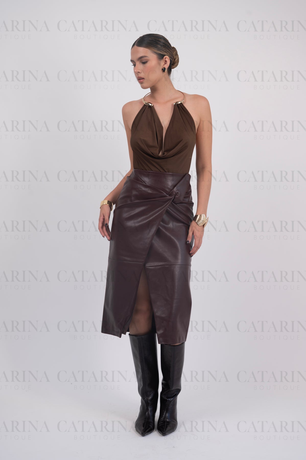 Pantiblusa de escote drapeado. Collar rígido y metálico de color dorado.
