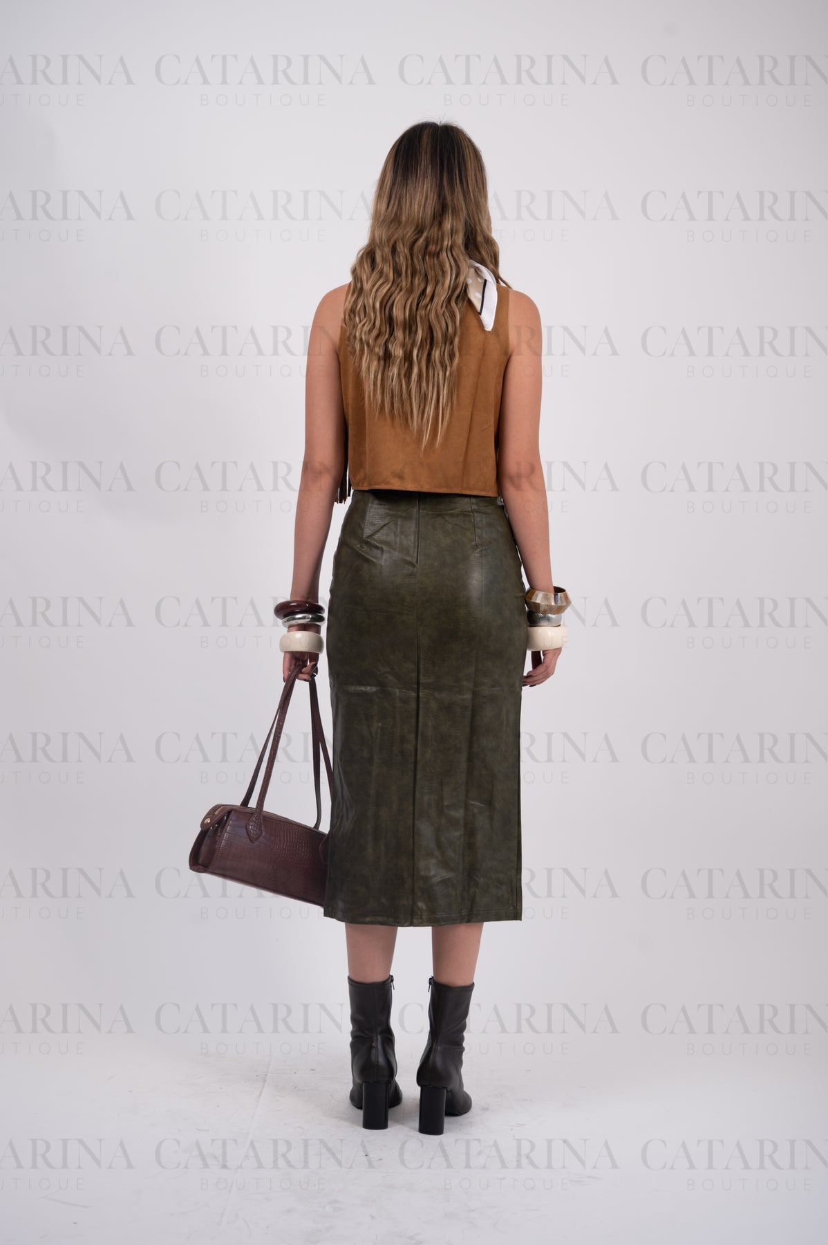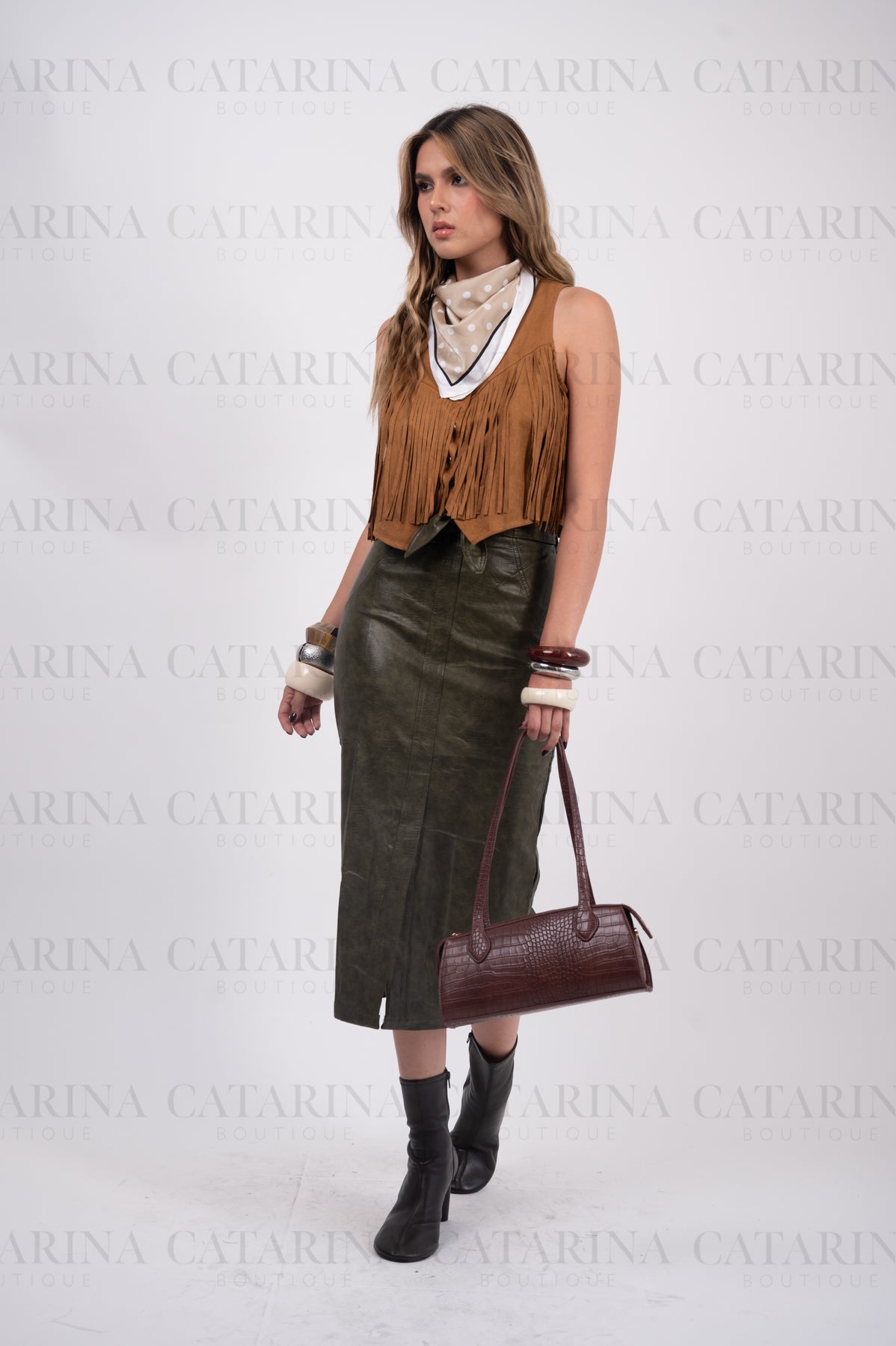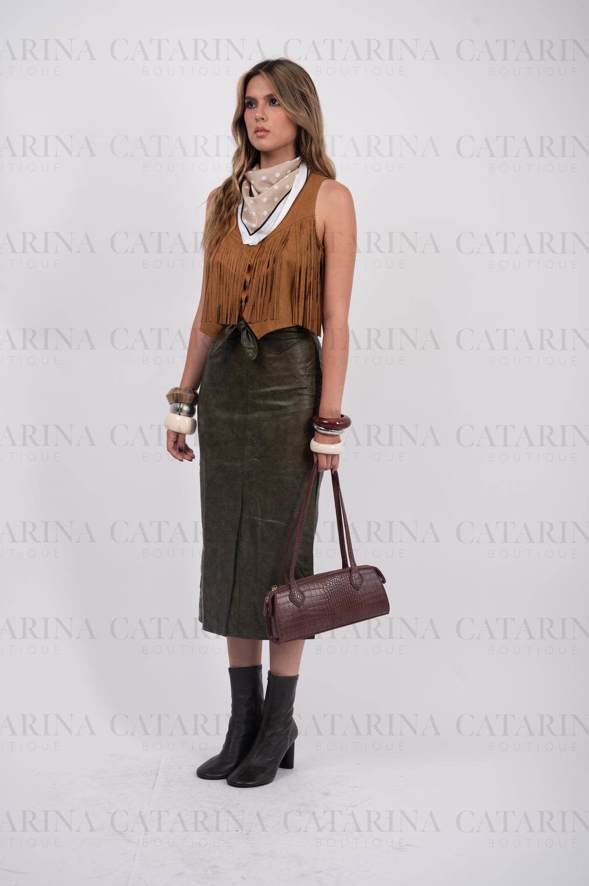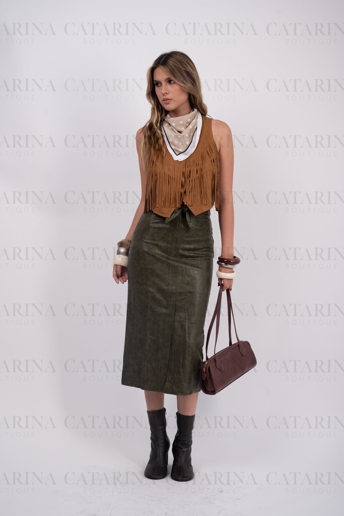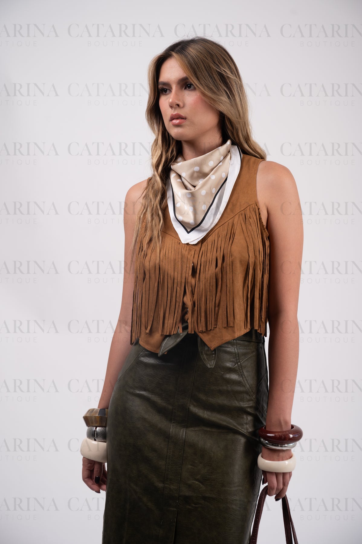 Chaleco vaquero. Detalle de flequillos sueltos. Manga tipo sisa.