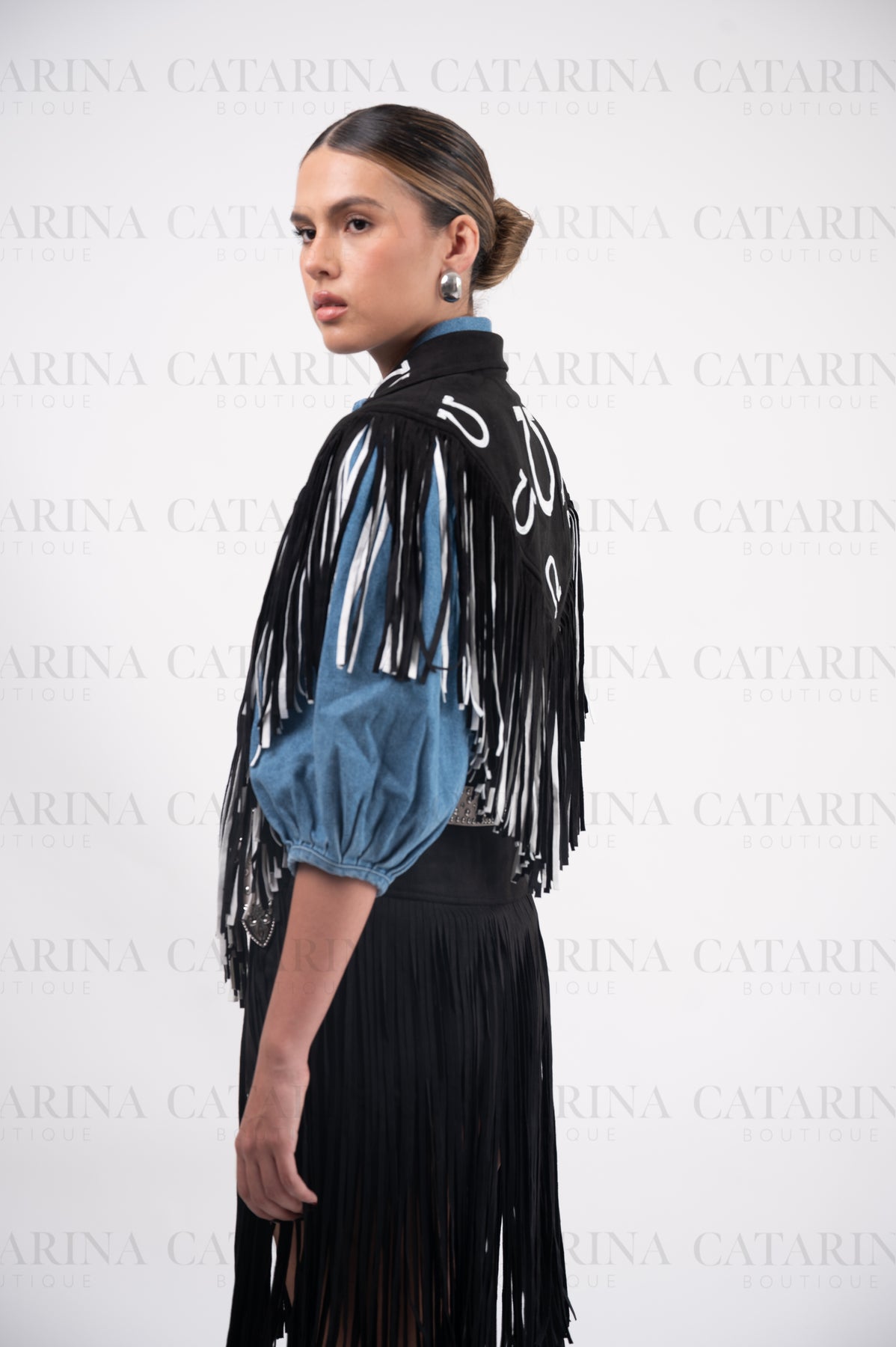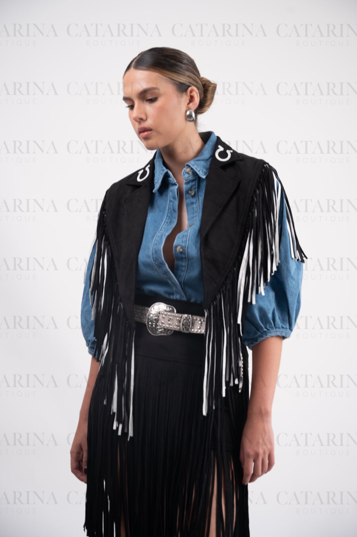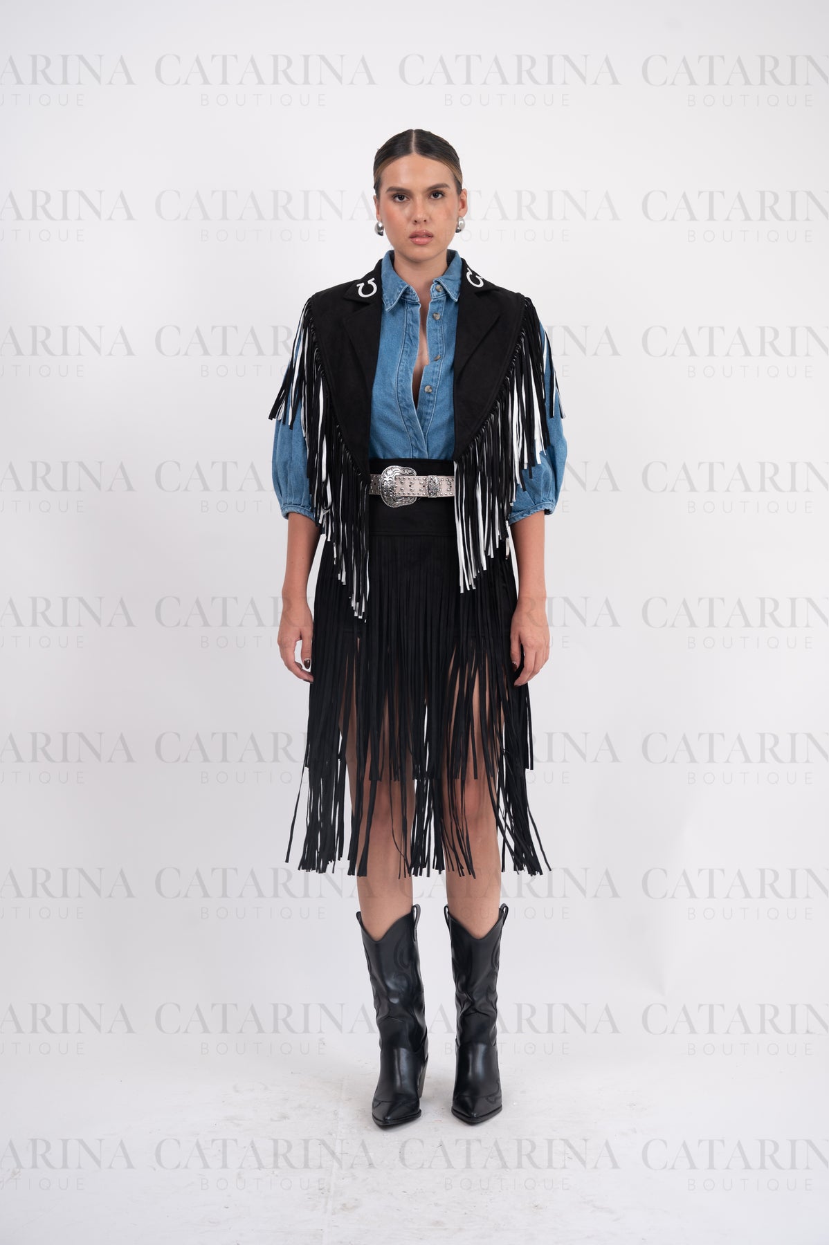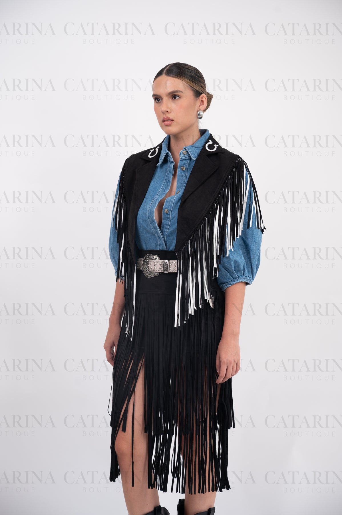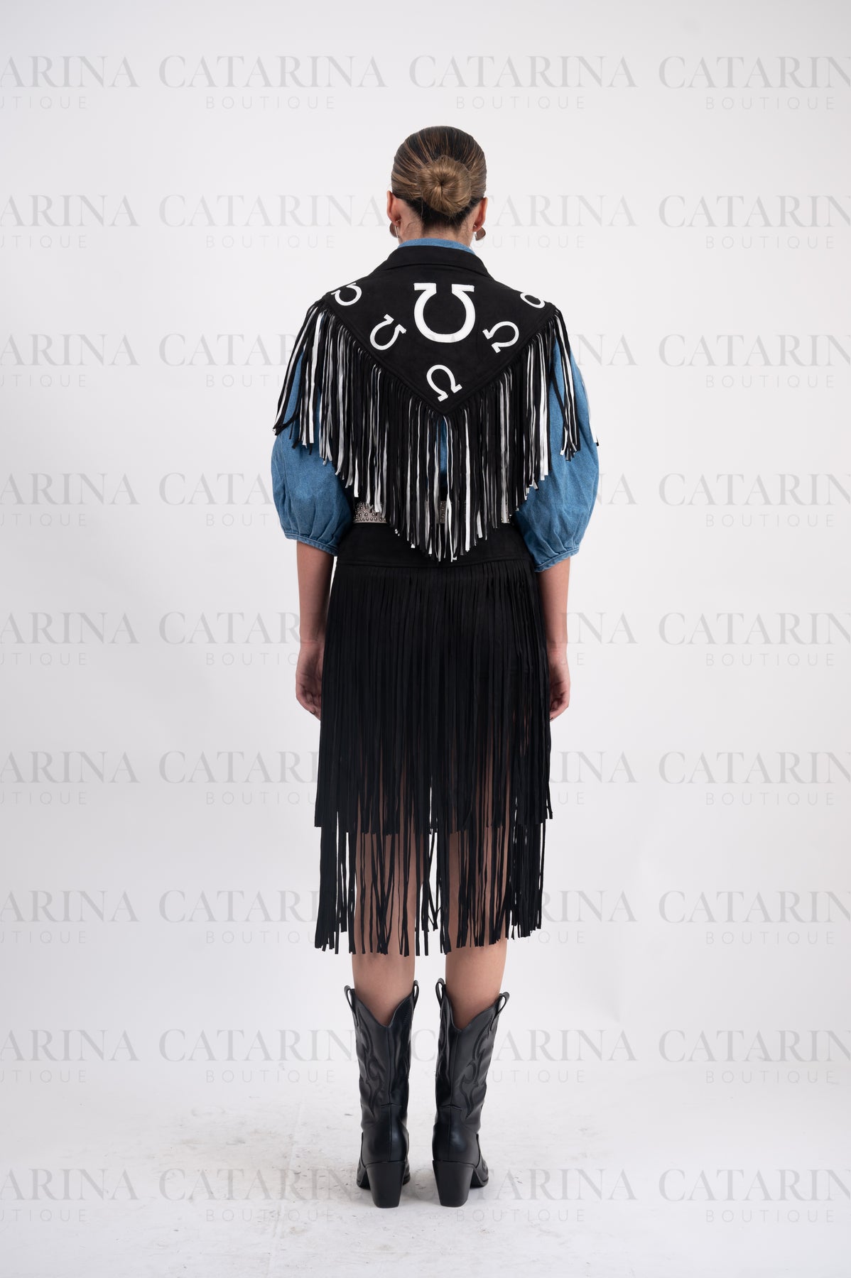 Ensamble vaquero. Detalle de flequillos sueltos. Estampado de herraduras.