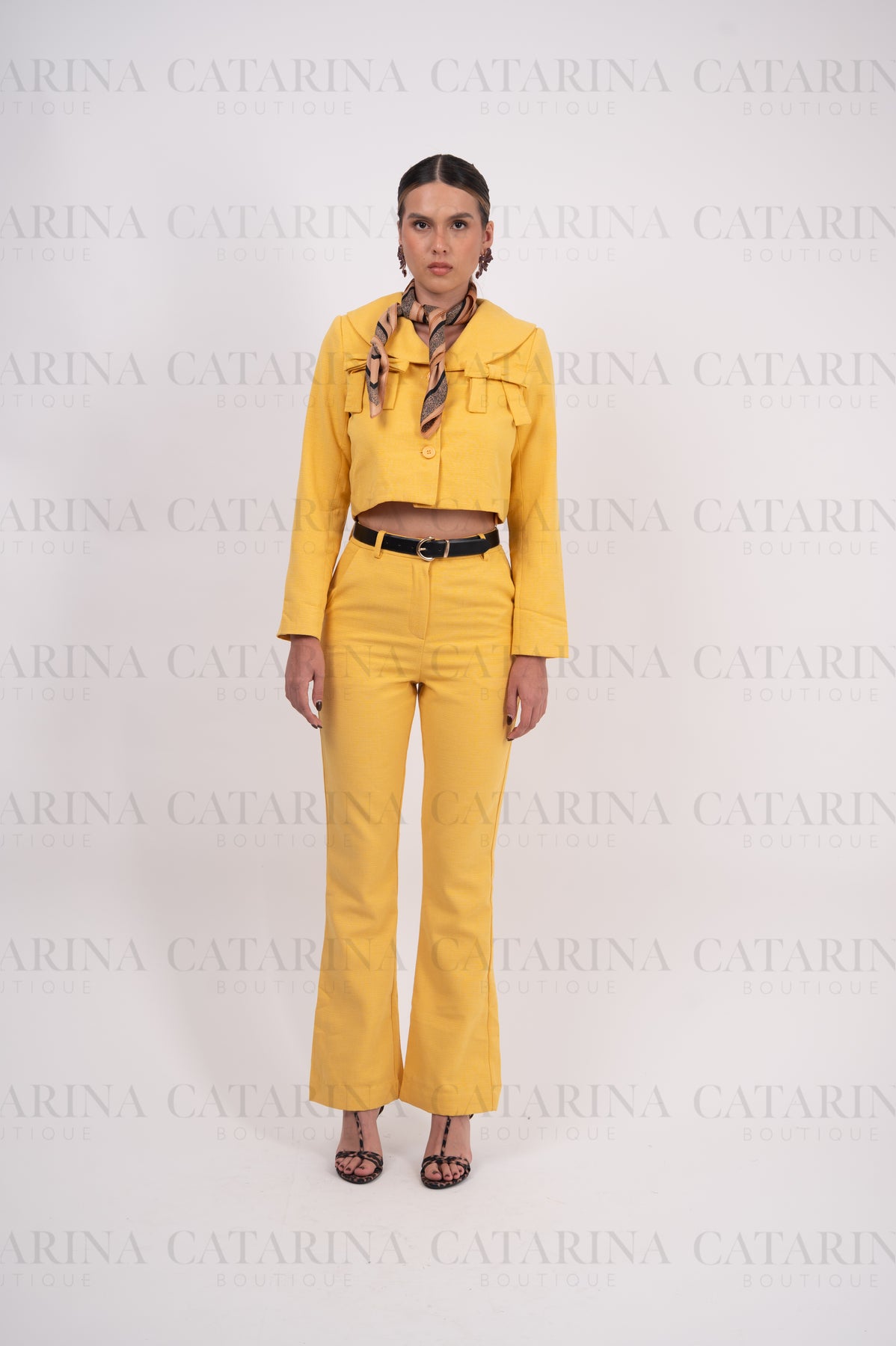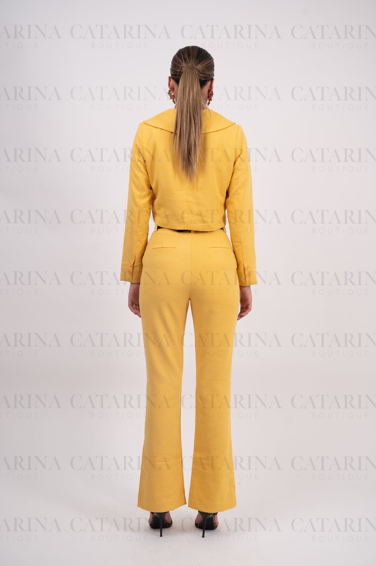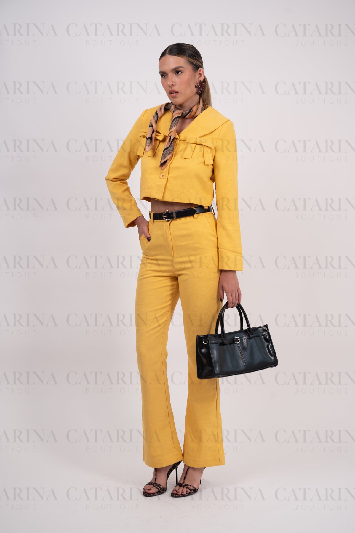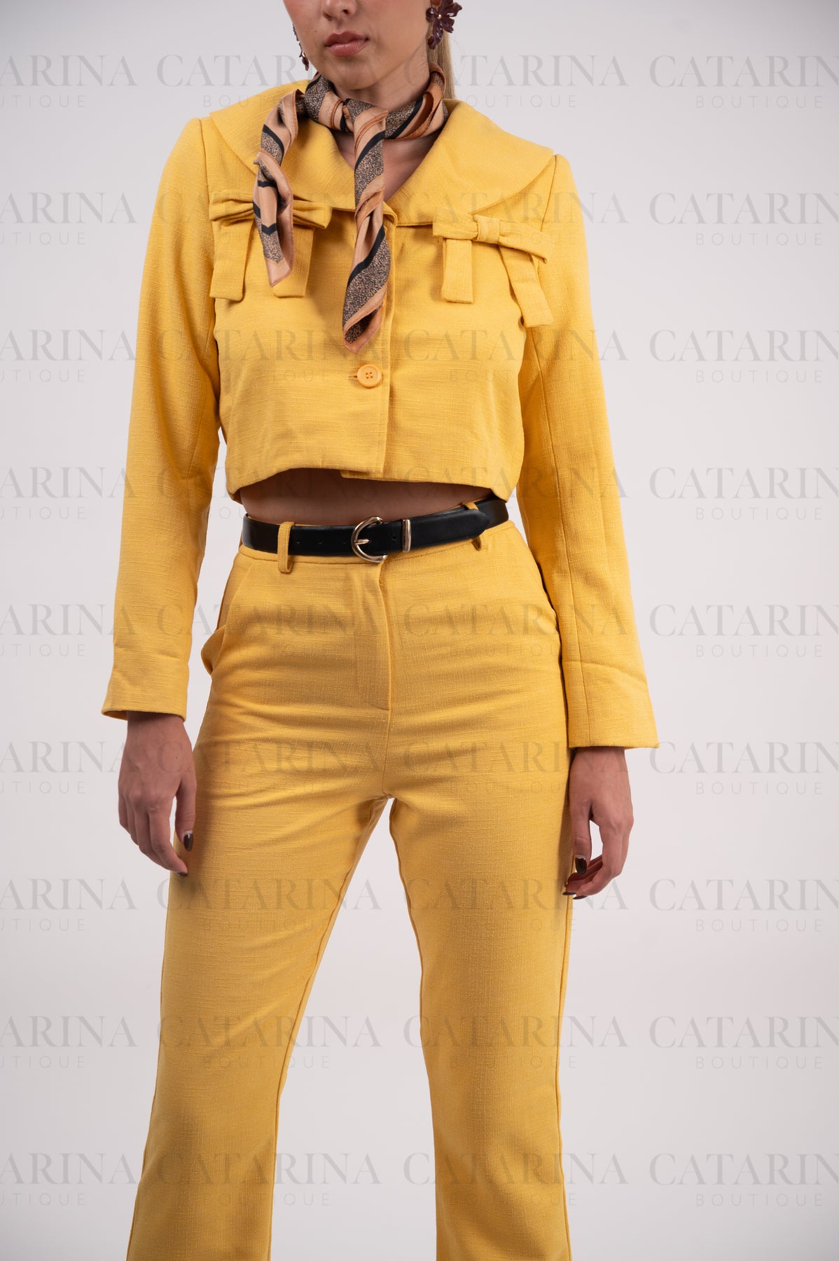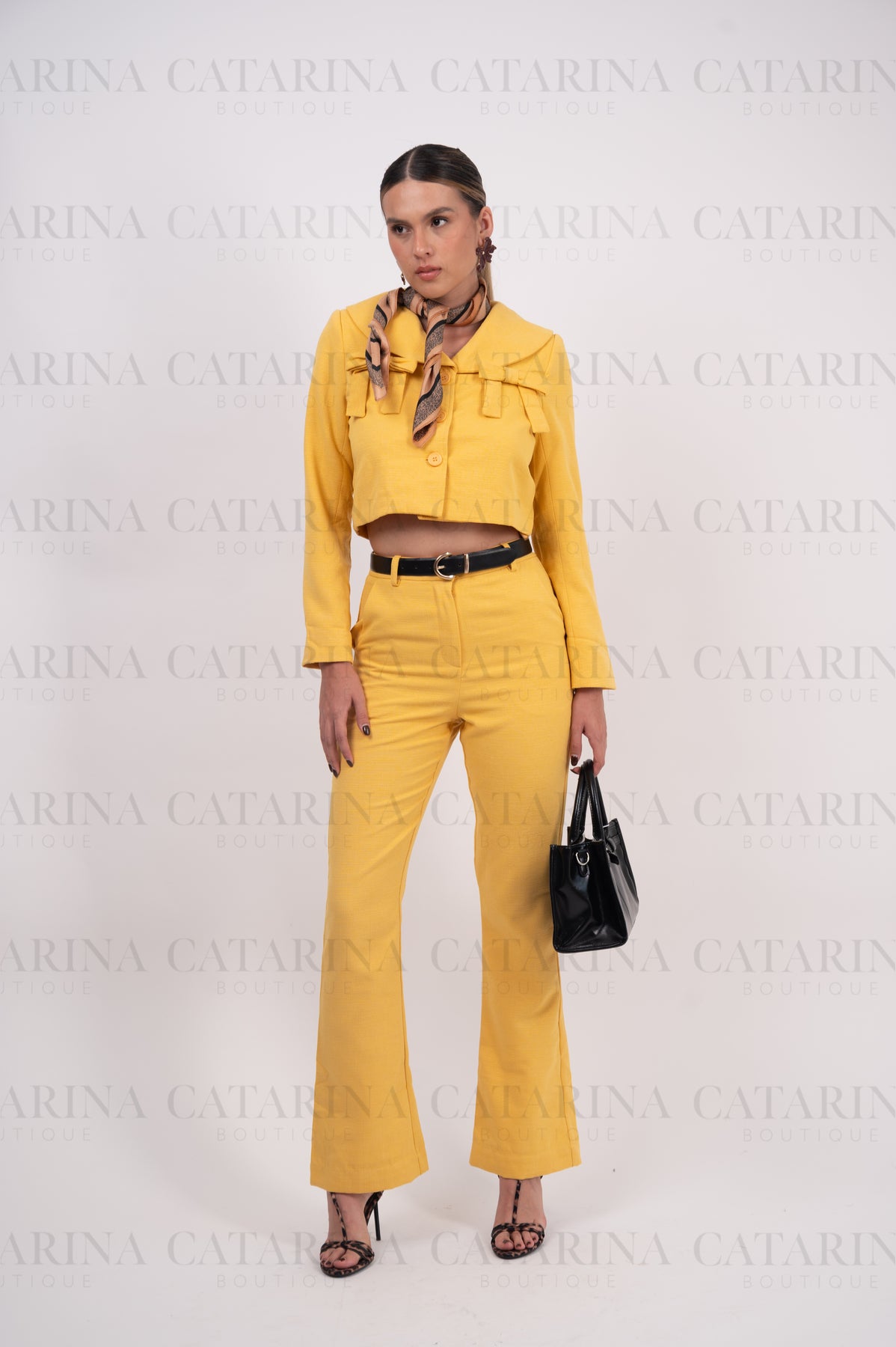 Conjunto de saco y pantalón. Saco de cuello redondo con manga larga. Botones y moñitos delanteros. Pantalón liso de tiro alto. Bolsillos ocultos en los costados.