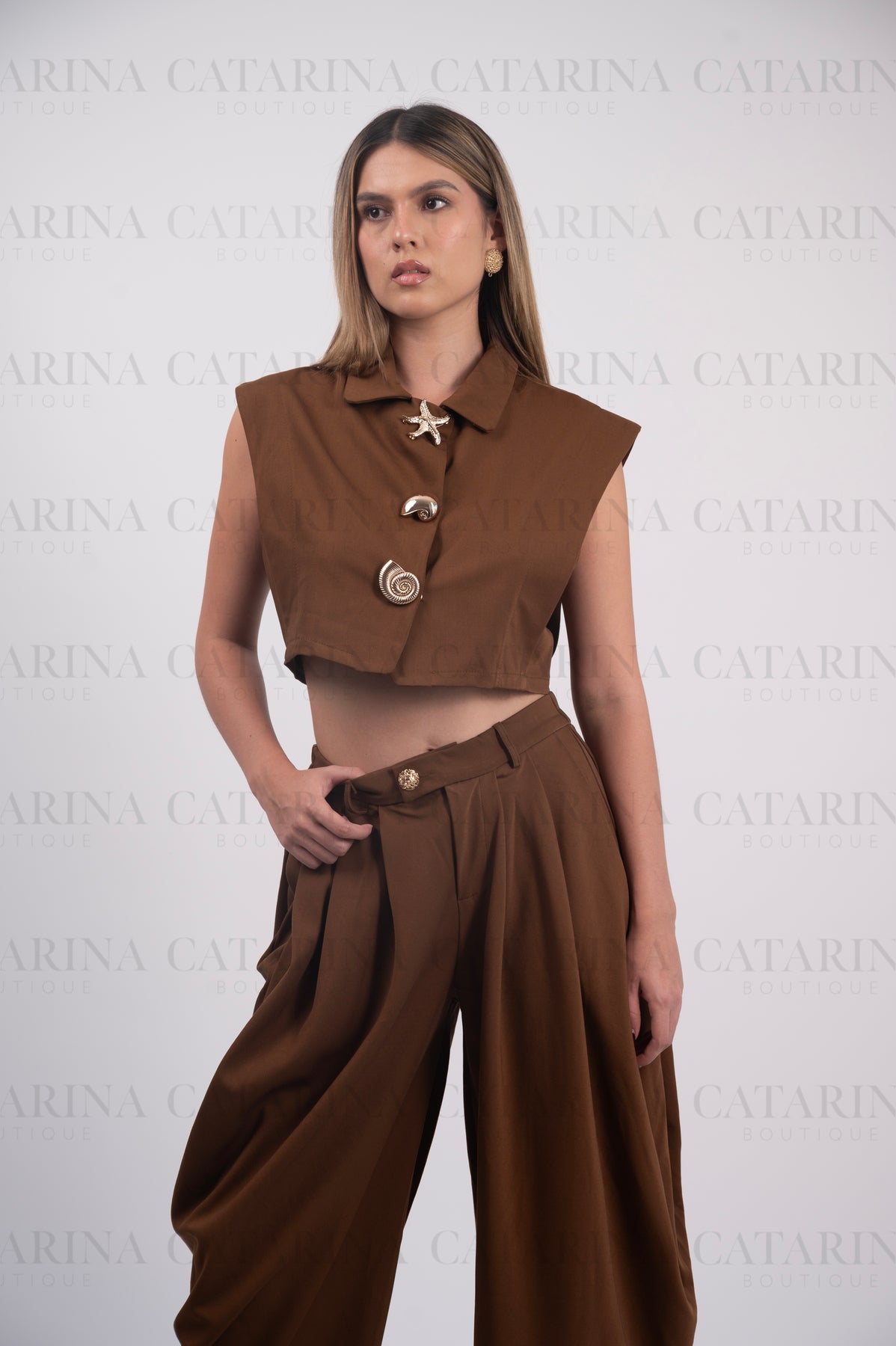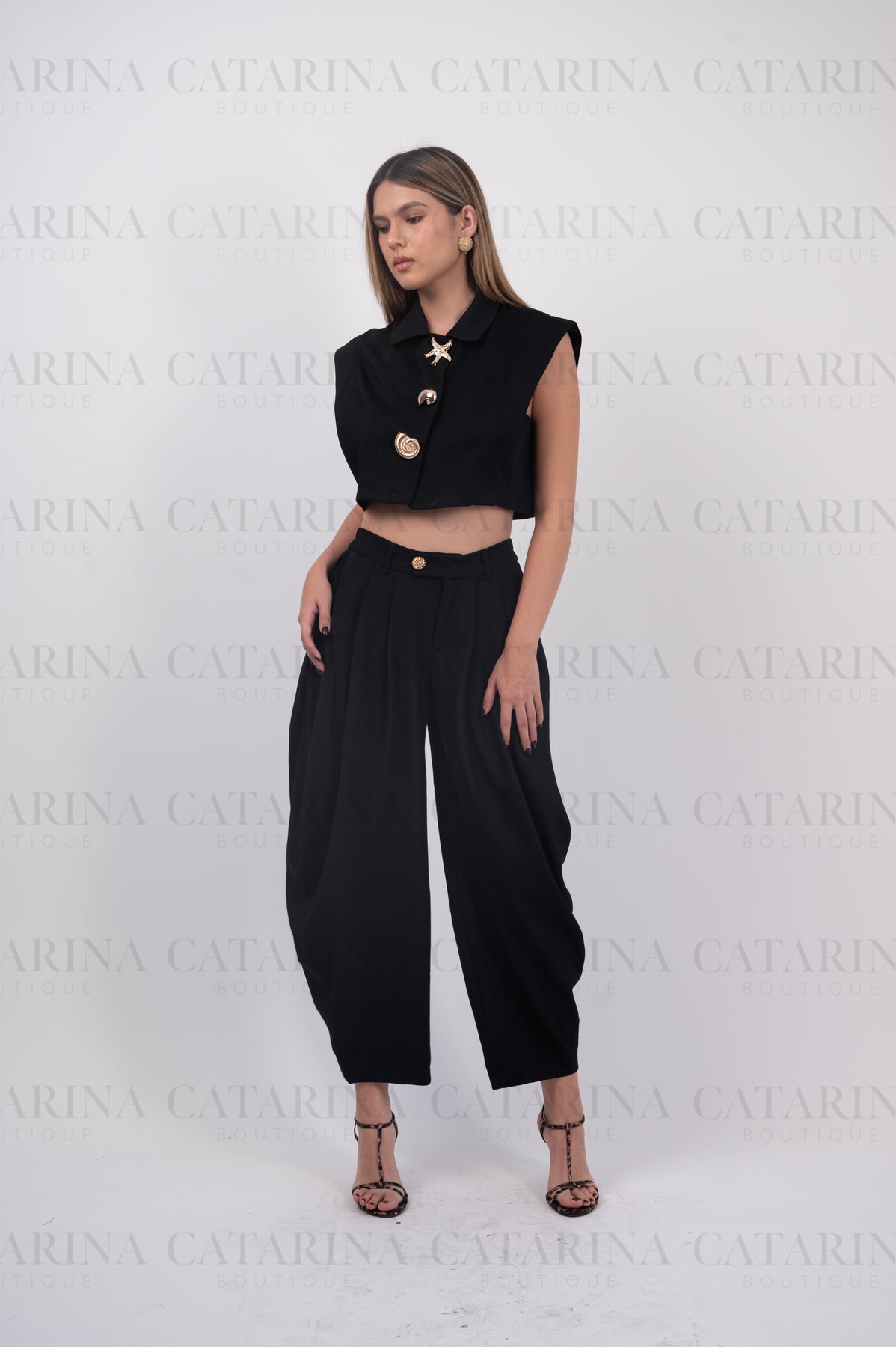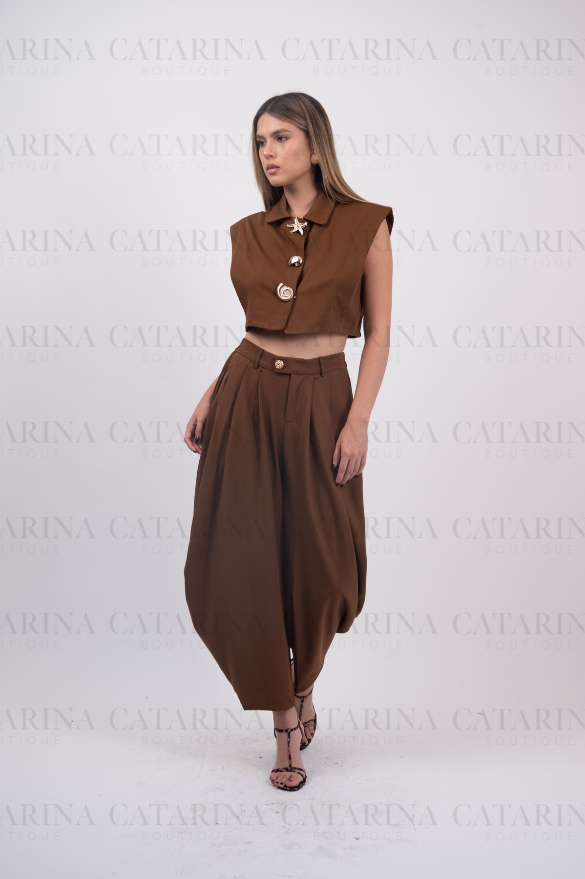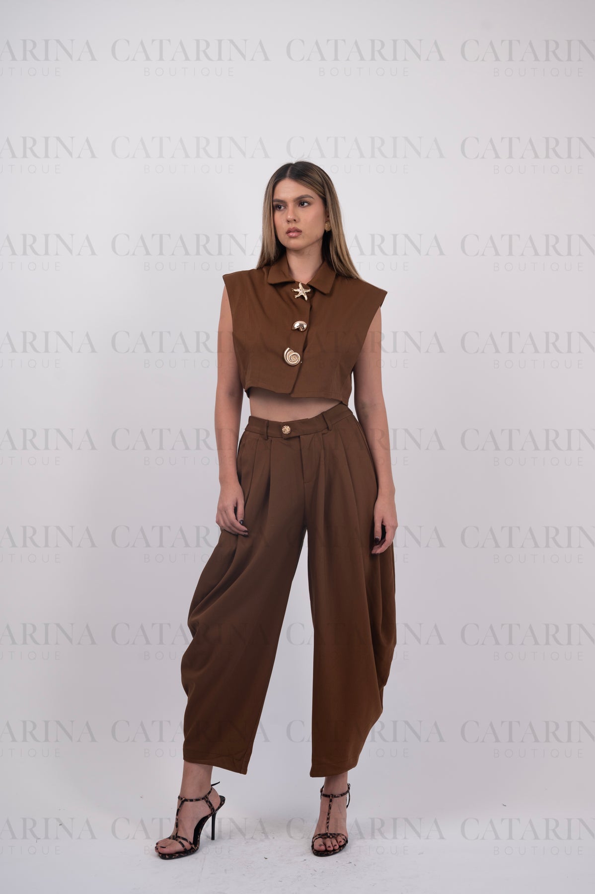 Conjunto de chaleco y pantalón. Chaleco de manga sisa. Botones delanteros. Pantalón tipo Aladino. Color liso de tiro alto. Elástico en cintura. Bajo acabado recto.
