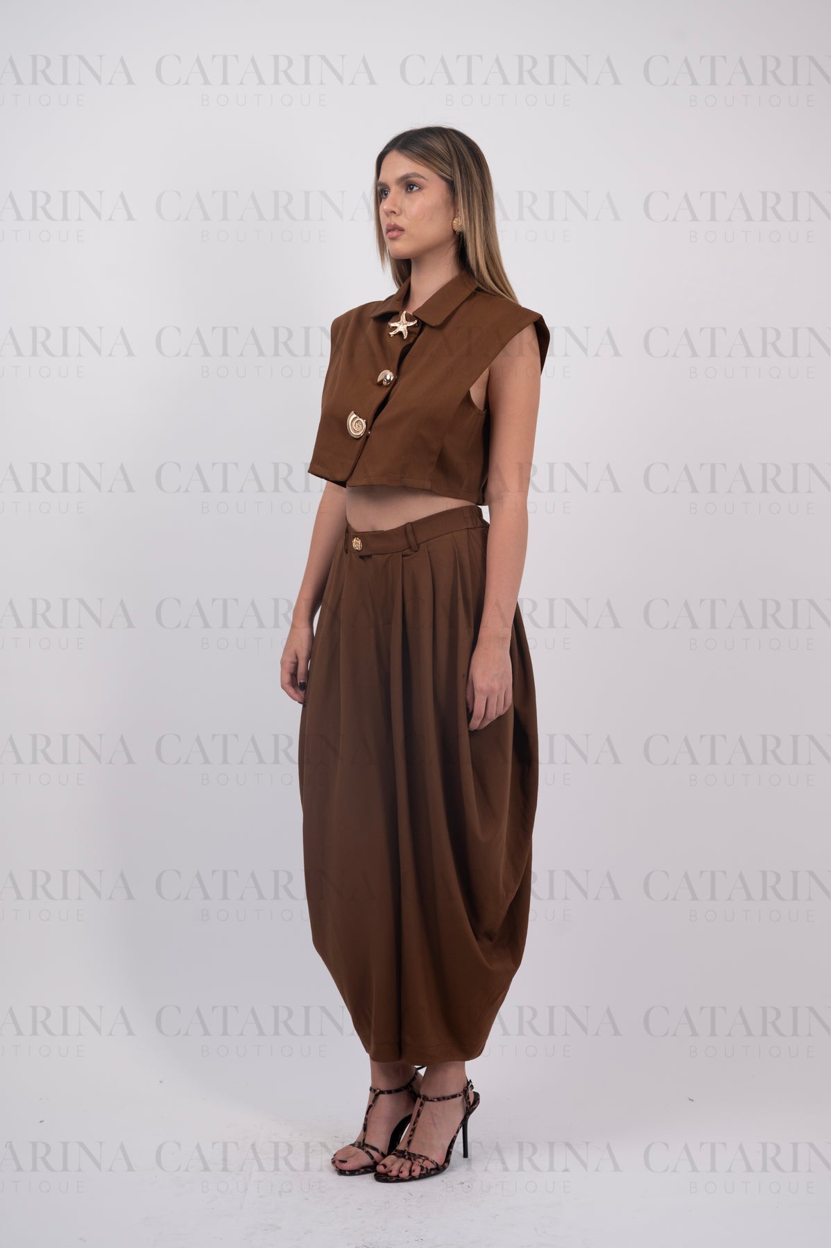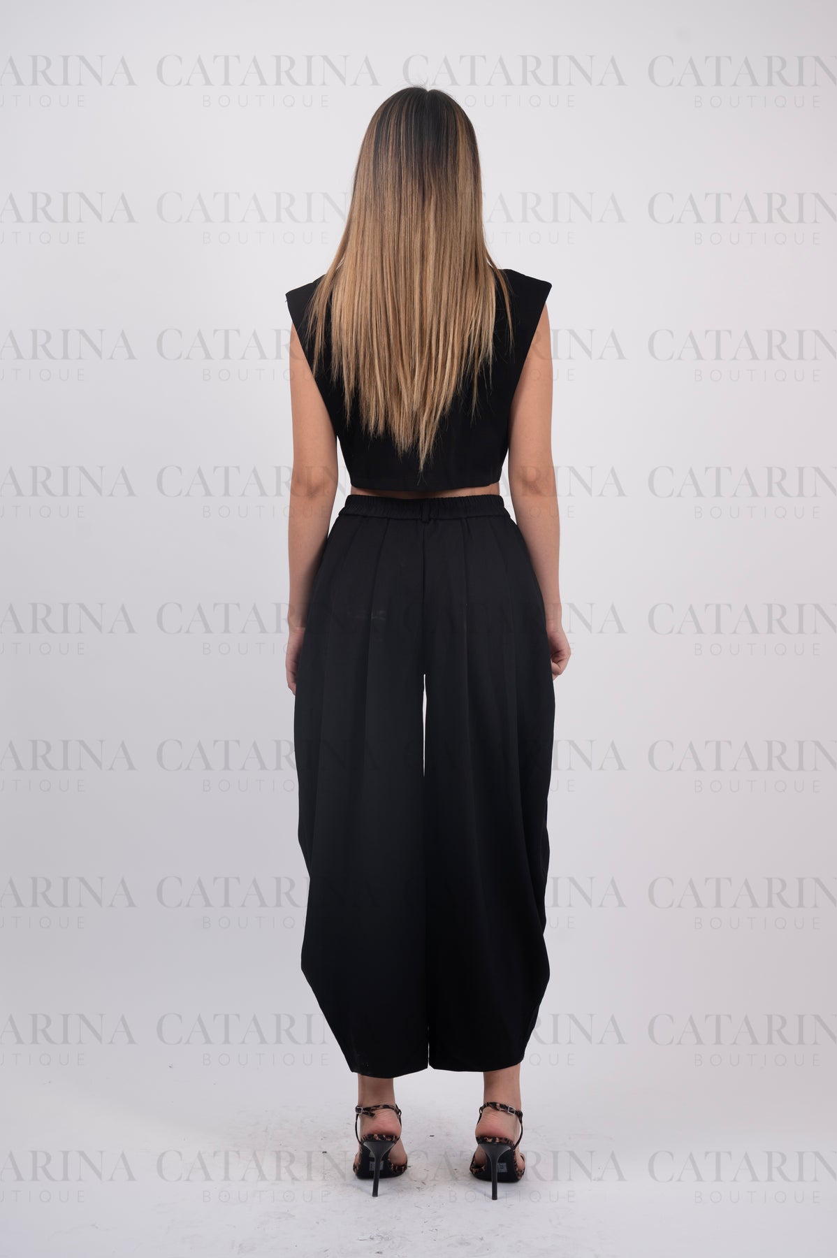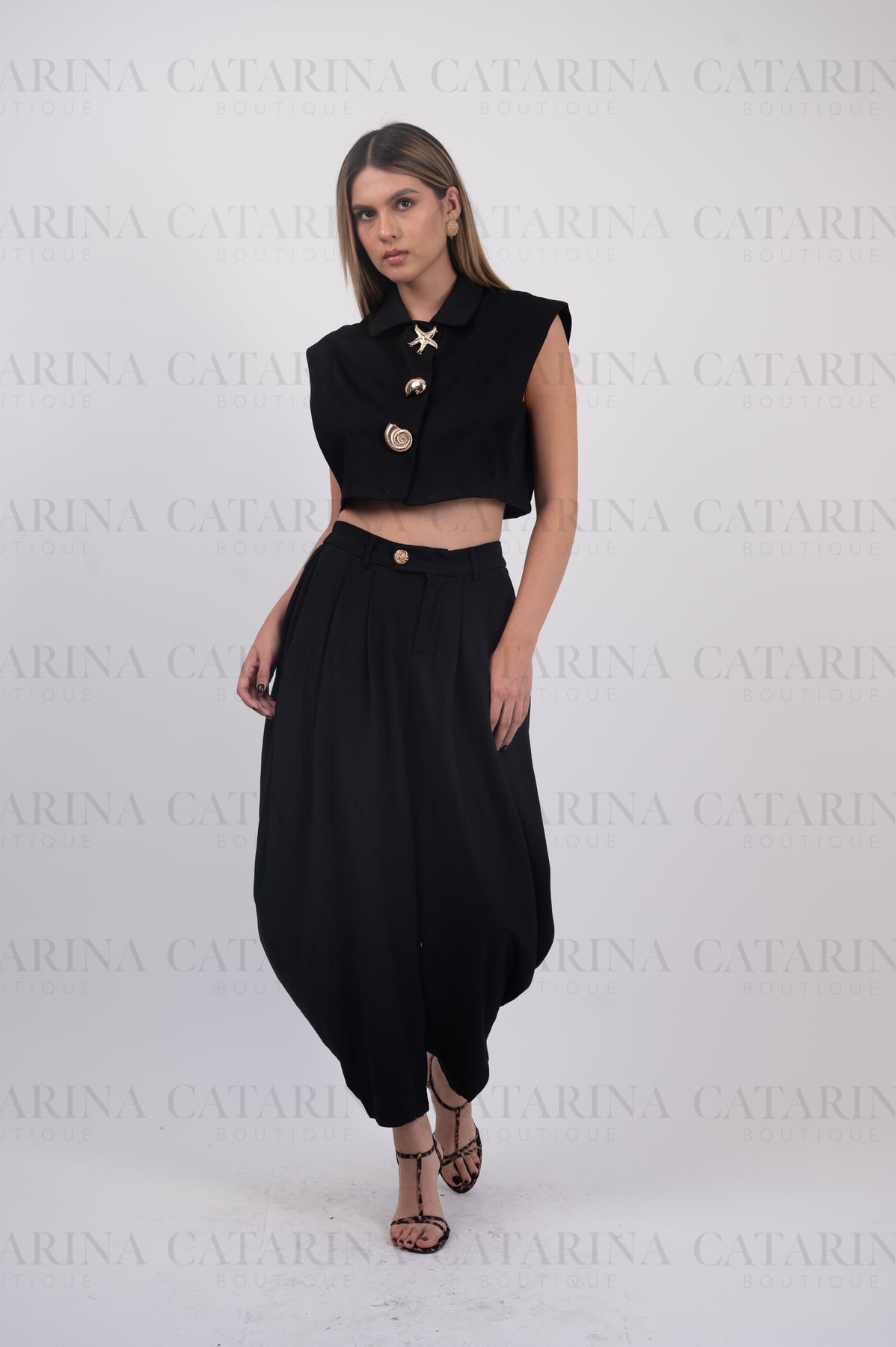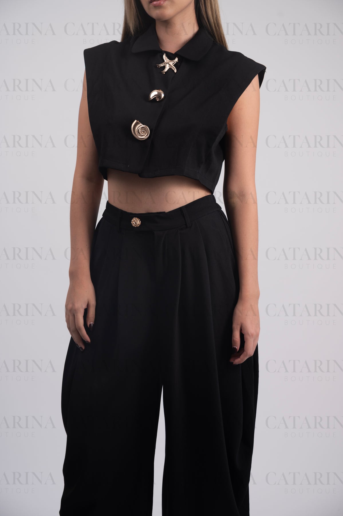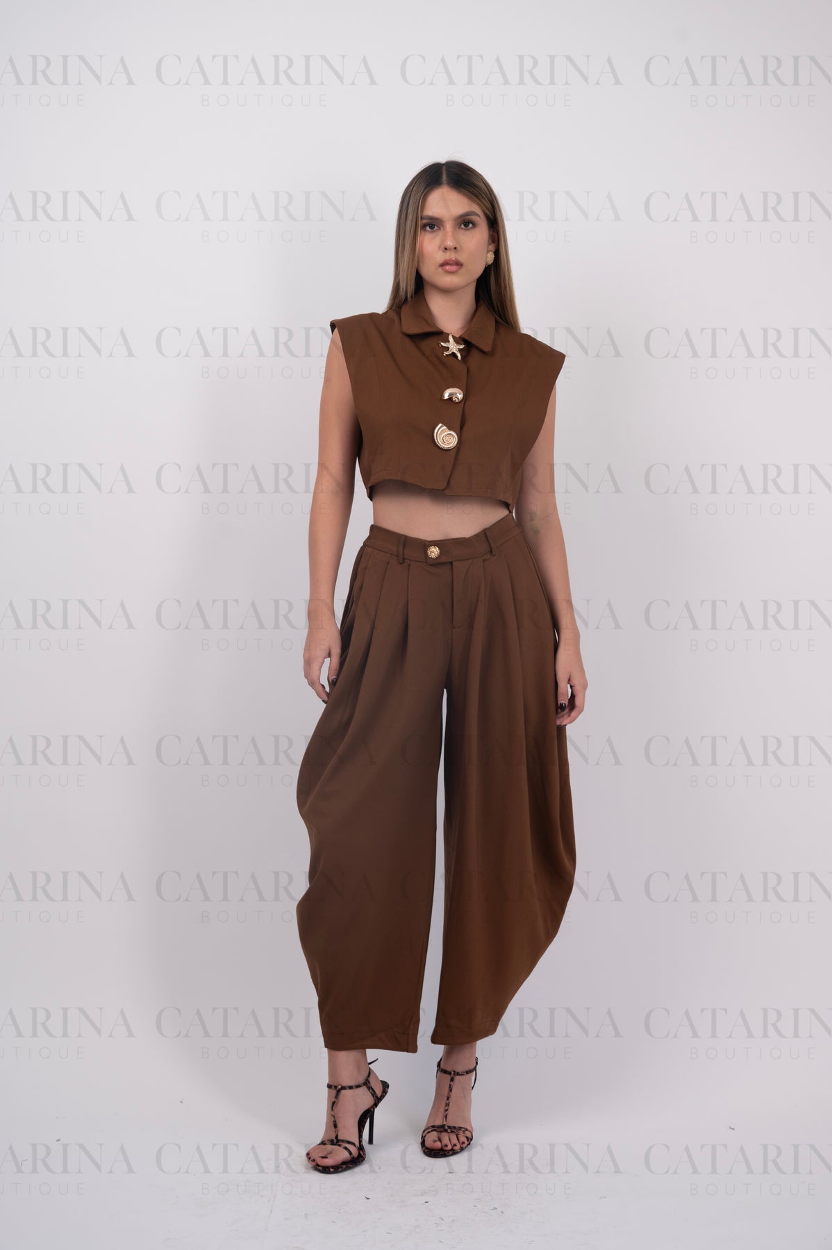 Conjunto de chaleco y pantalón. Chaleco de manga sisa. Botones delanteros. Pantalón tipo Aladino. Color liso de tiro alto. Elástico en cintura. Bajo acabado recto.