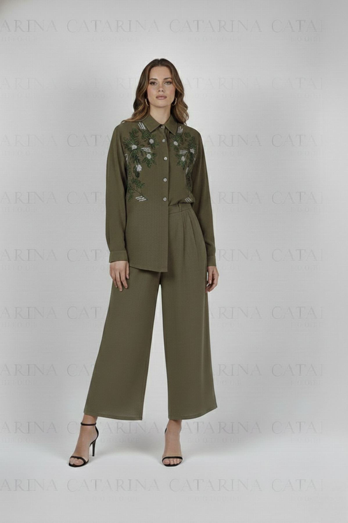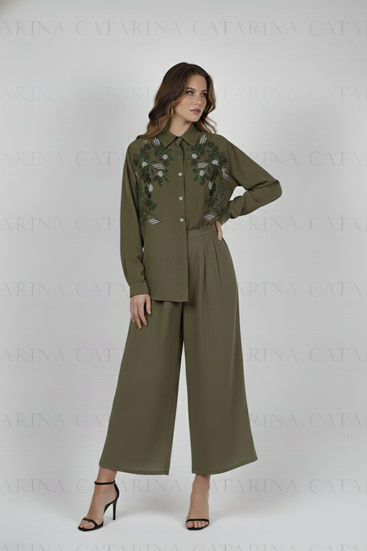 Conjunto de camisa y pantalón. Camisa manga larga. Cuello tipo americano. Botones y aplicaciones al frente. Pantalón de tiro alto. Elástico en cintura. Bajo acabado recto.