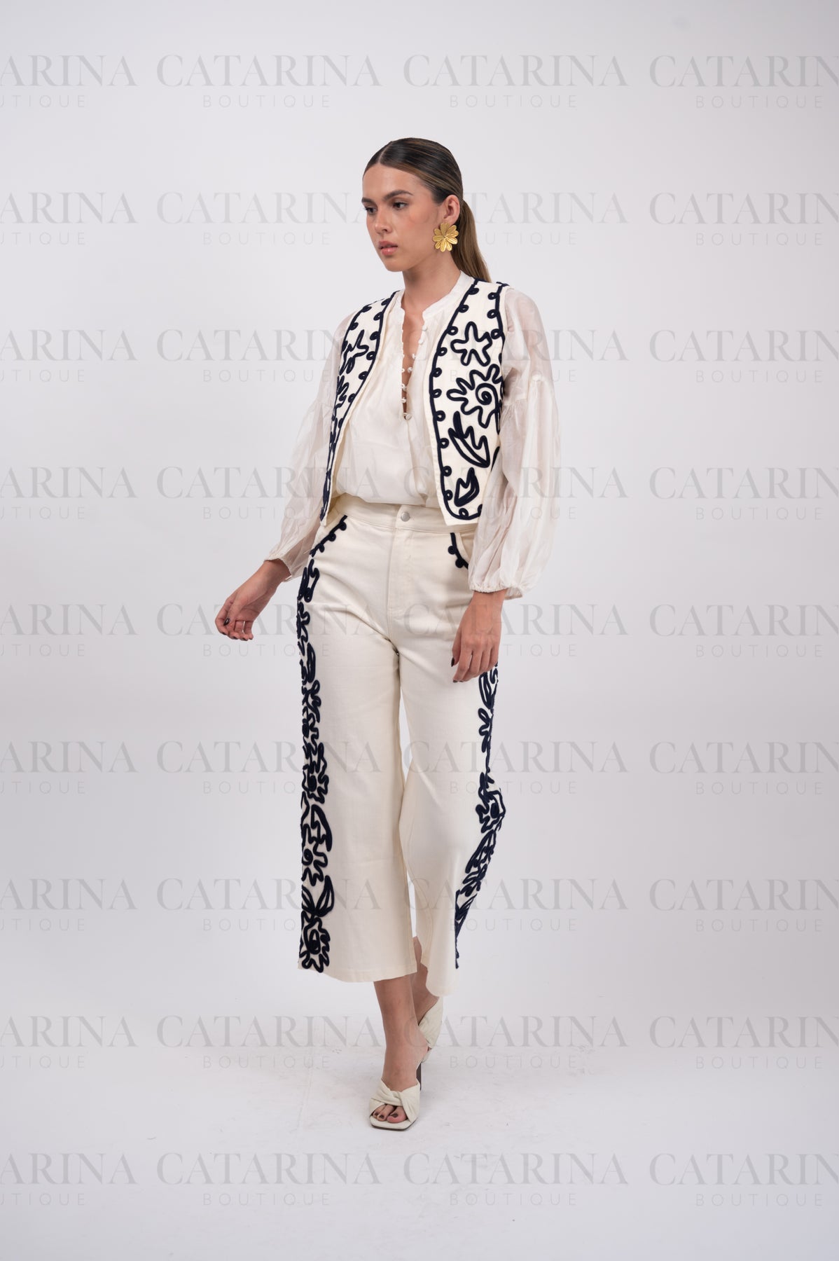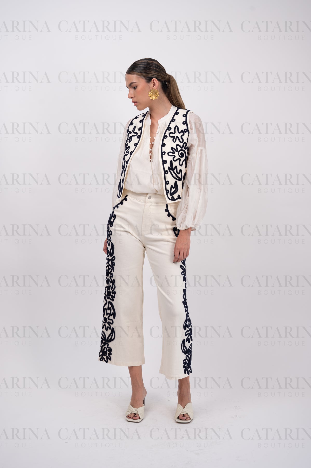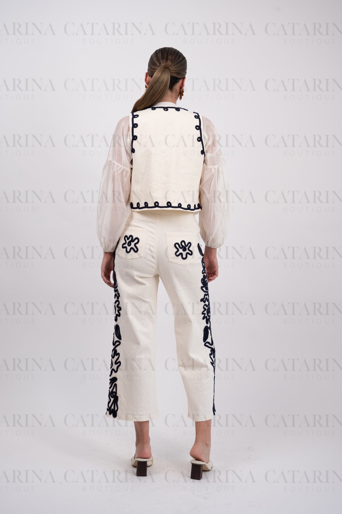Conjunto de chaleco y pantalón. Chaleco de escote pico con manga sisa. Pantalón liso de tiro alto. Botón y cierre al frente. Bajo acabado recto.