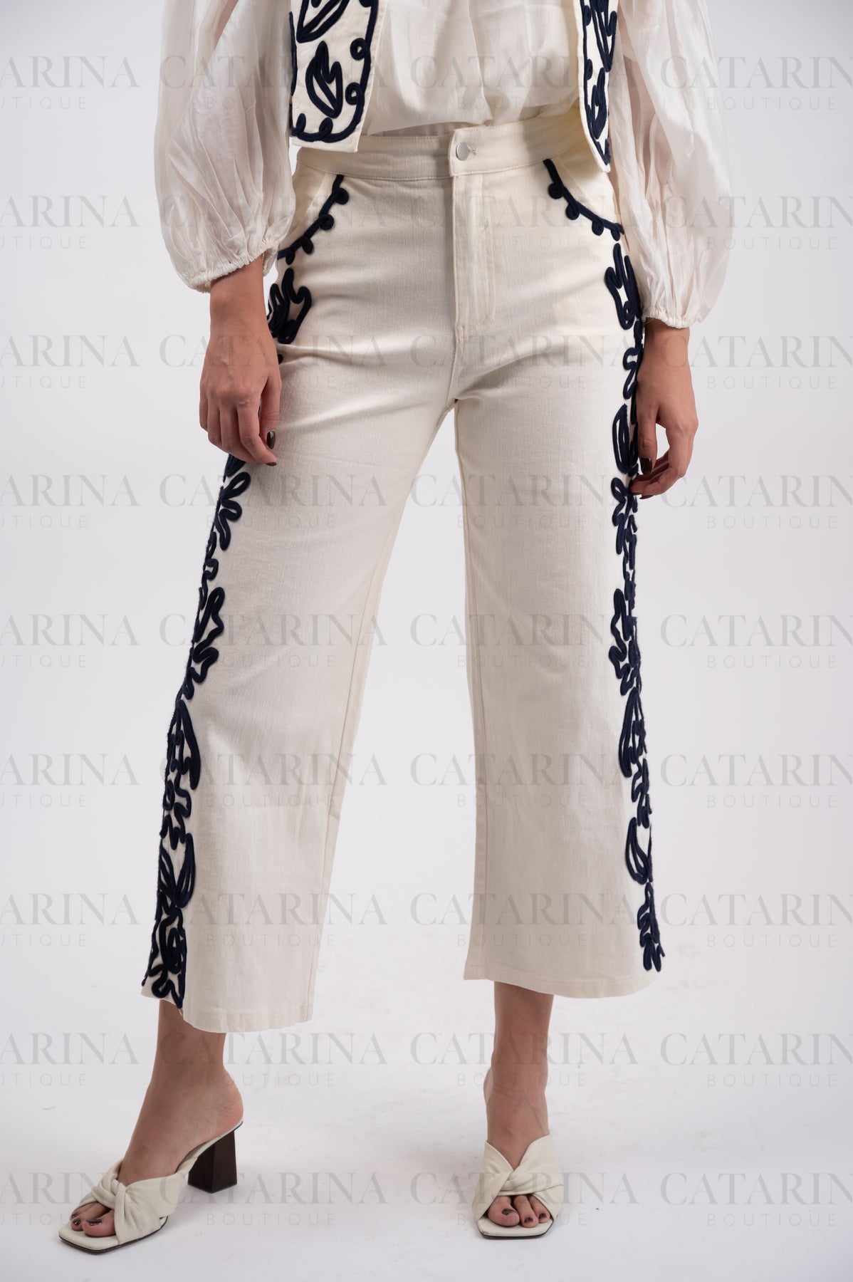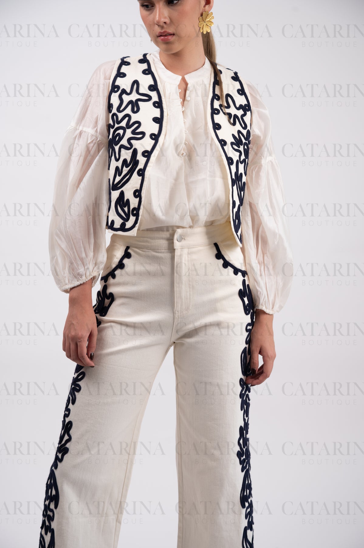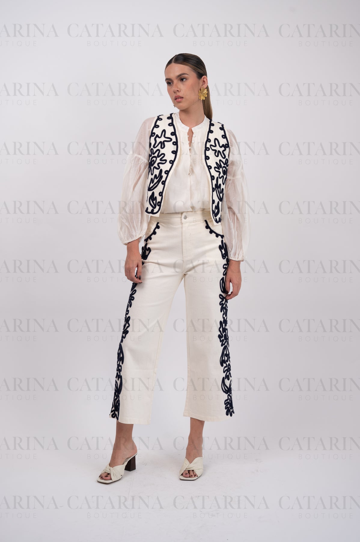 Conjunto de chaleco y pantalón. Chaleco de escote pico con manga sisa. Pantalón liso de tiro alto. Botón y cierre al frente. Bajo acabado recto.