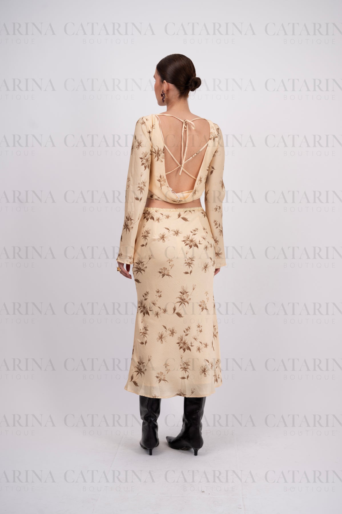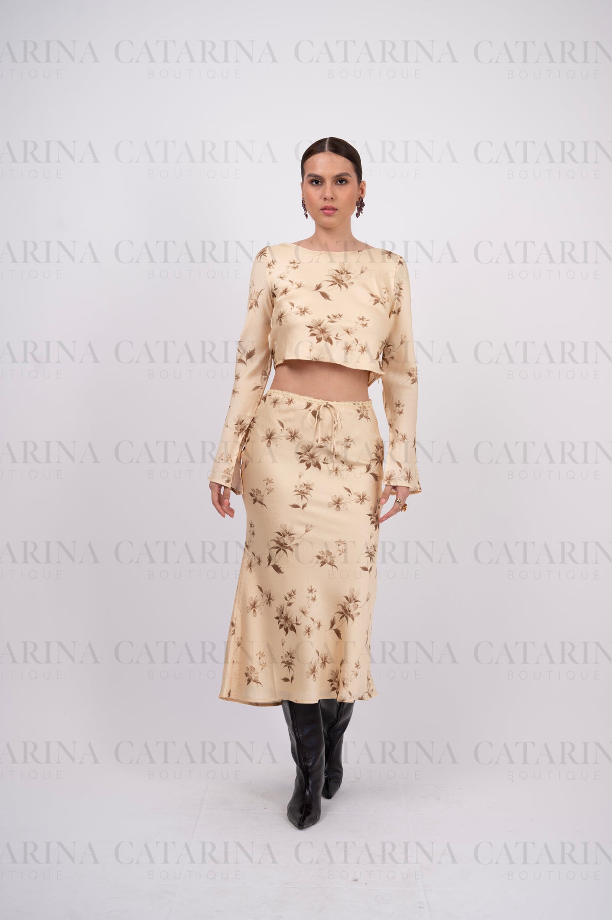 Conjunto de top y falda. Top de cuello redondo. Manga larga. Falda de tiro alto. Bajo acabado en volante.