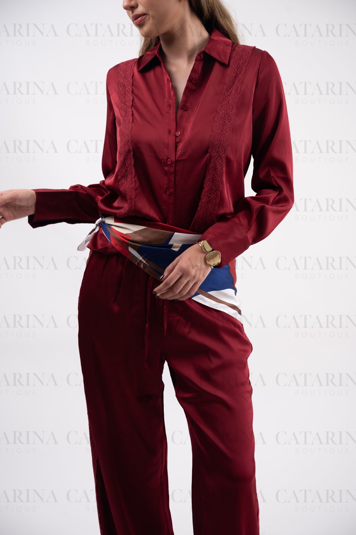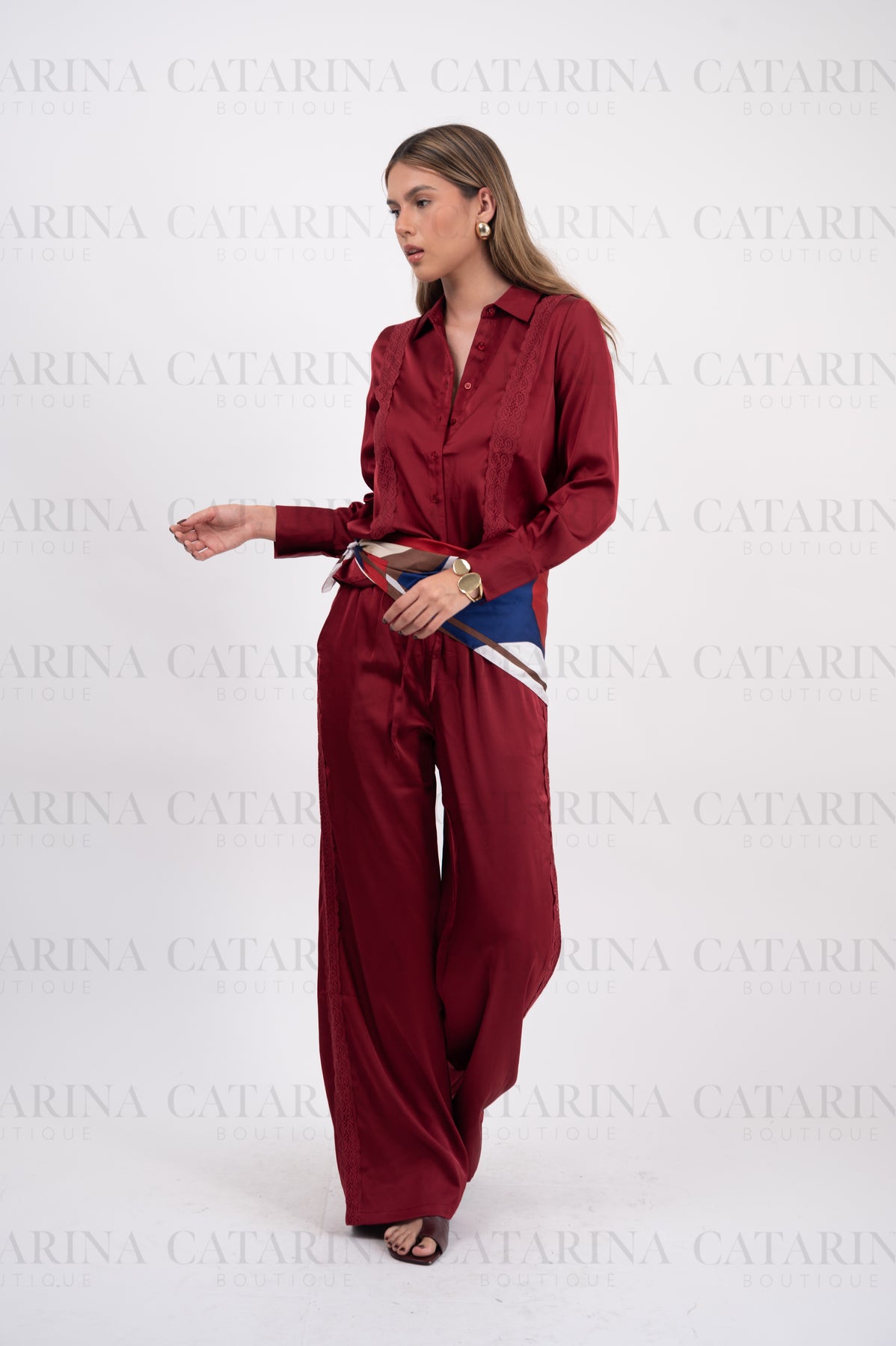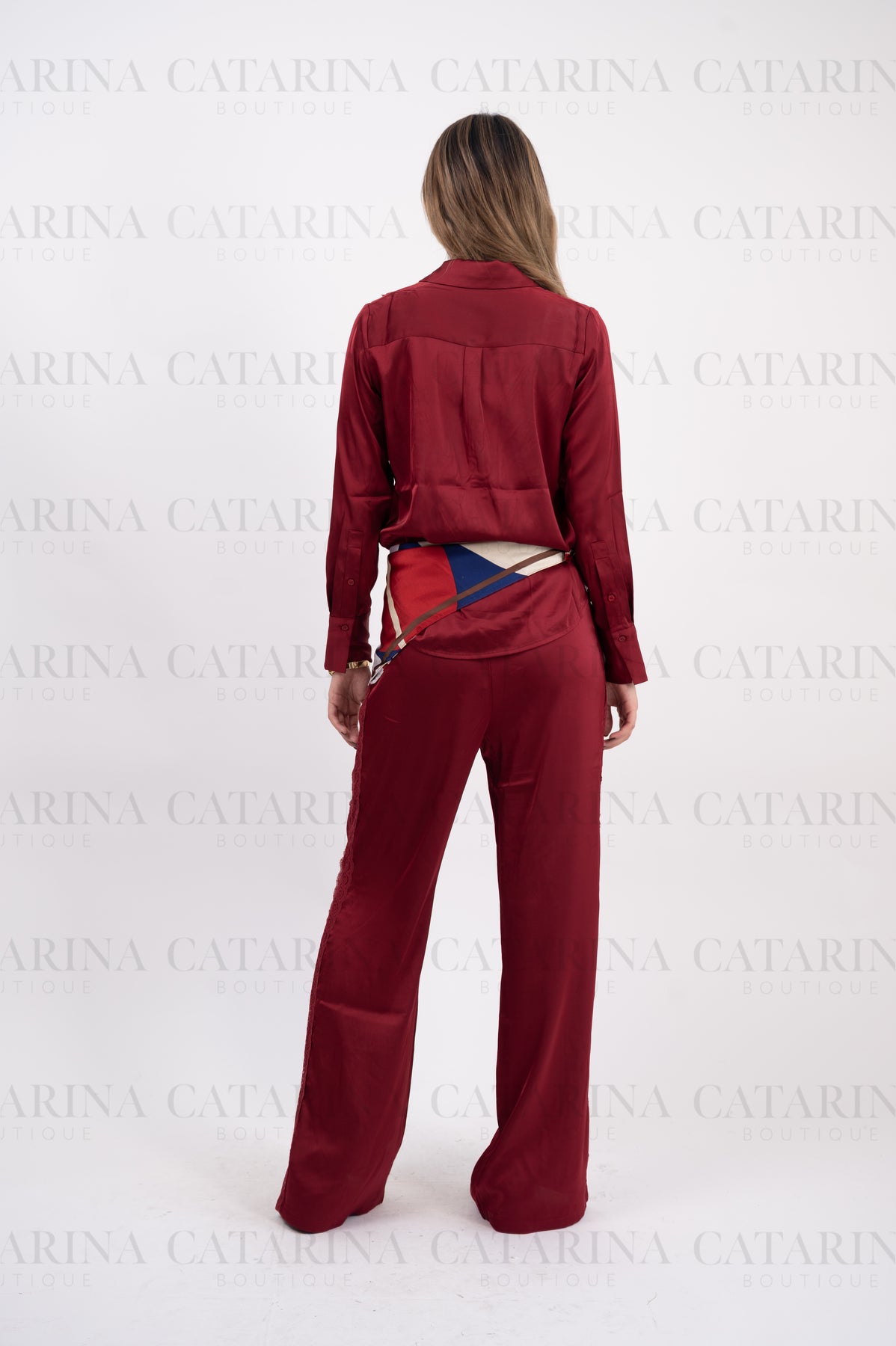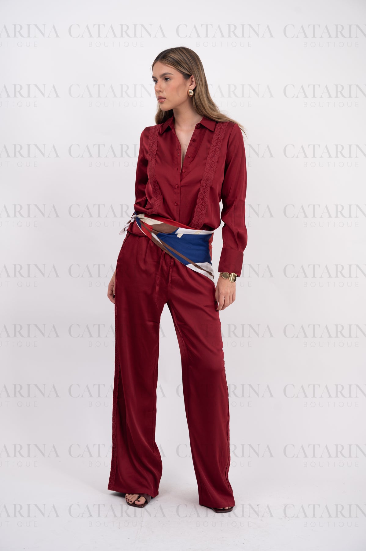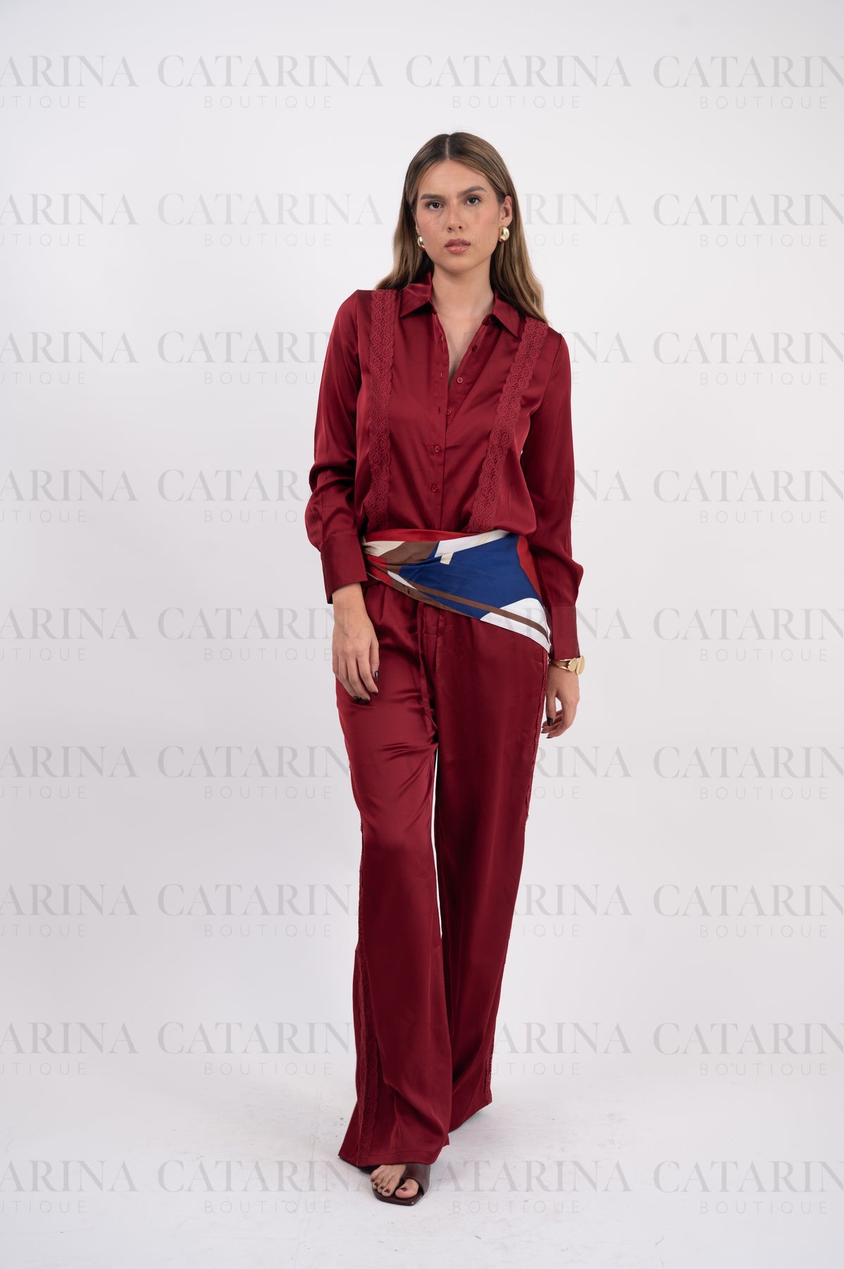 Conjunto de camisa y pantalón. Camisa manga larga. Cuello tipo americano. Botones al frente. Pantalón de tiro alto. Bolsillos a los costados. Elástico en cintura. Bajo acabado recto.