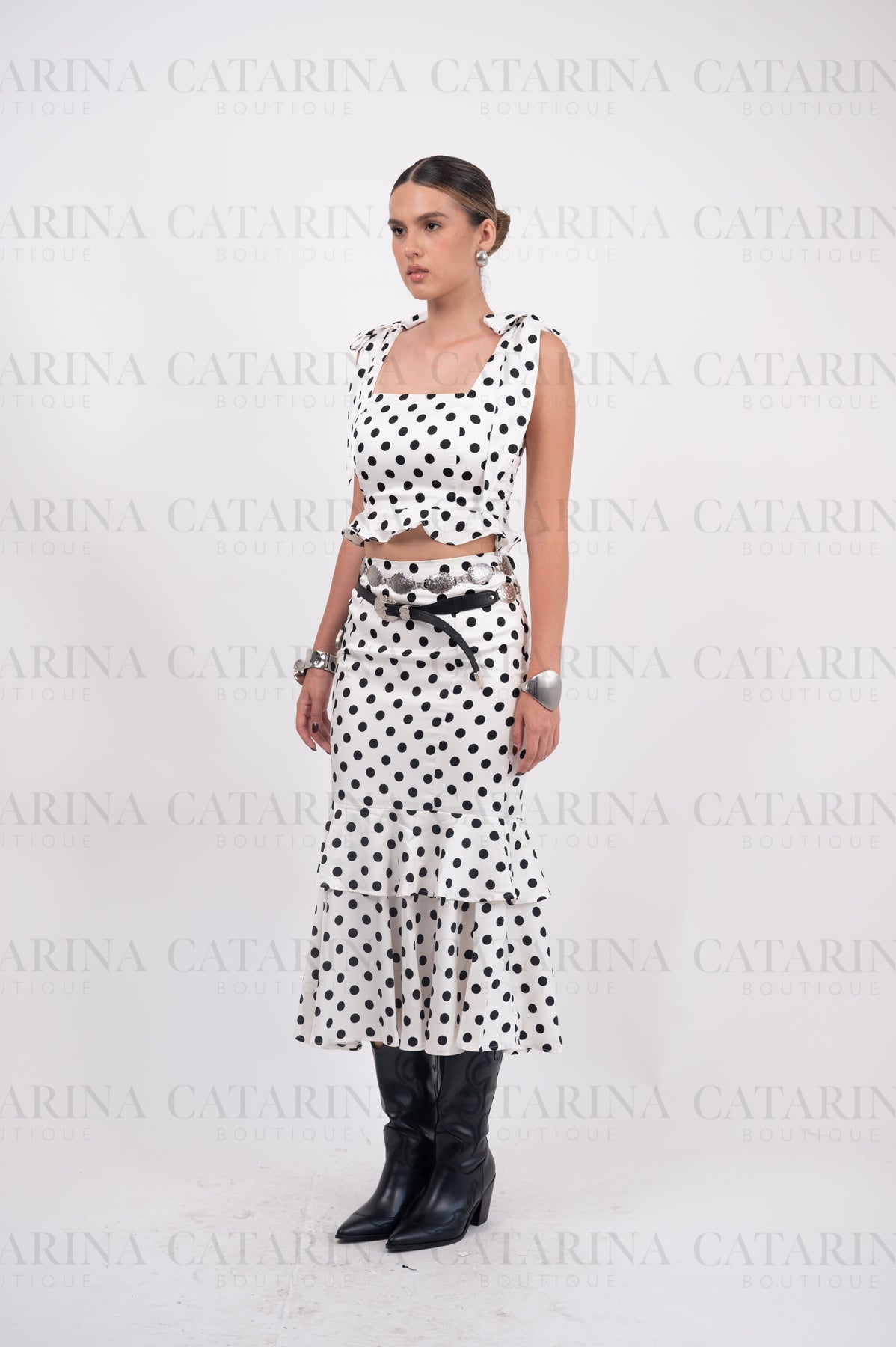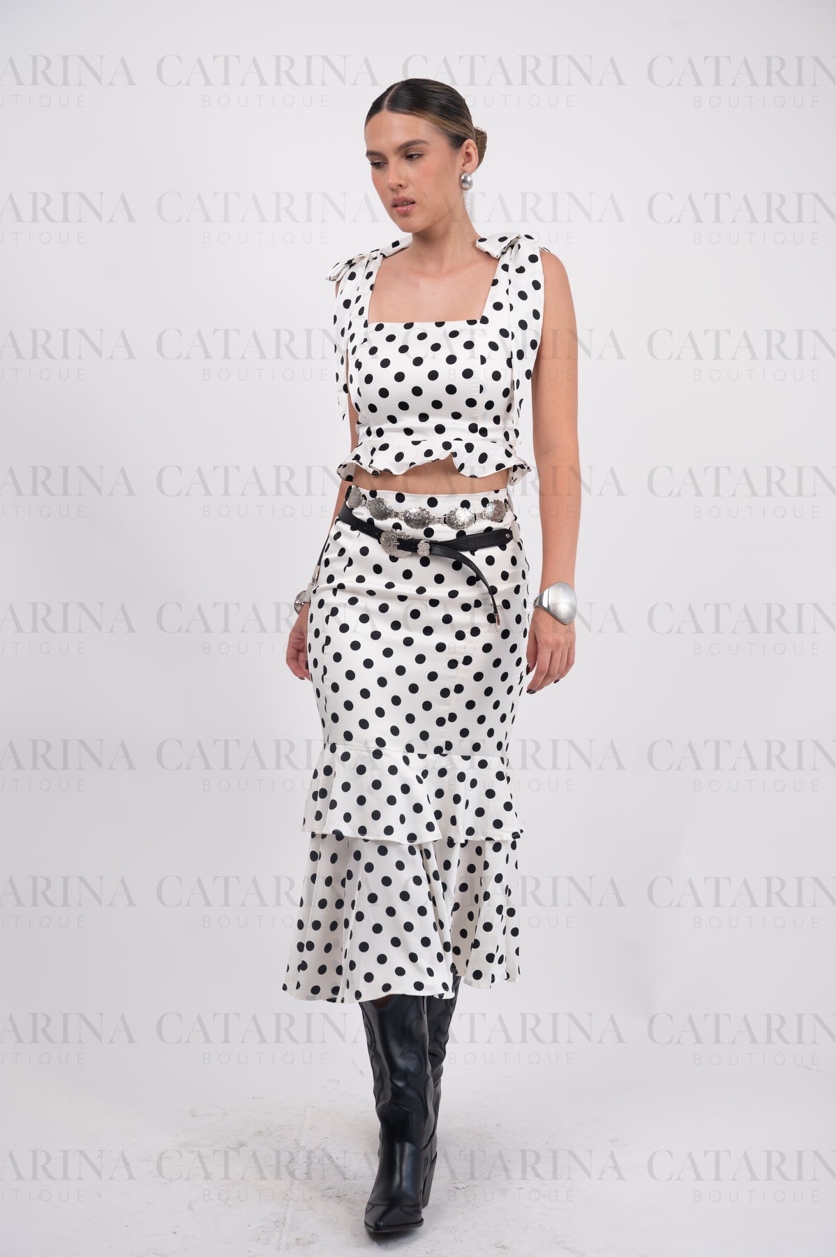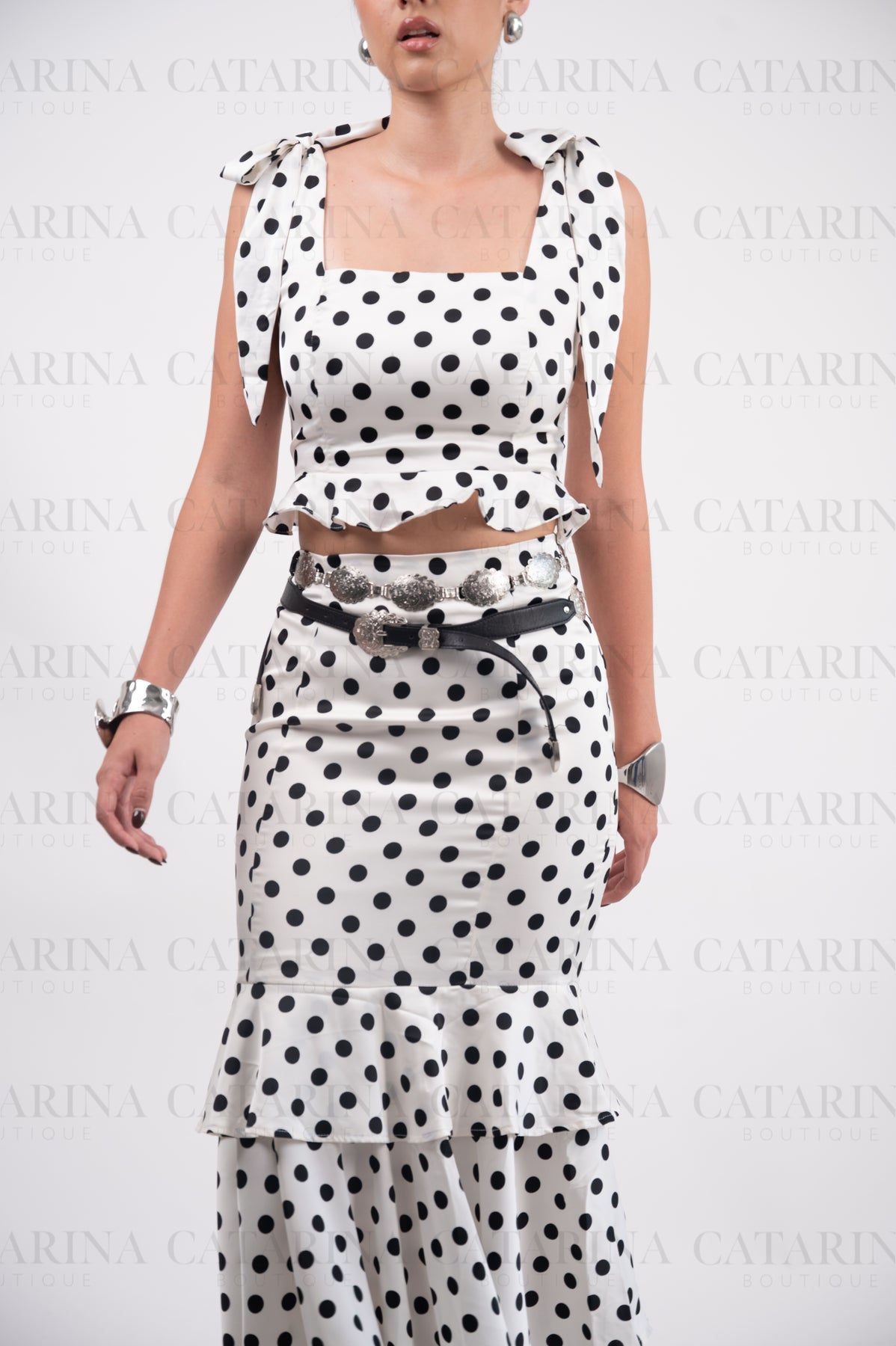 Conjunto de top de escote recto con tirantes gruesos ajustables y una falda larga adornada con un pequeño volante. Detalle de estampado en todo el cuerpo de las prendas.