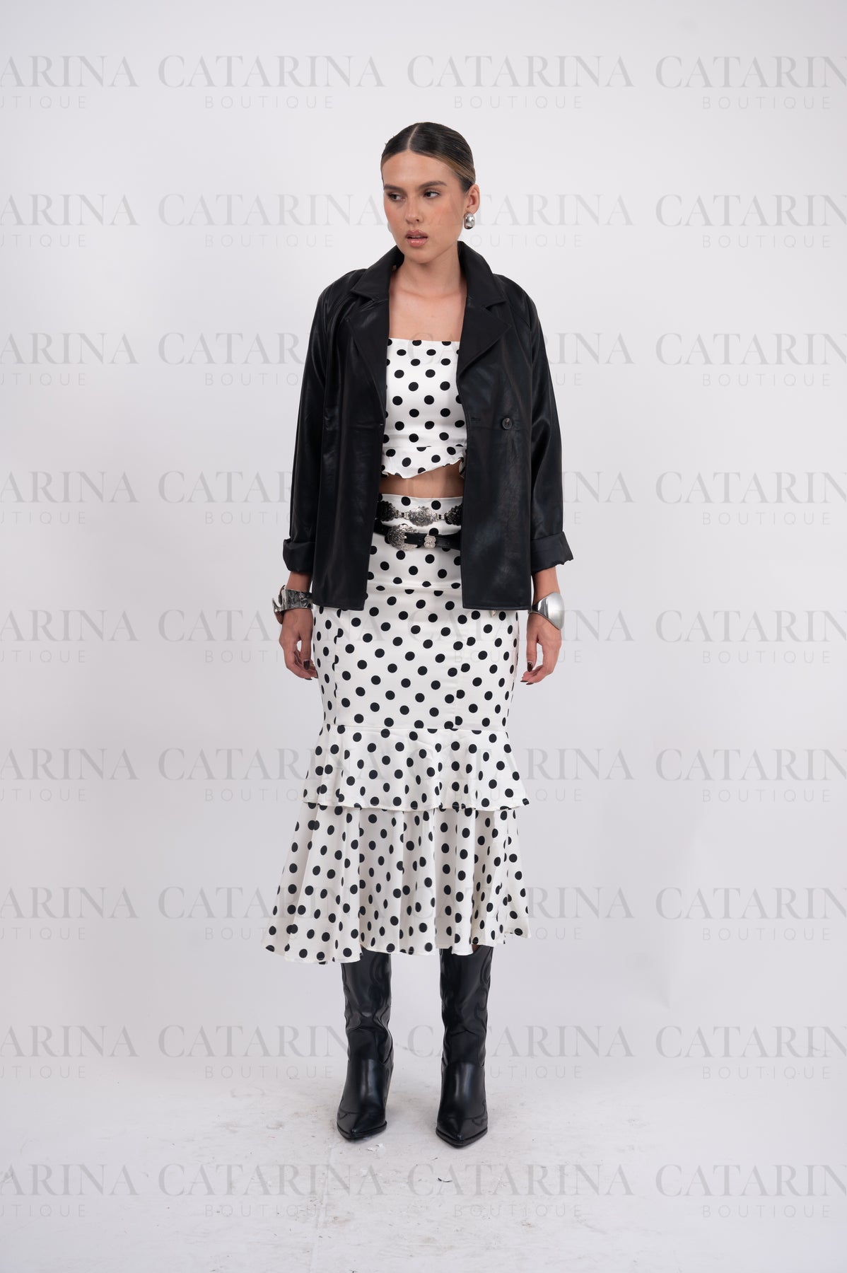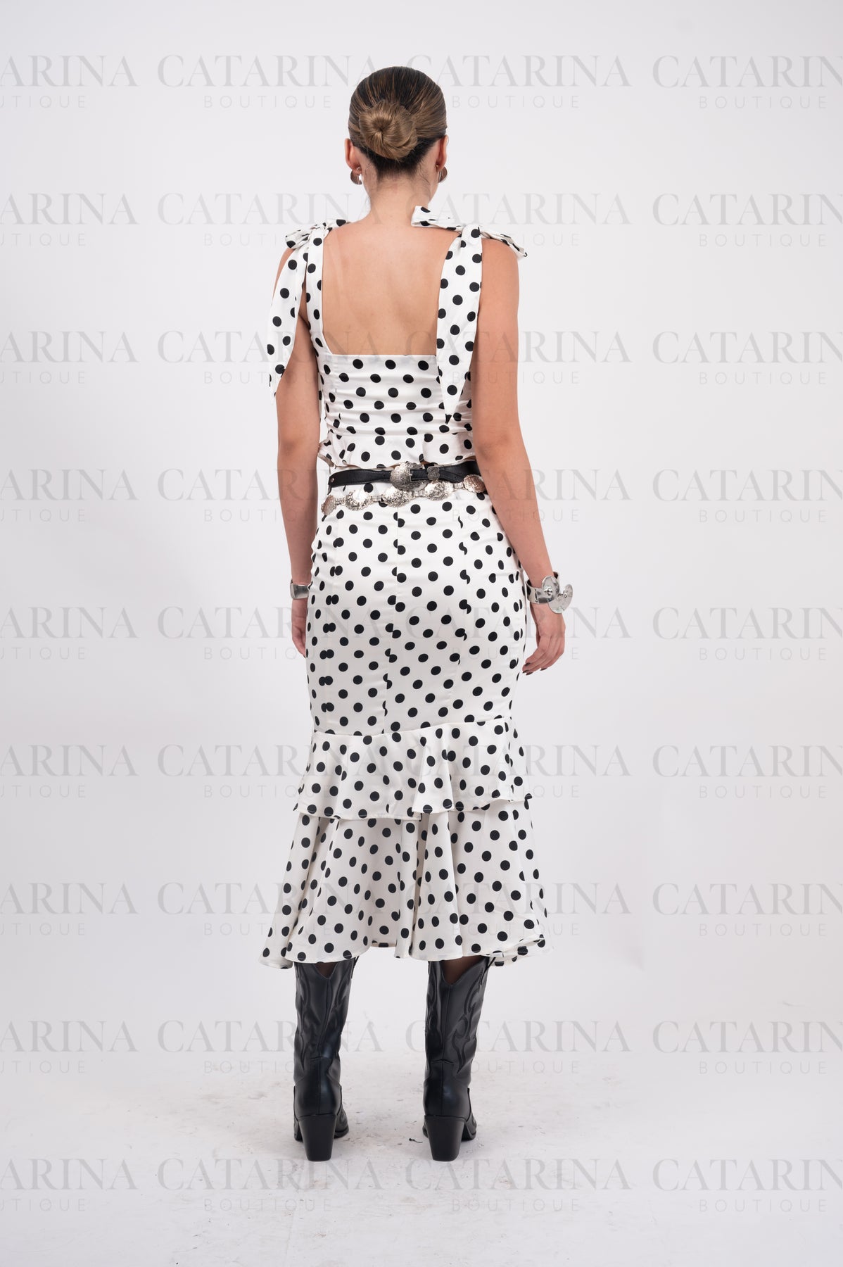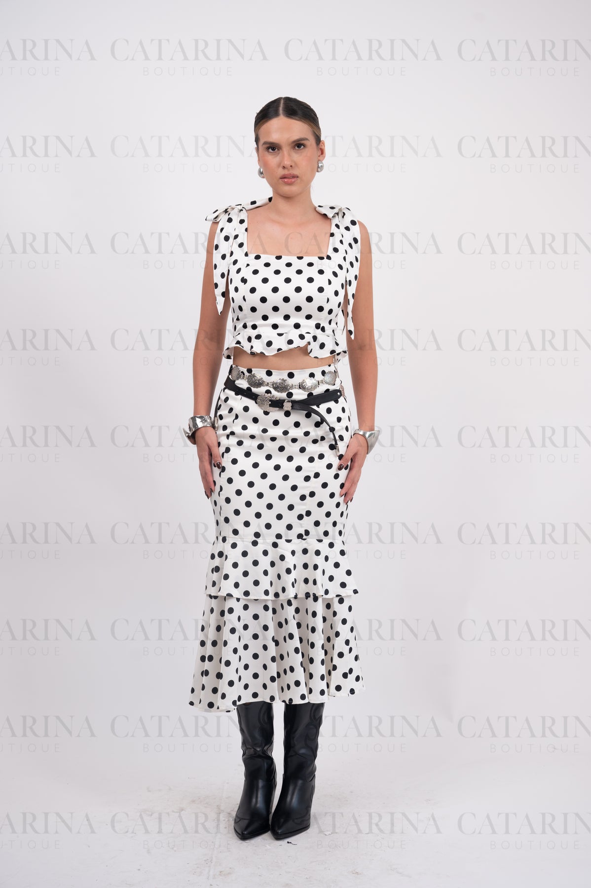 Conjunto de top de escote recto con tirantes gruesos ajustables y una falda larga adornada con un pequeño volante. Detalle de estampado en todo el cuerpo de las prendas.