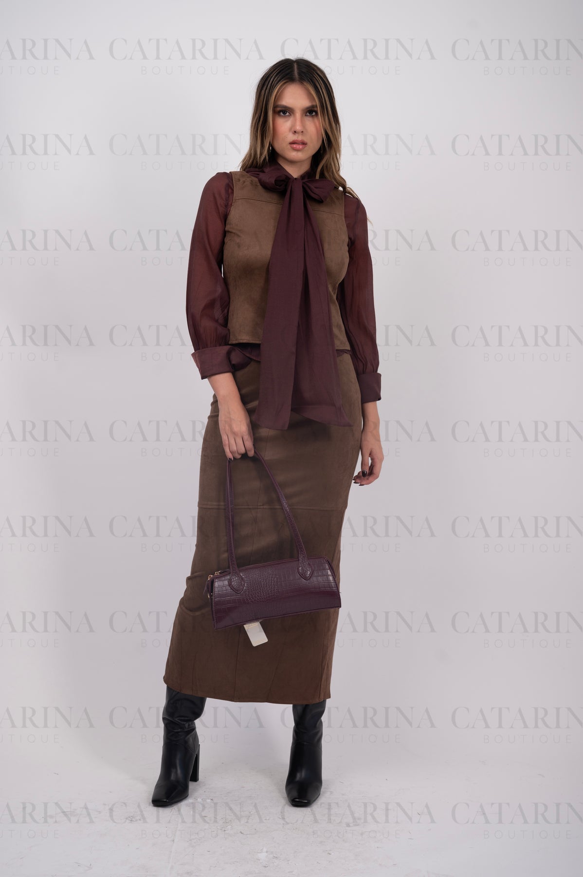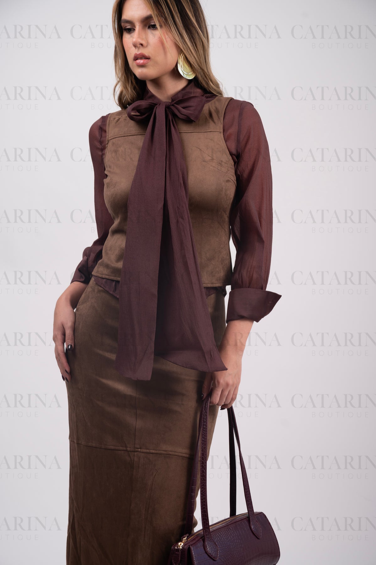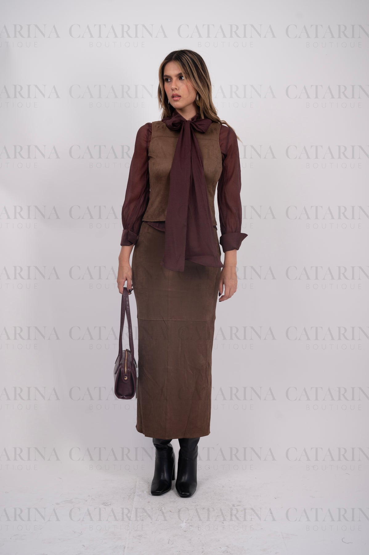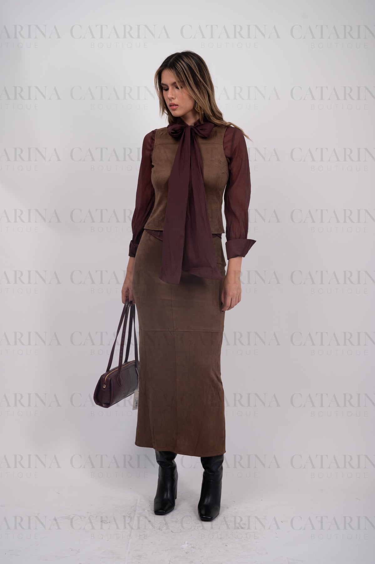 Conjunto de dos piezas. Top con manga tipo sisa, con escote redondo. Cierre visible en espalda. Falda, de corte recto.