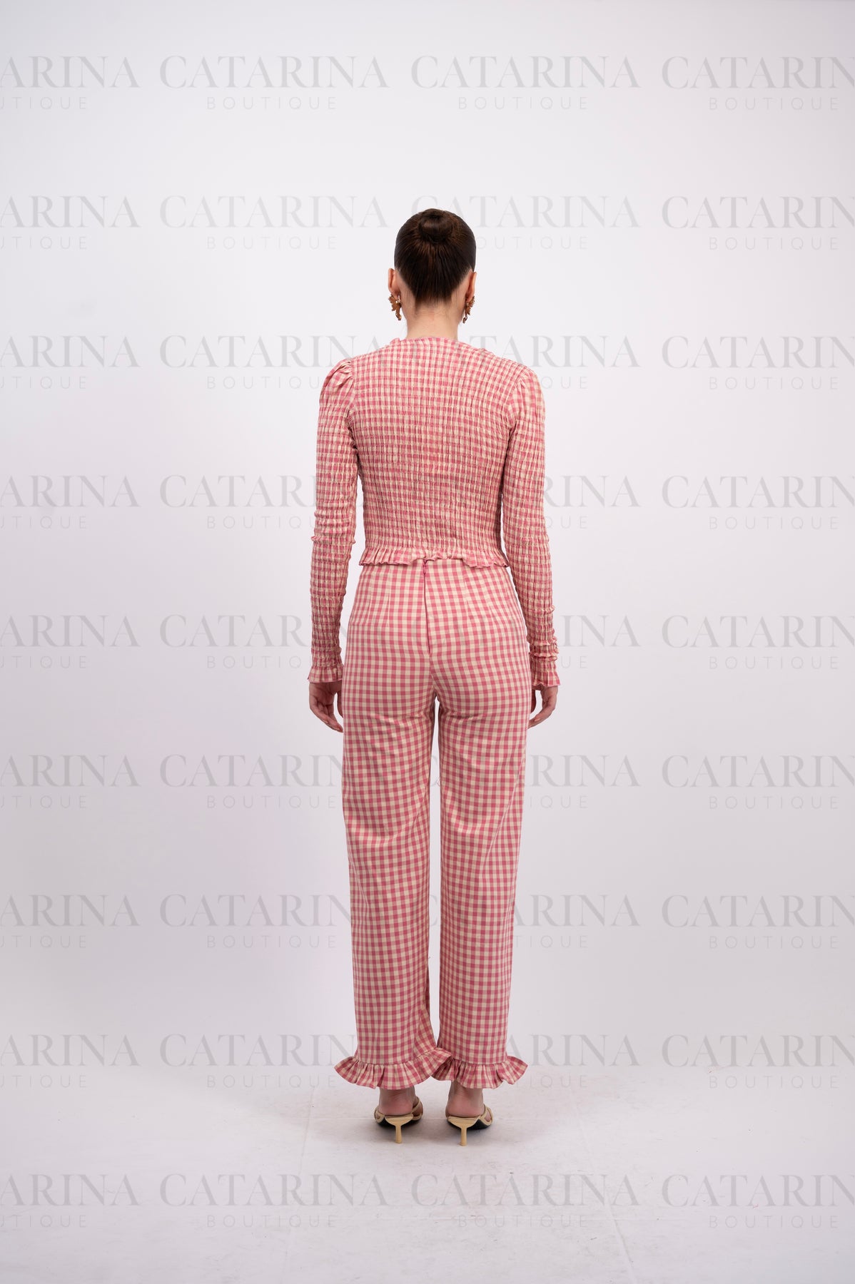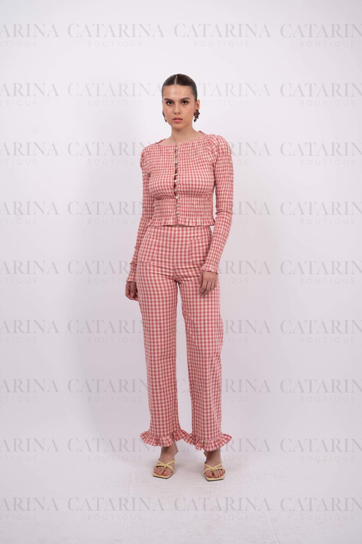 Conjunto de blusa y pantalón con estampado de cuadros pequeños. Blusa de cuello redondo con delicado acabado de olán, manga larga y abotonadura completa al frente. Pantalón de corte recto con detalle de olanes en el bajo que aporta un toque femenino y moderno.