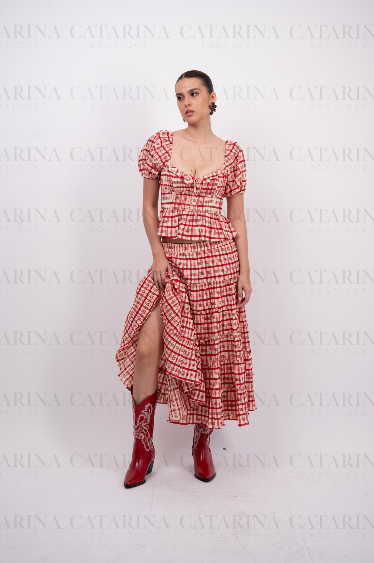 Conjunto de blusa y falda con estampado de cuadros. Blusa de escote tipo corazón con detalle de jareta ajustable al centro y mangas cortas abullonadas. Falda larga de tiro alto con diseño de niveles y volantes que aportan movimiento.