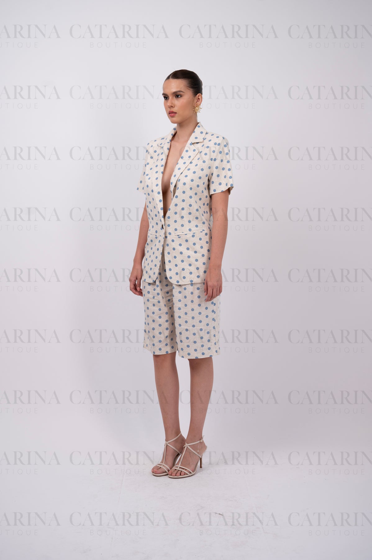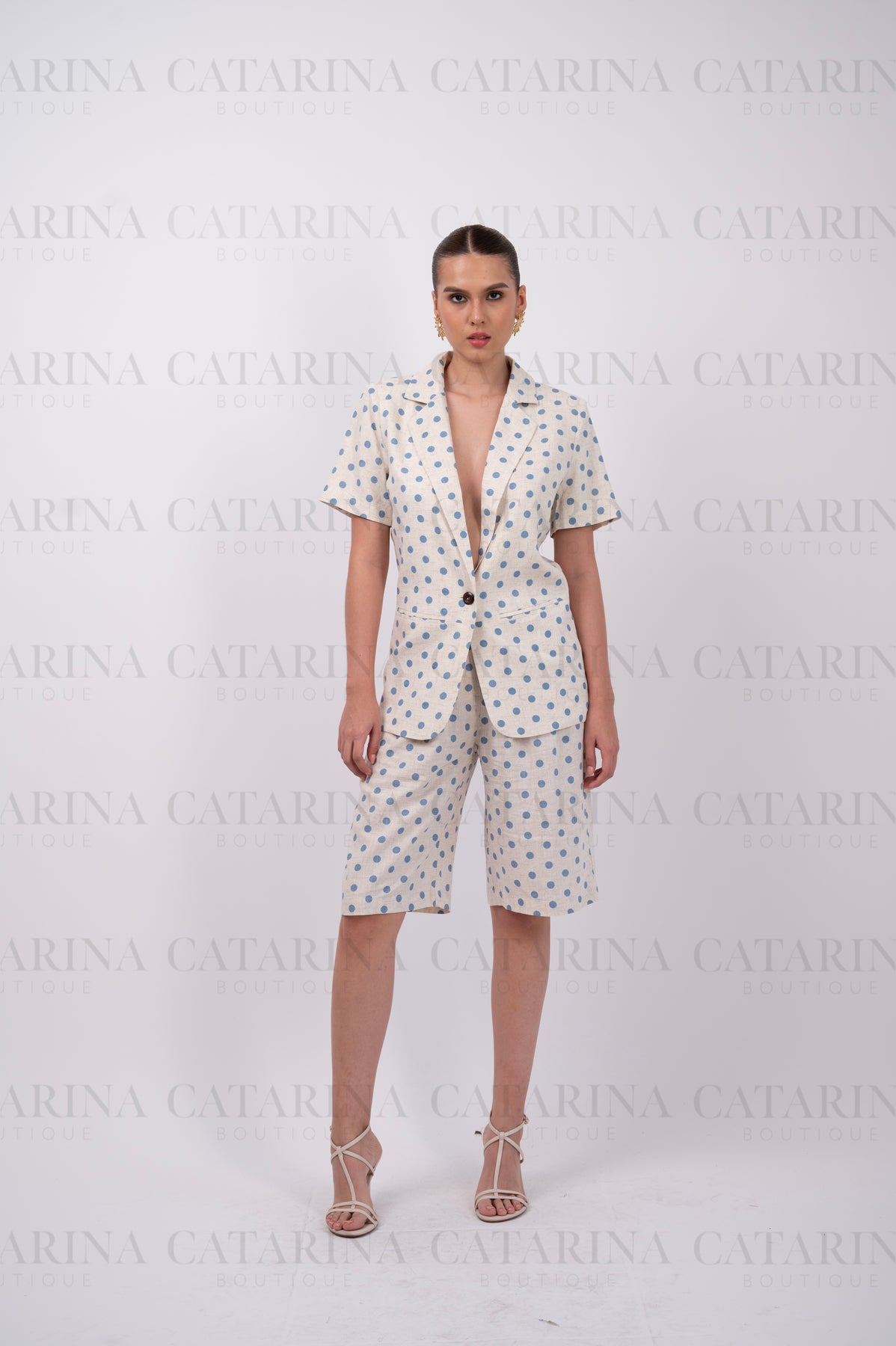Conjunto de dos piezas. Blusa de corte clásico, con solapas de pico. Manga corta. Short a juego. Bajo acabado recto.