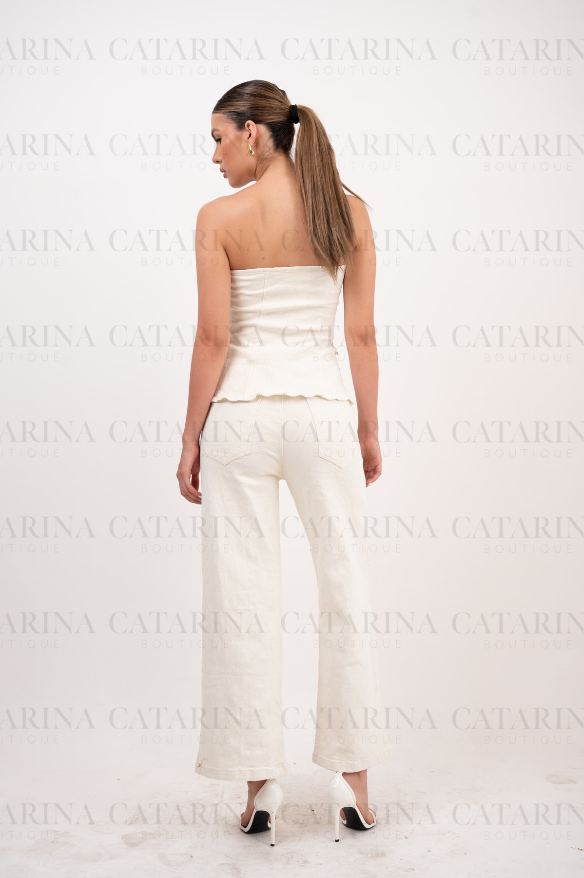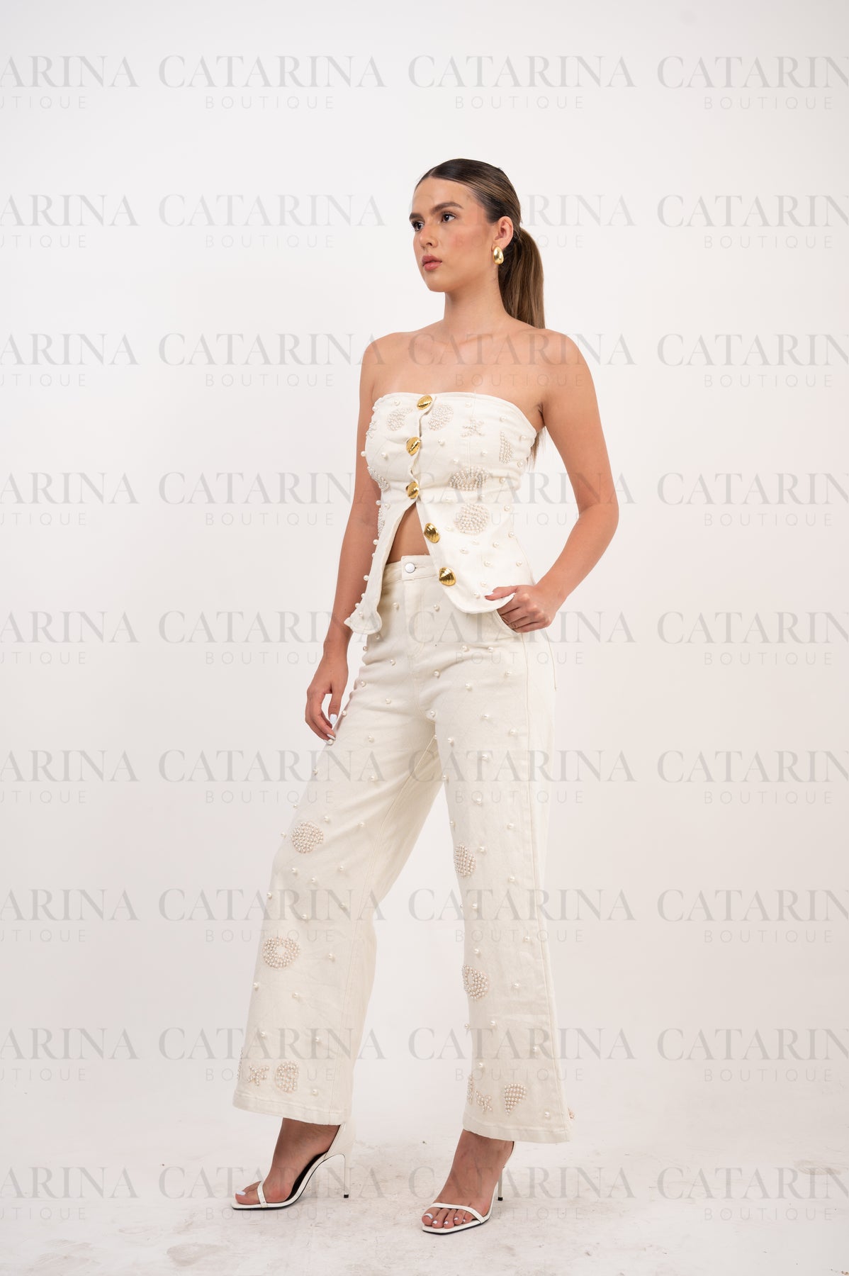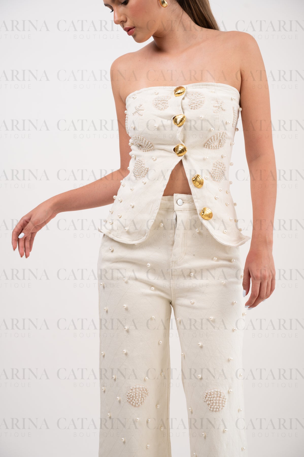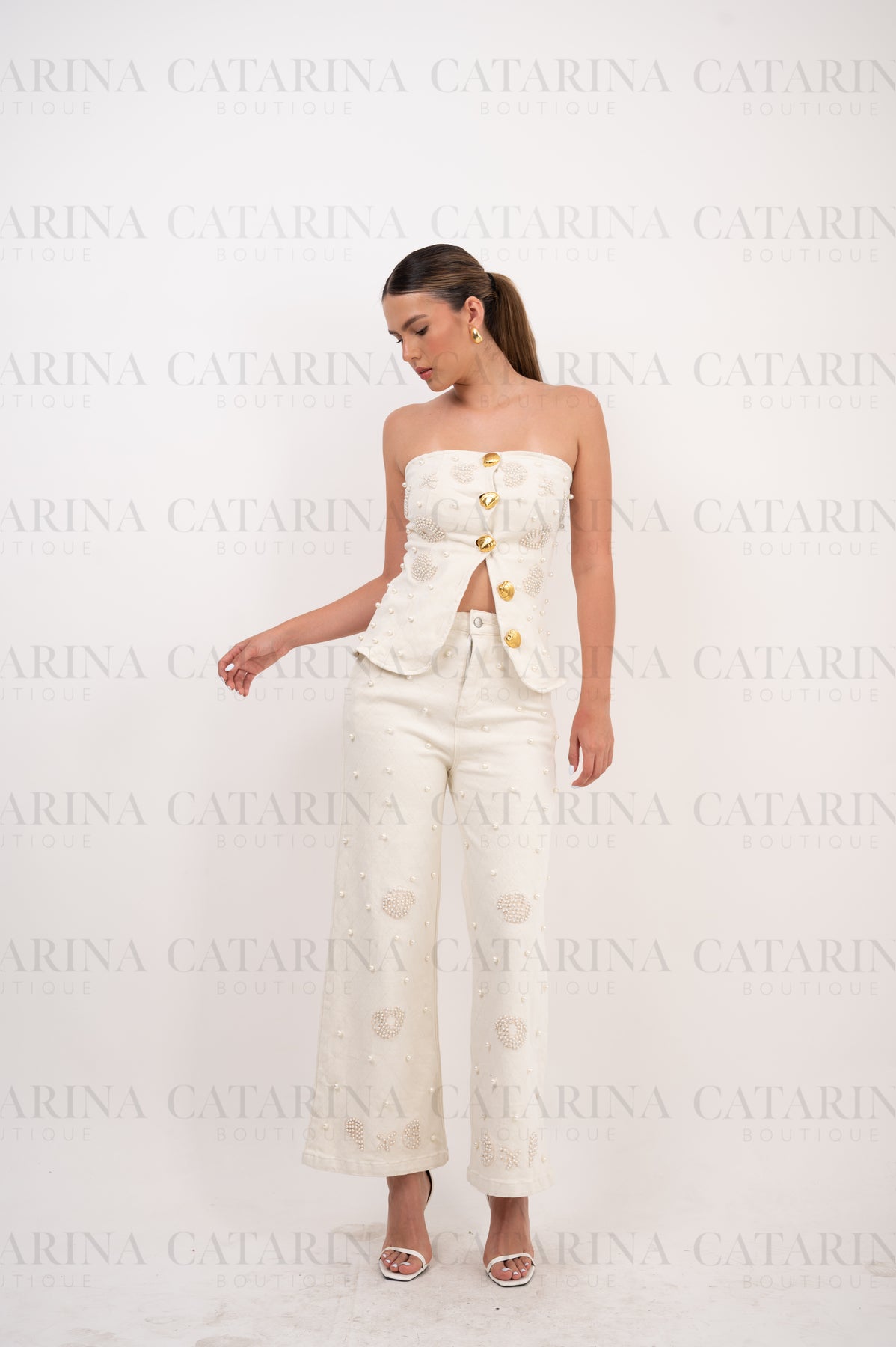 Conjunto de top y pantalón. Top strapless. Pantalón liso de tiro alto. Bajo acabado recto. Detalle de perlitas.