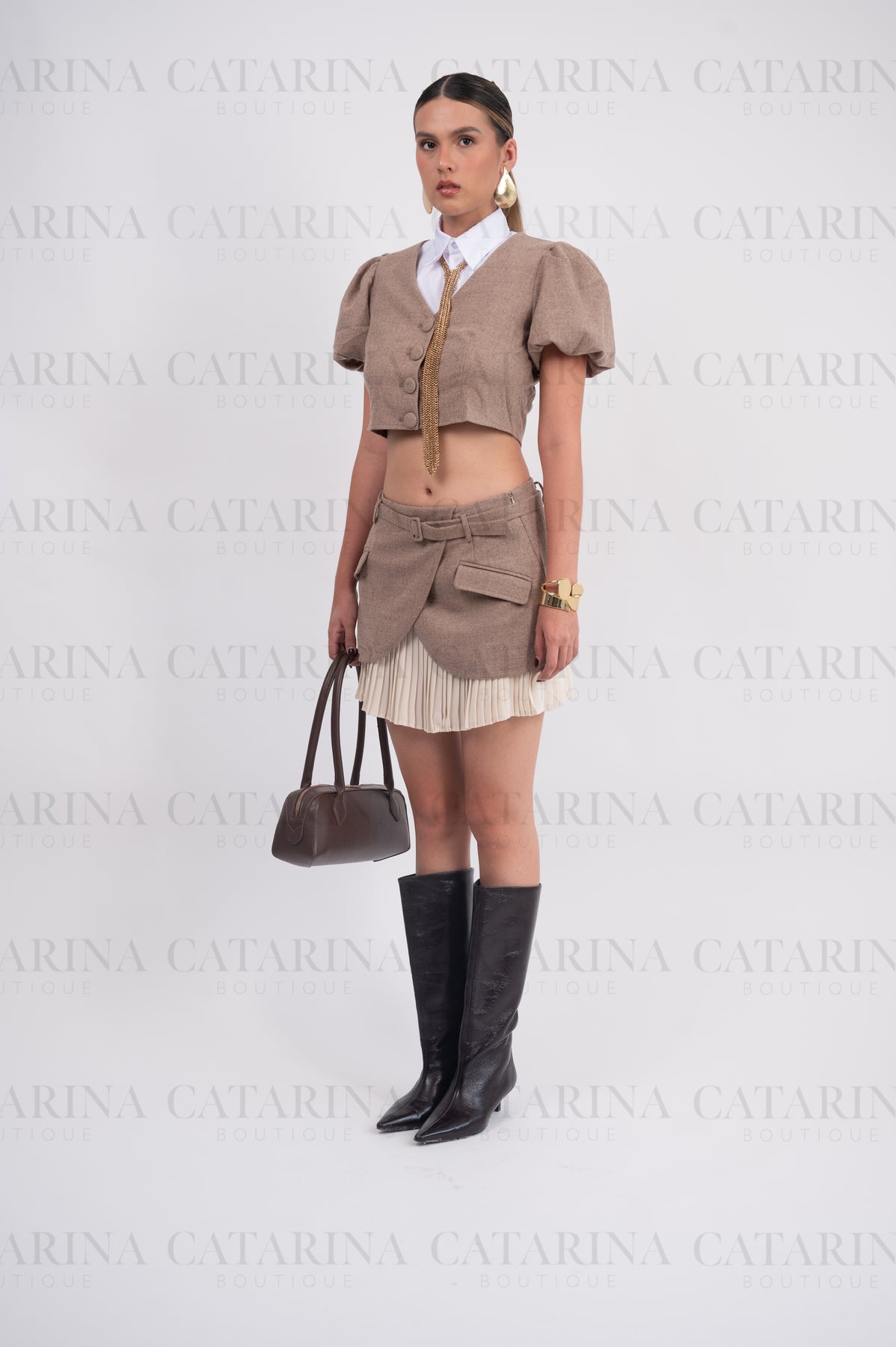 Conjunto de blusa y falda. Blusa de escote pronunciado. Botones al frente. Manga corta abullonada. Falda de tiro medio. Bajo acabado recto con detalle de plises.
