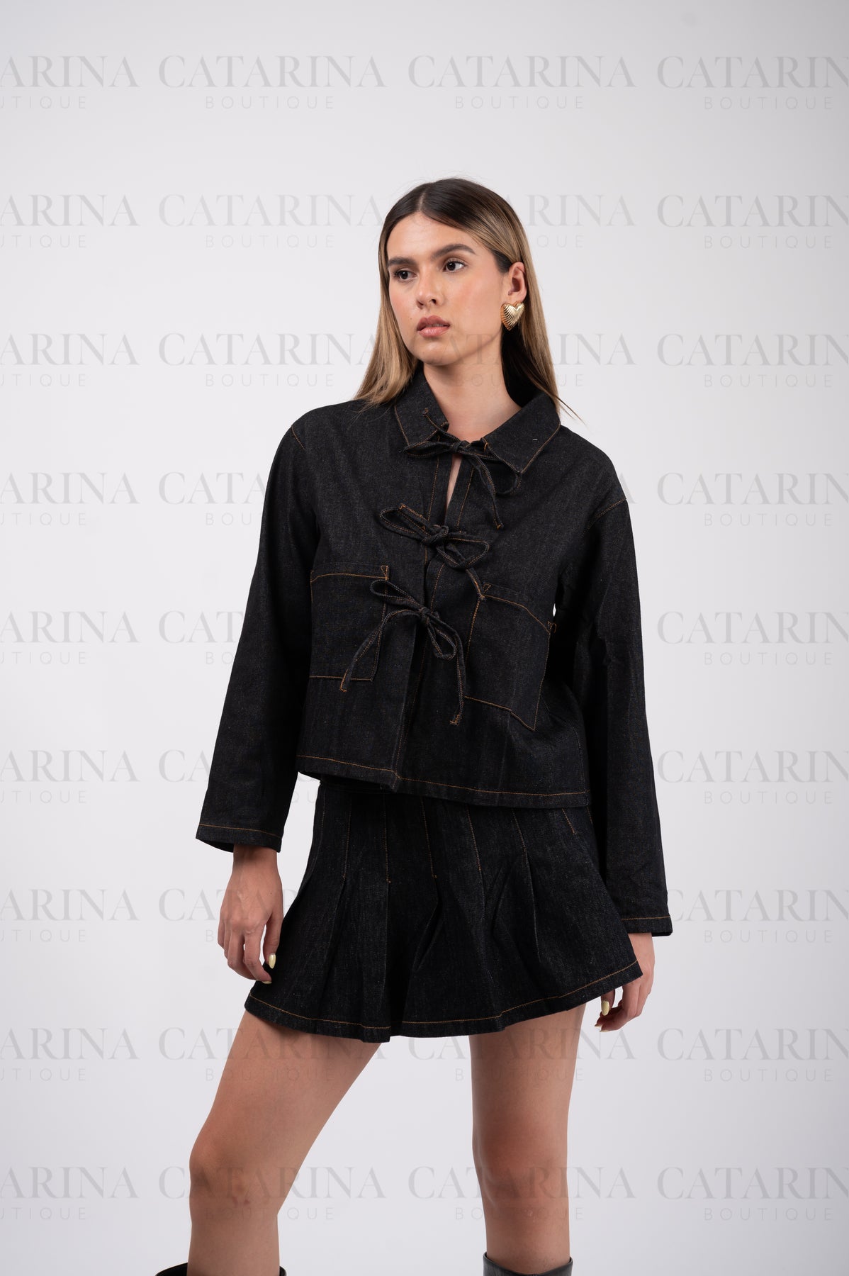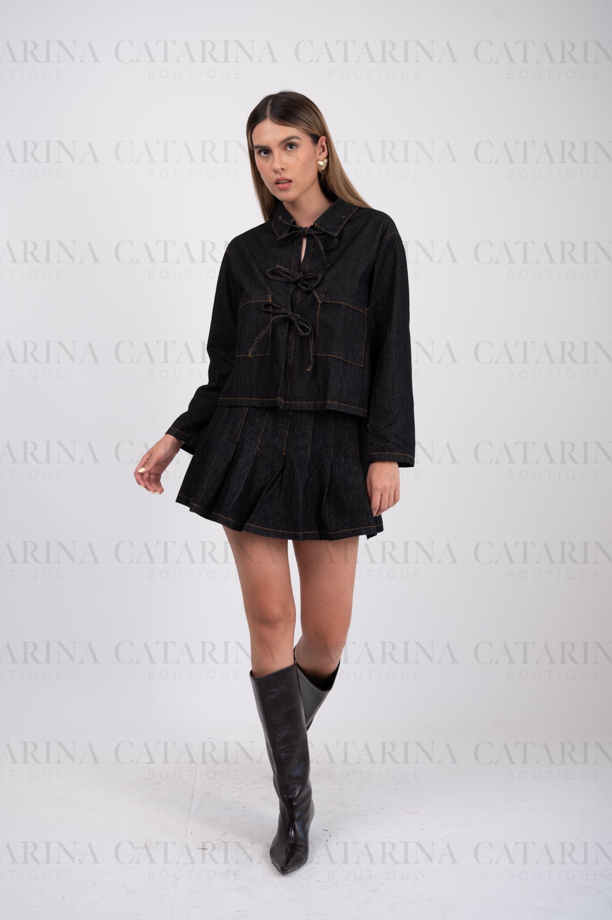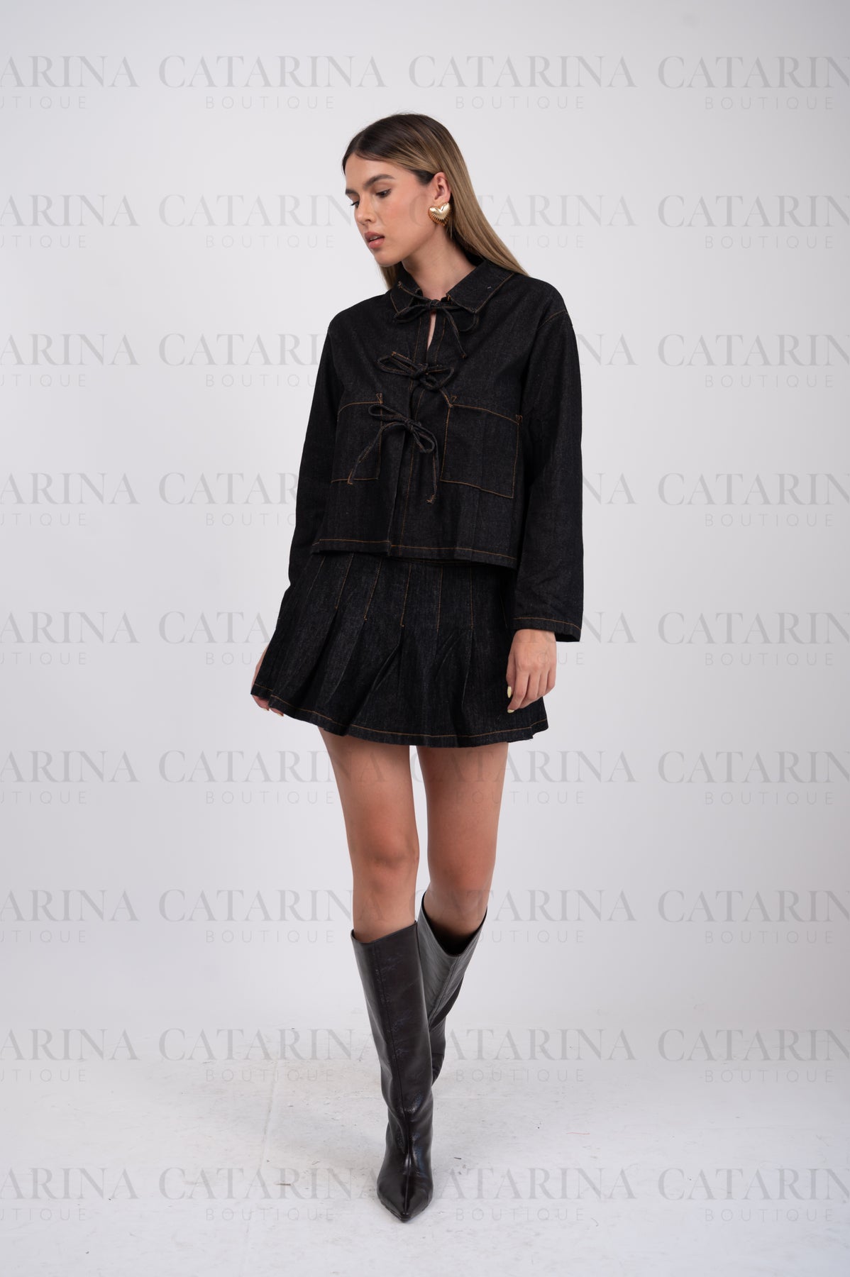 Conjunto de camisa y short-falda. Camisa manga larga. Cuello tipo americano. Botones al frente. Short-falda de tiro alto. Bajo acabado recto.