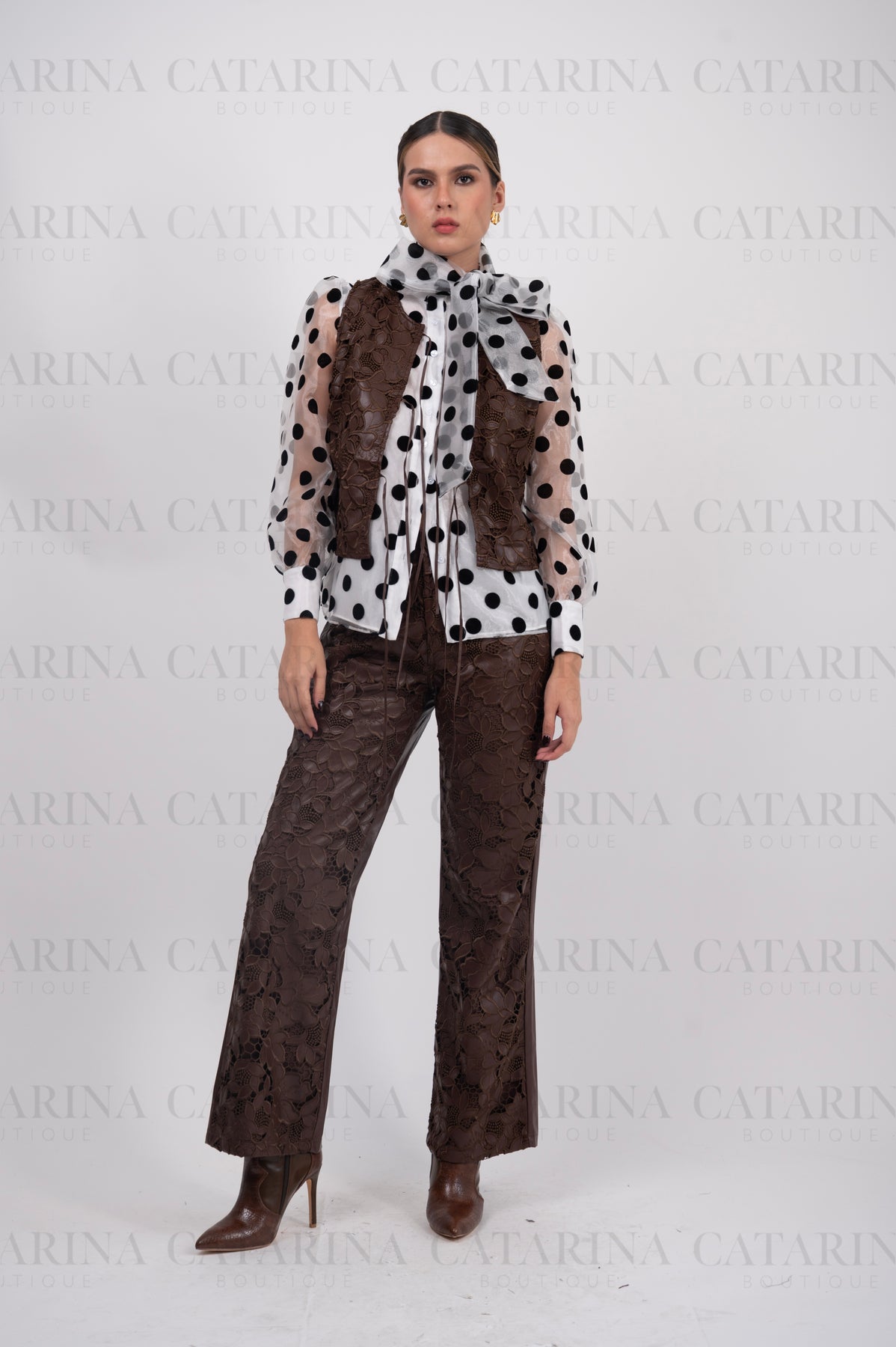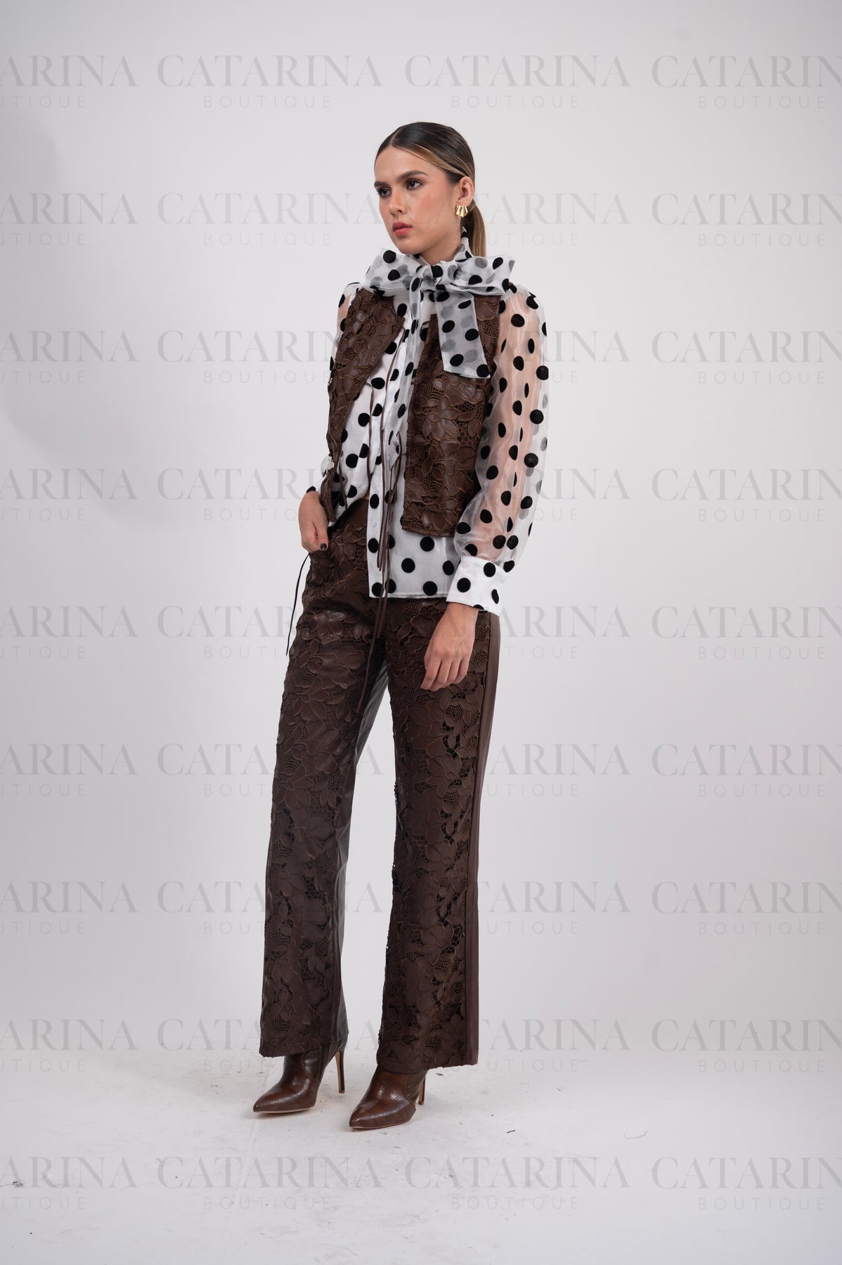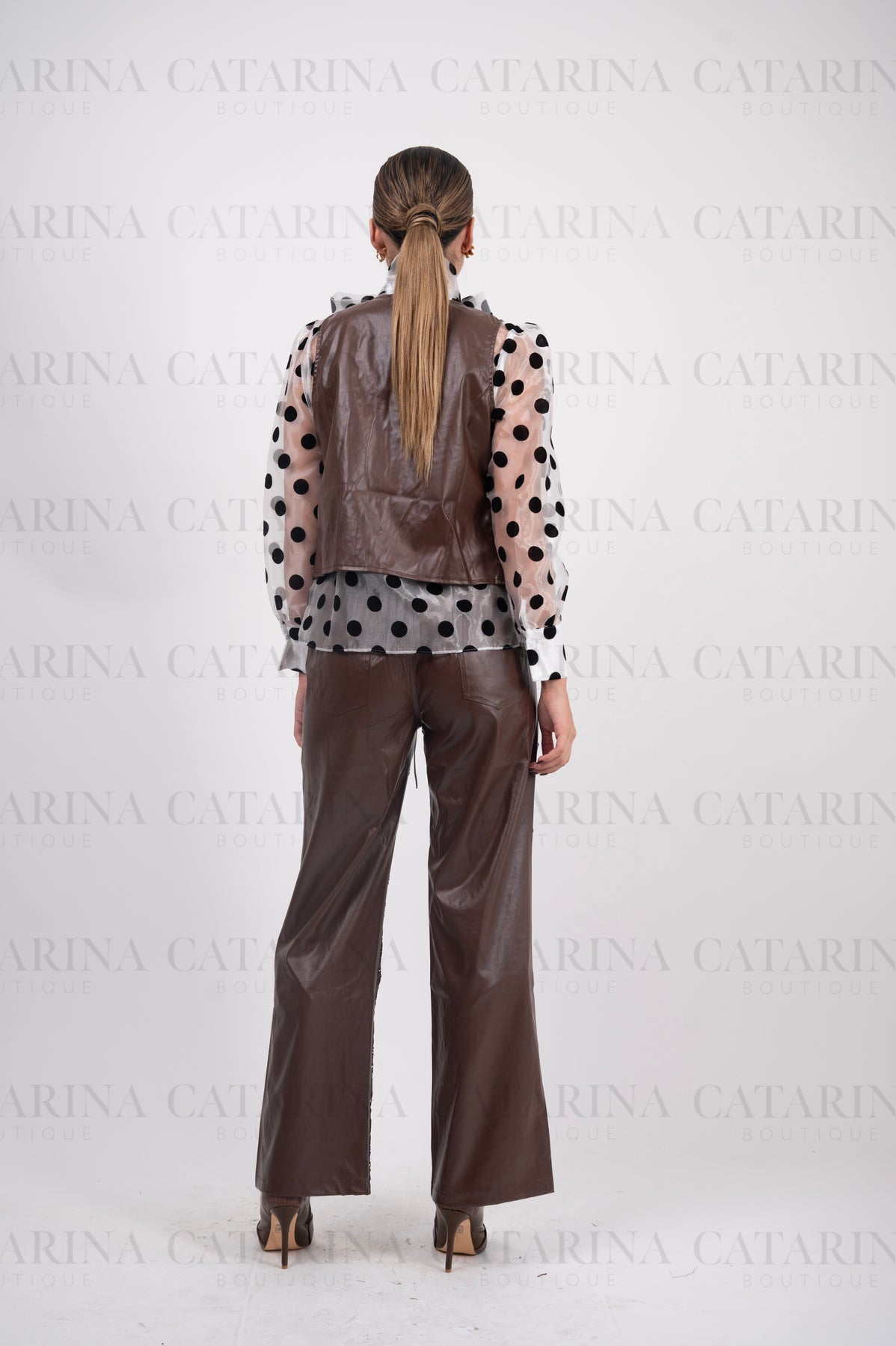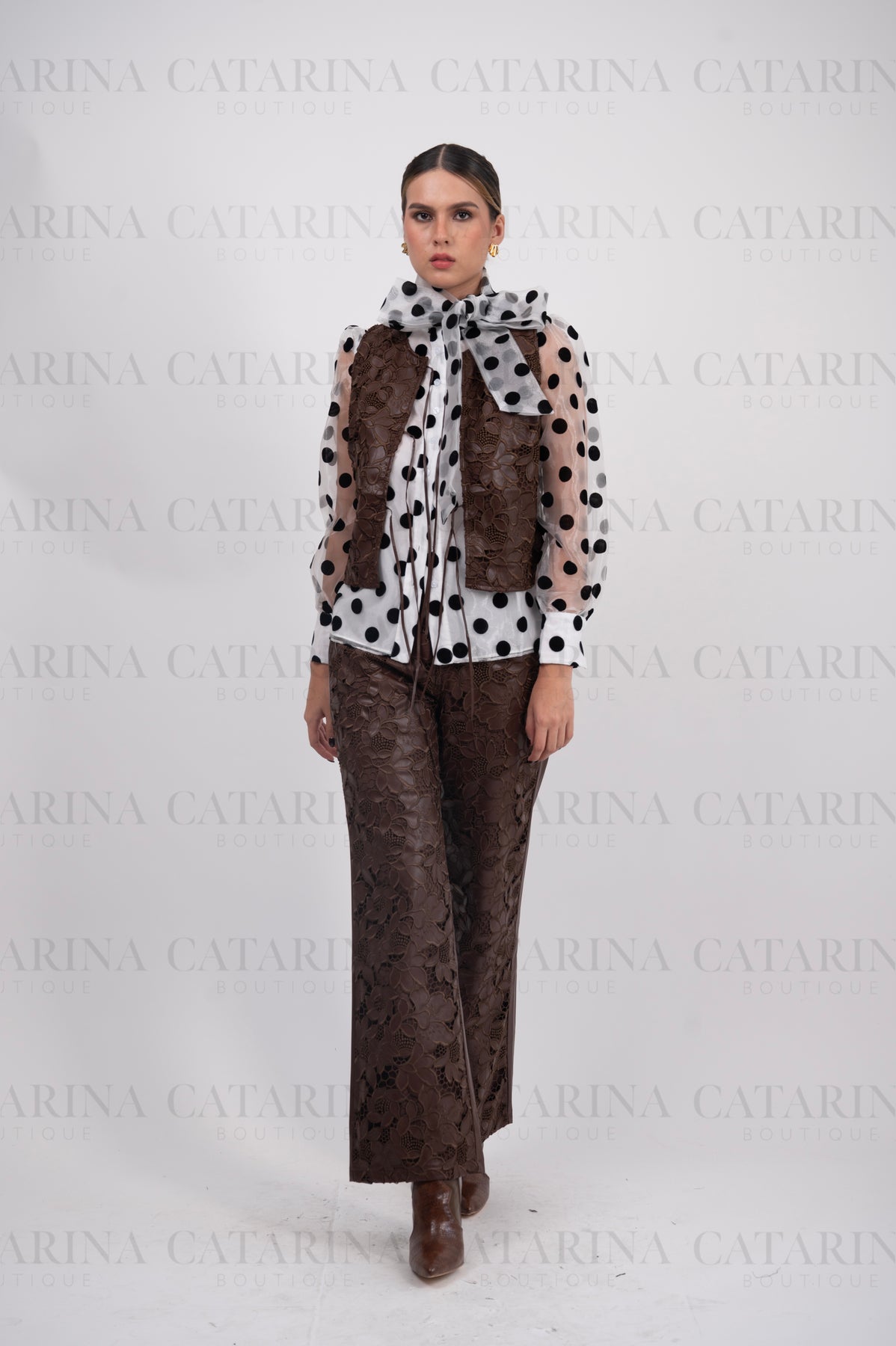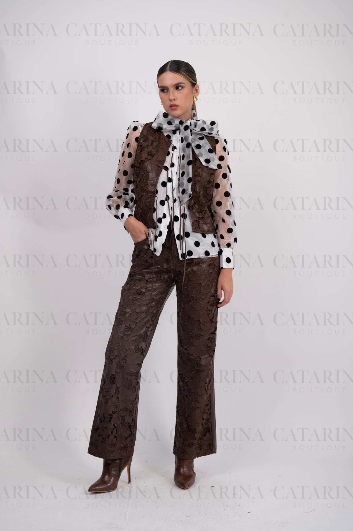 Conjunto de dos piezas. Chaleco de mangas tipo sisa y con abertura frontal, que incluye lazadas de ajuste en la parte inferior. Pantalón liso de tiro alto. Bolsillos ocultos en los costados.