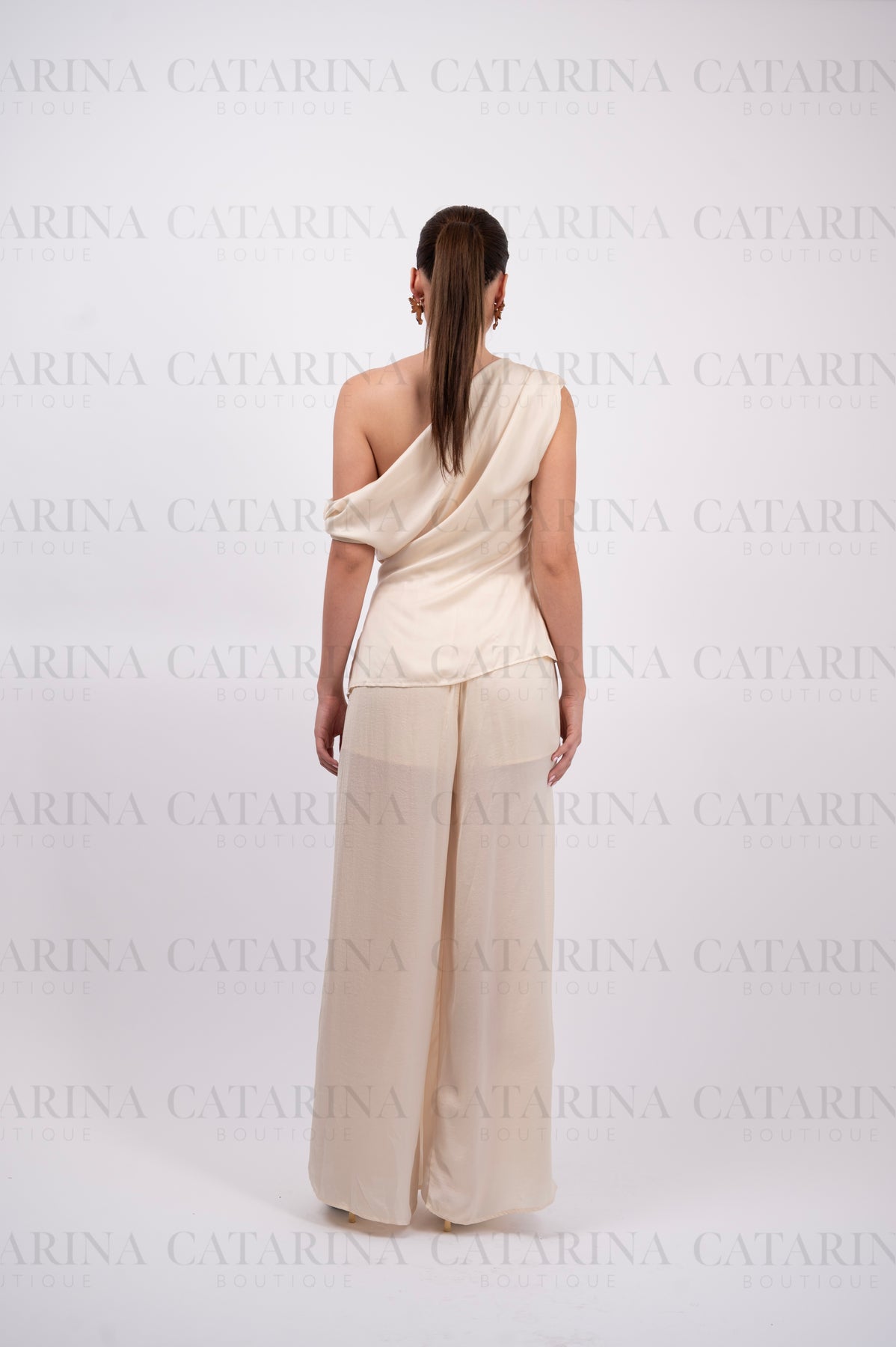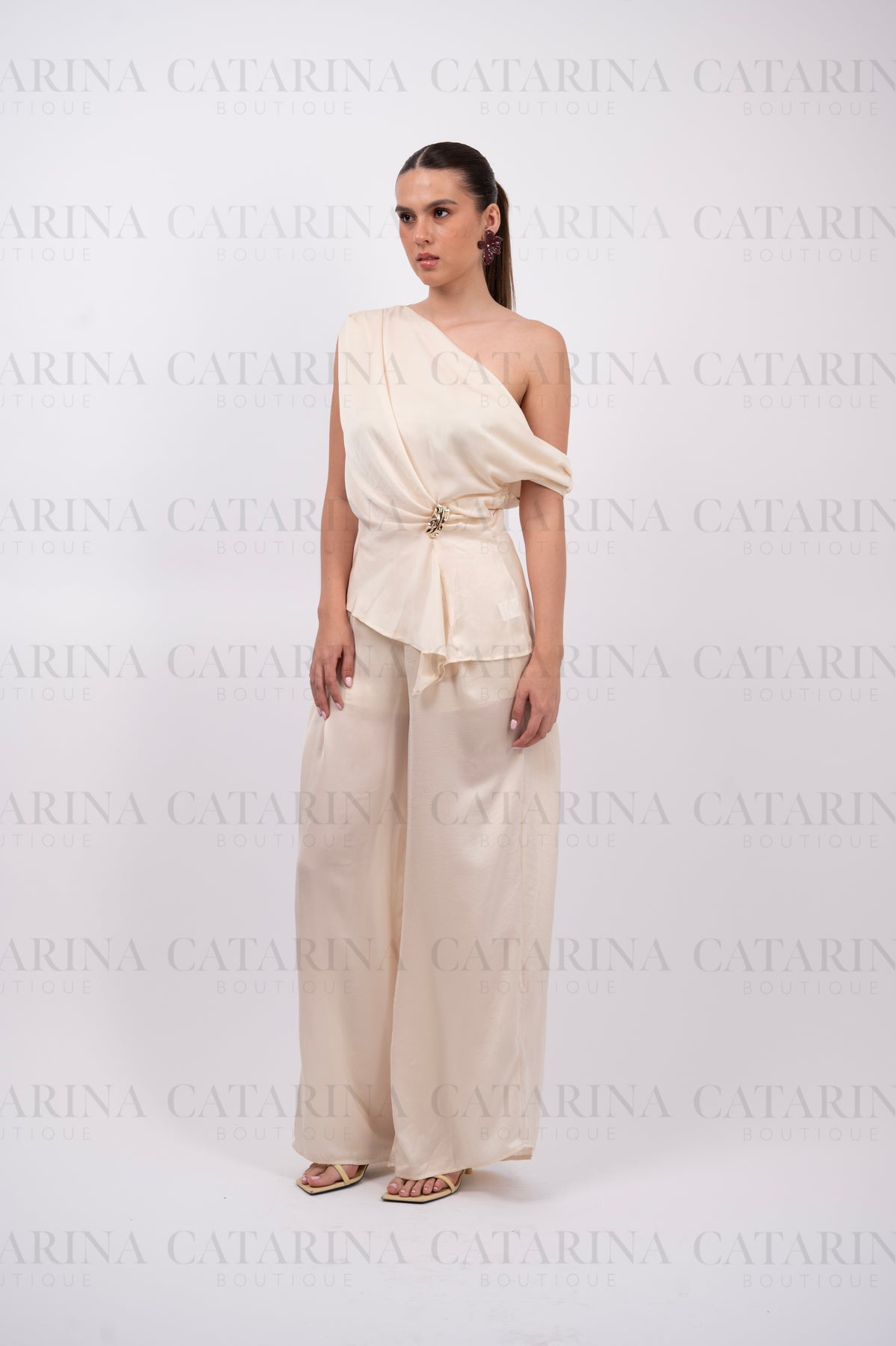 Elegante conjunto de dos piezas. El top presenta un sofisticado diseño drapeado al frente que crea pliegues fluidos y se ajusta con un delicado broche lateral en tono dorado. El pantalón coordinado es de tiro alto y silueta de pierna ancha, ofreciendo un look monocromático que exuda lujo y comodidad absoluta para eventos de gala o cenas especiales.