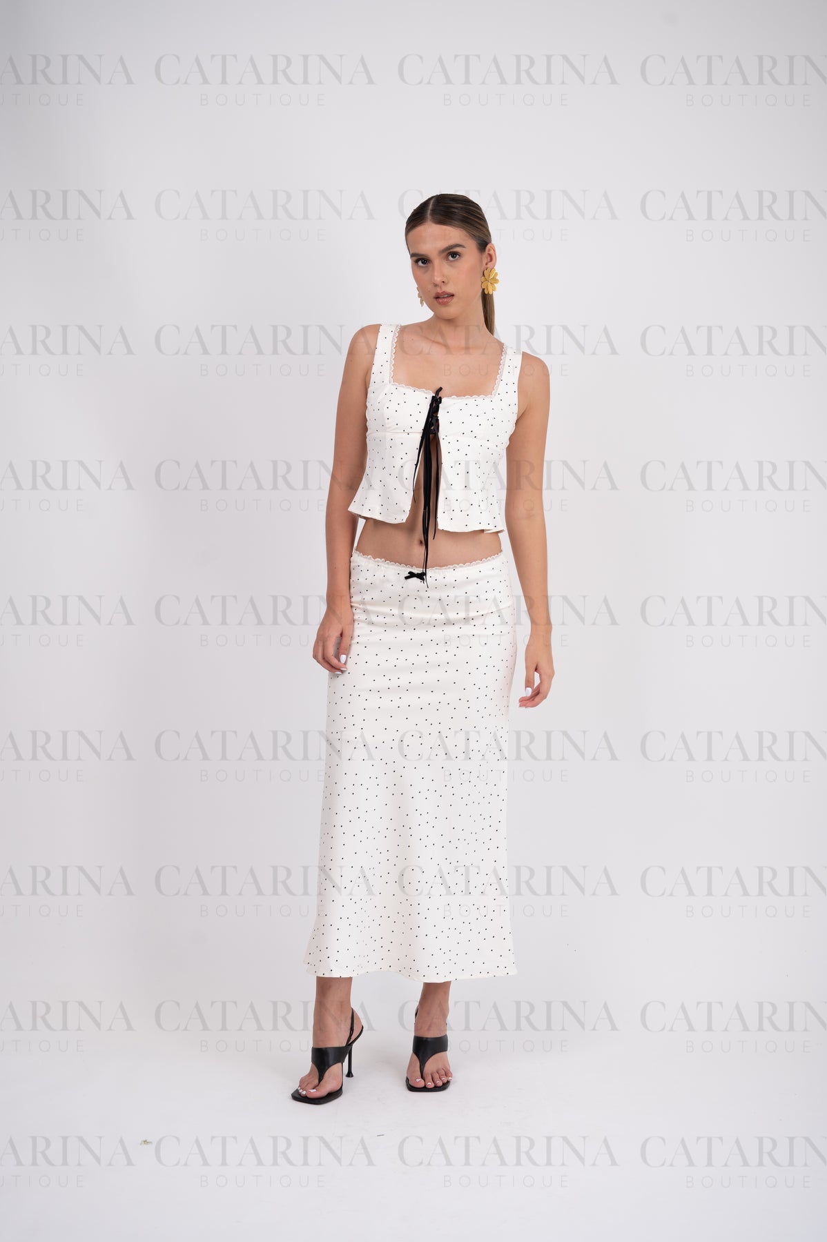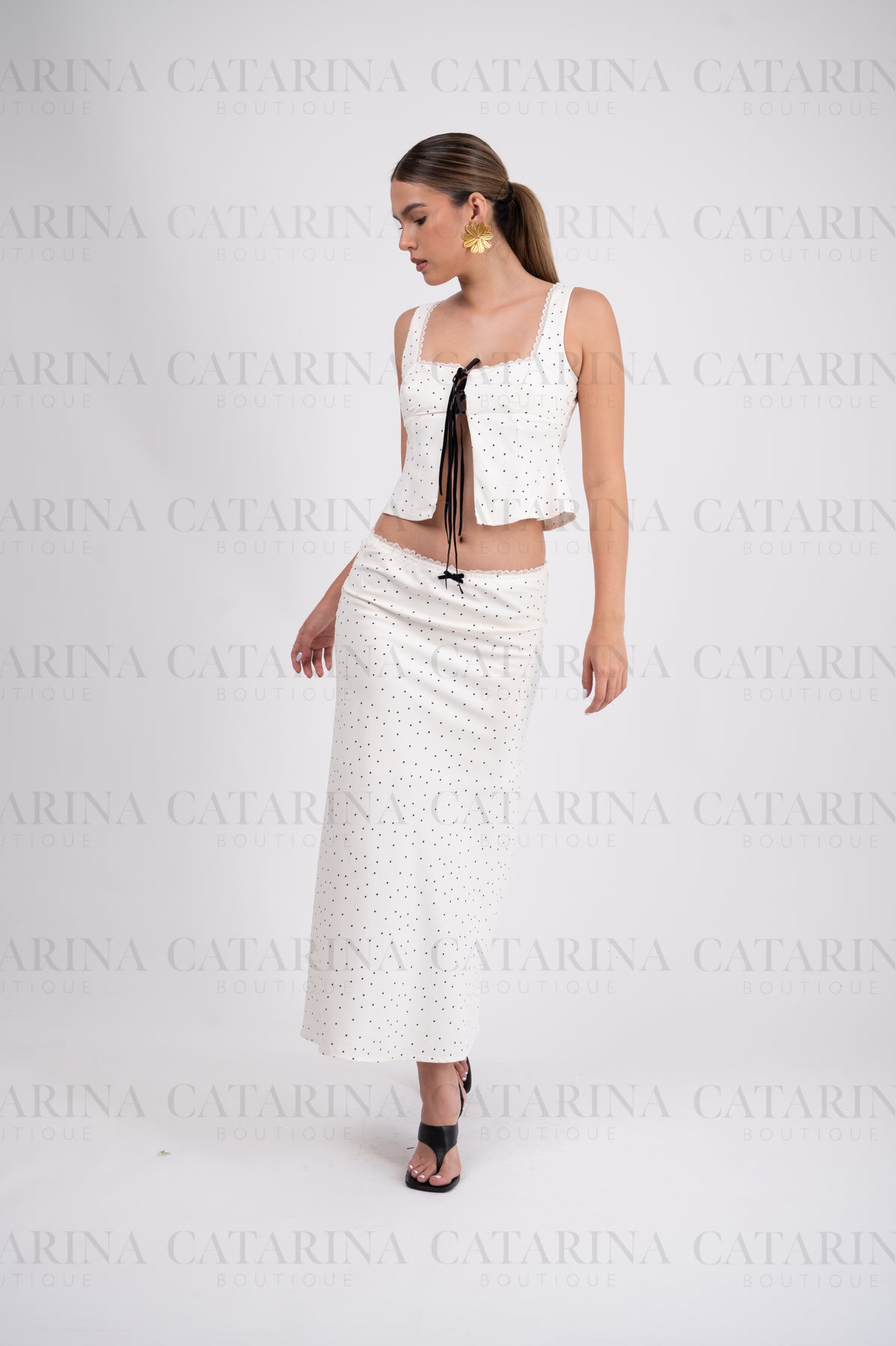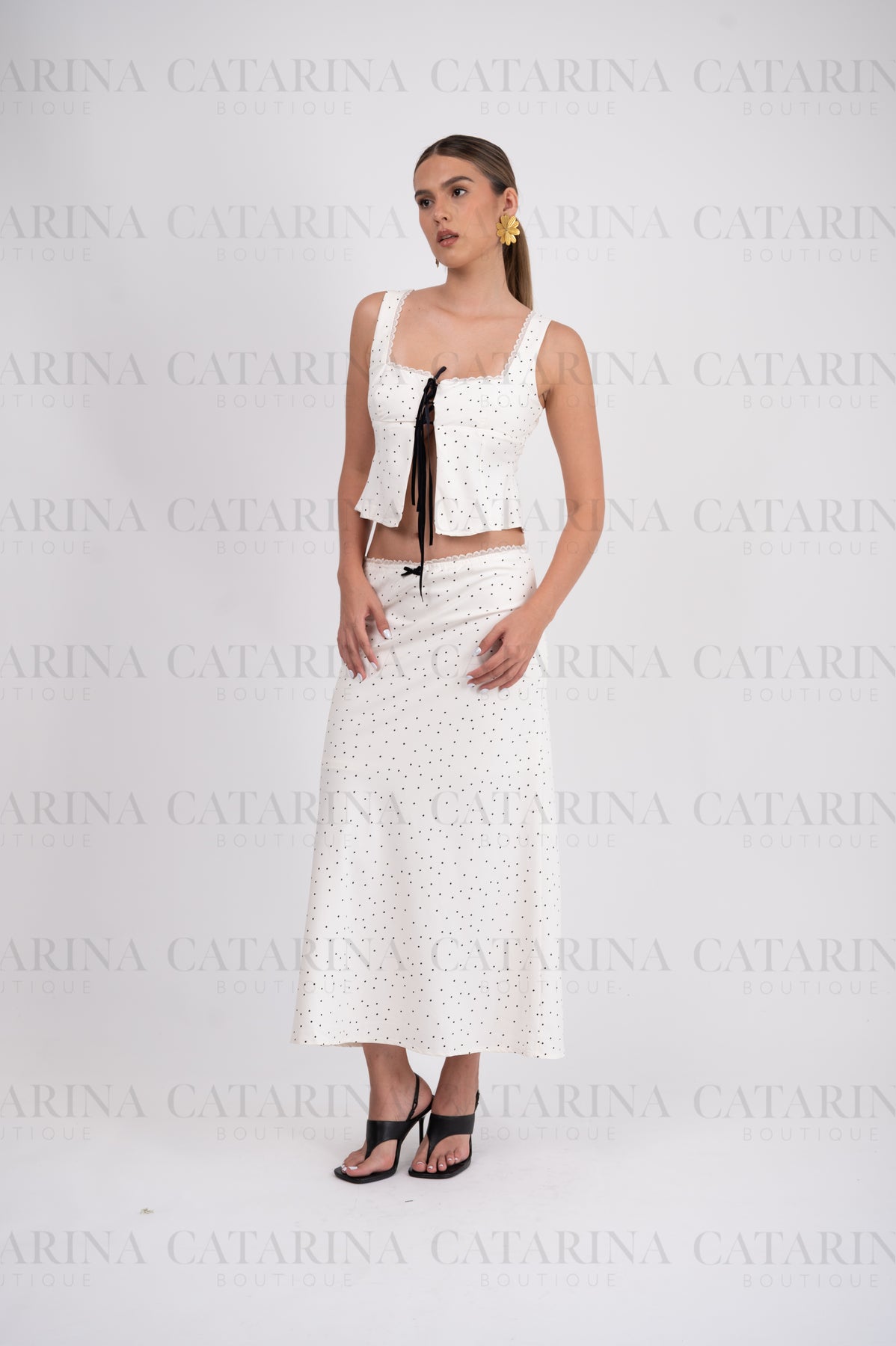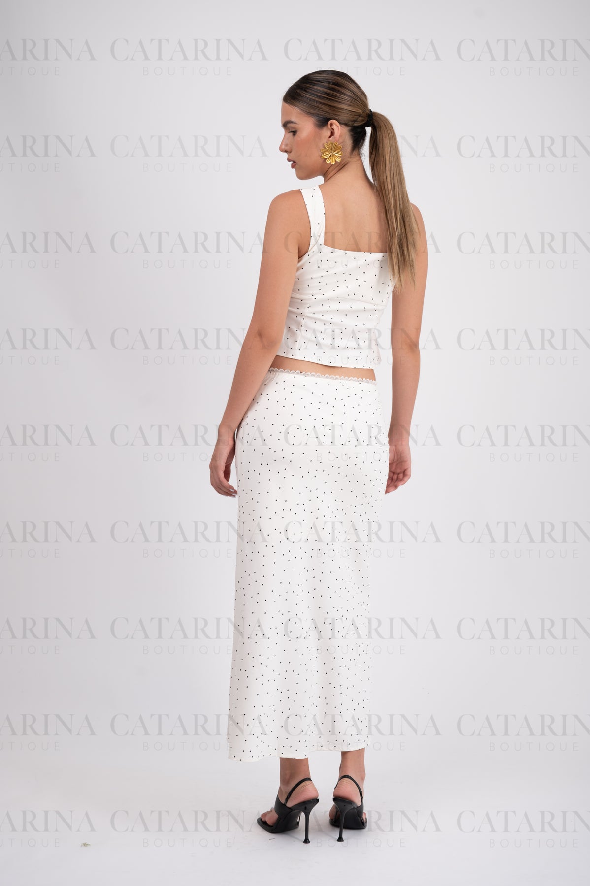Conjunto de top de escote recto con tirantes gruesos y una falda larga adornada con un pequeño volante. Detalle de estampado en todo el cuerpo de las prendas.