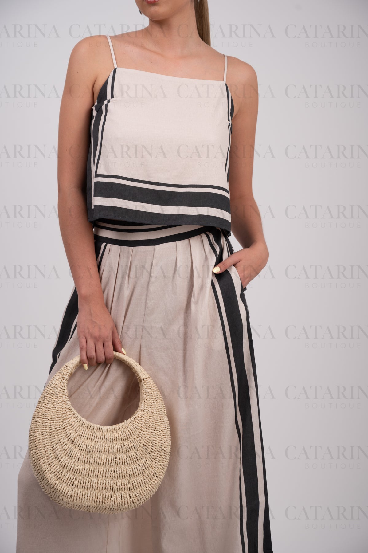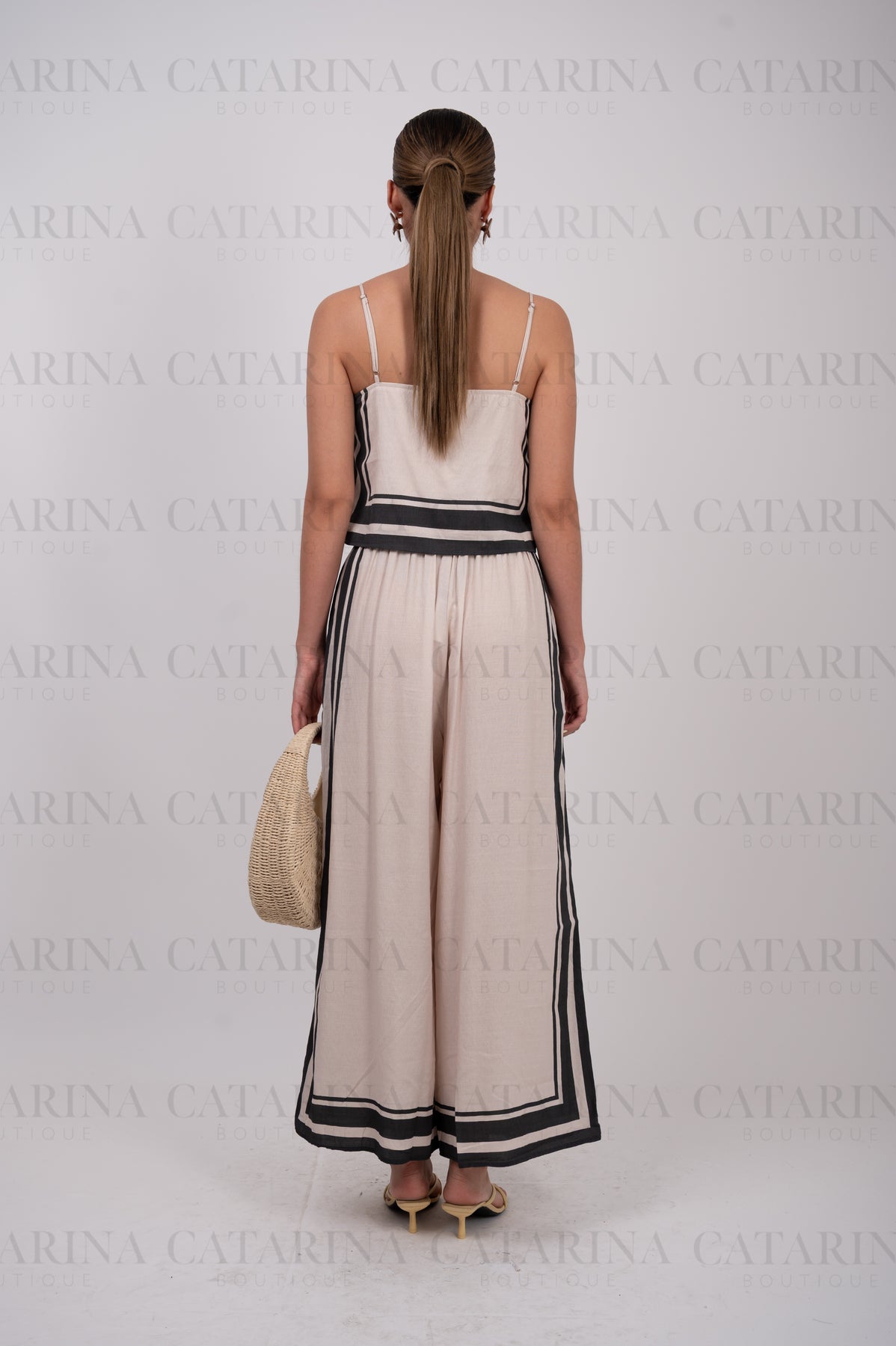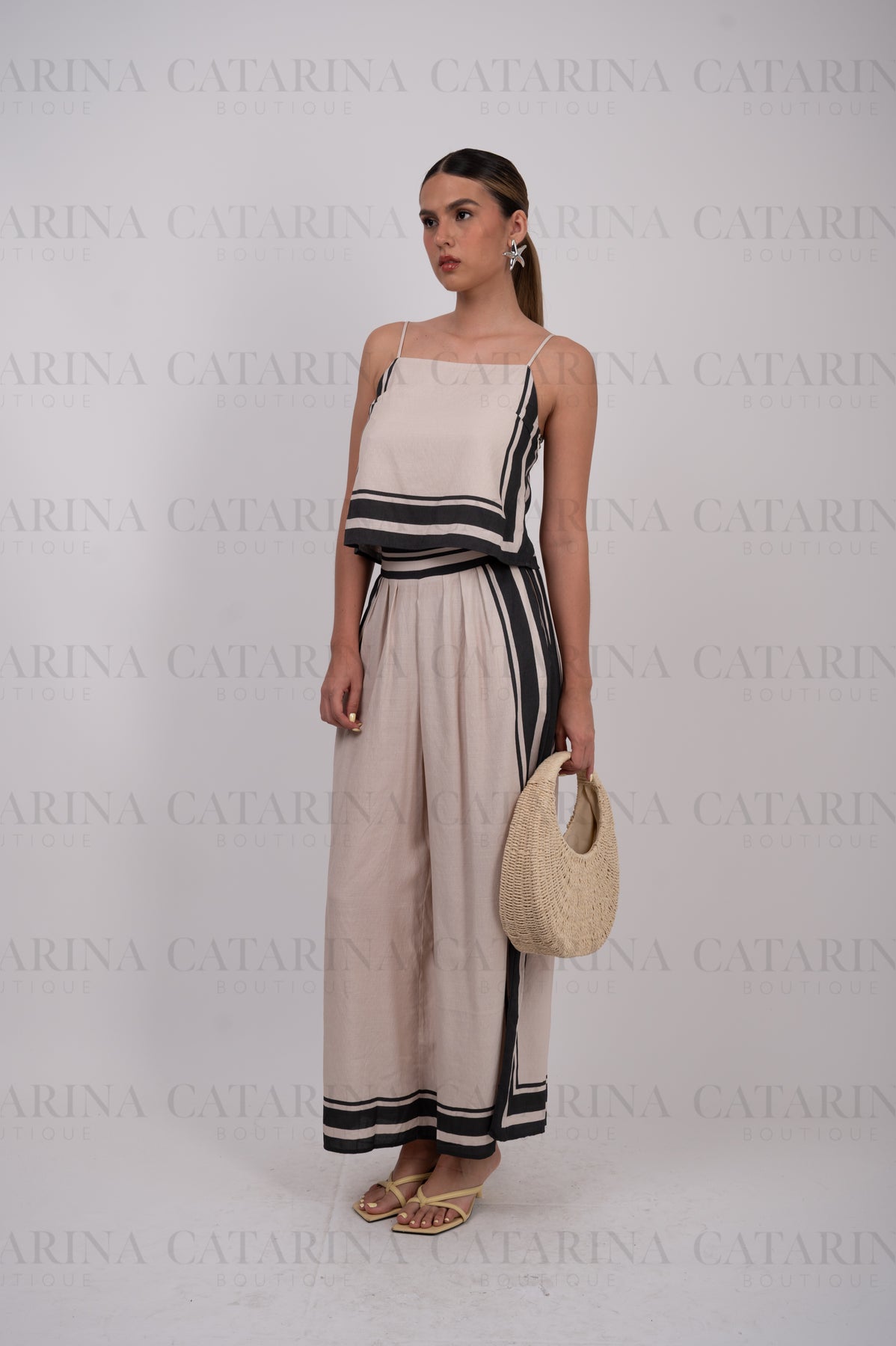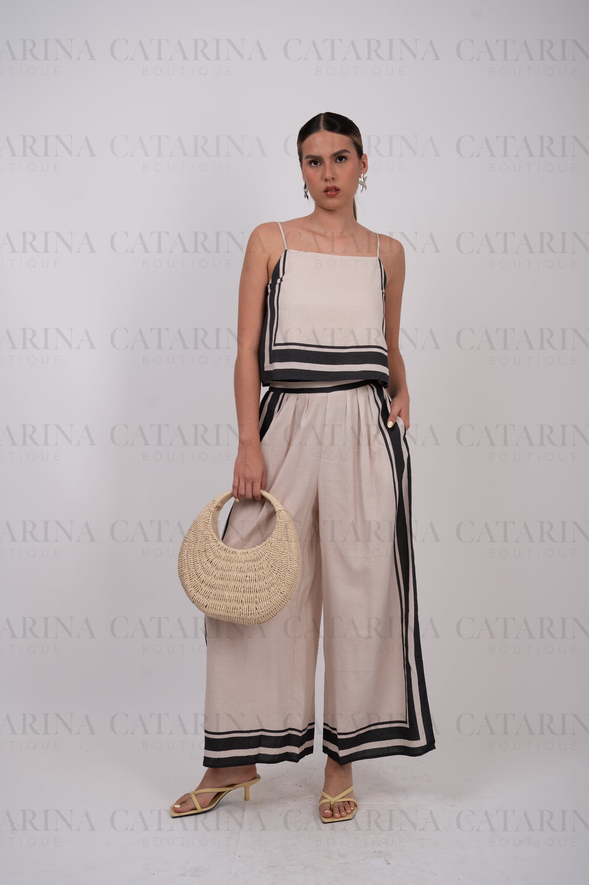 Conjunto de blusa y pantalón. Blusa de tirantes delgados ajustables. Escote recto. Pantalón de tiro alto. Bajo acabado recto.