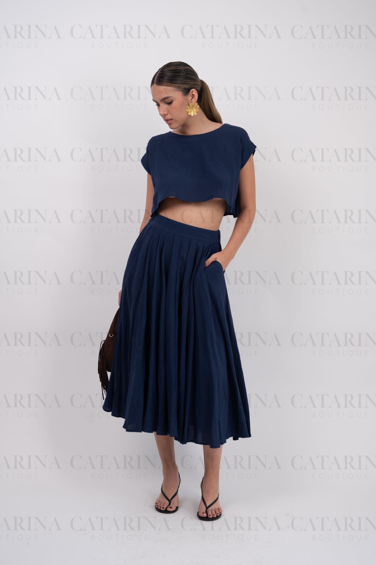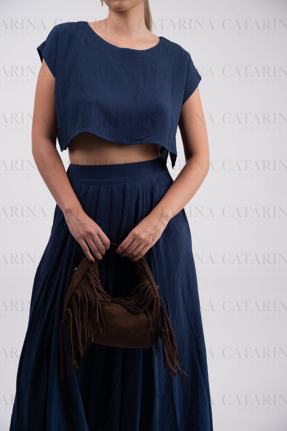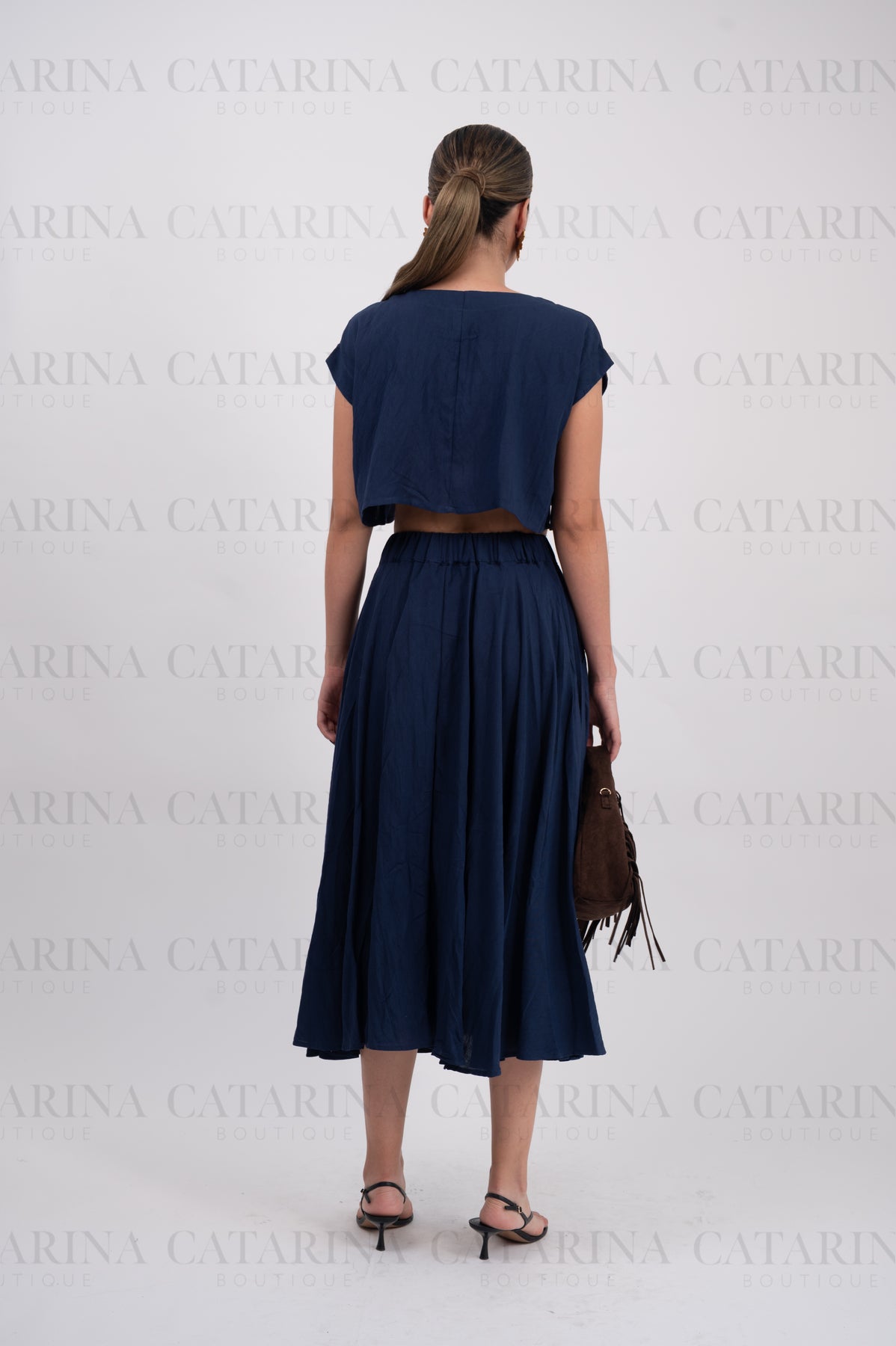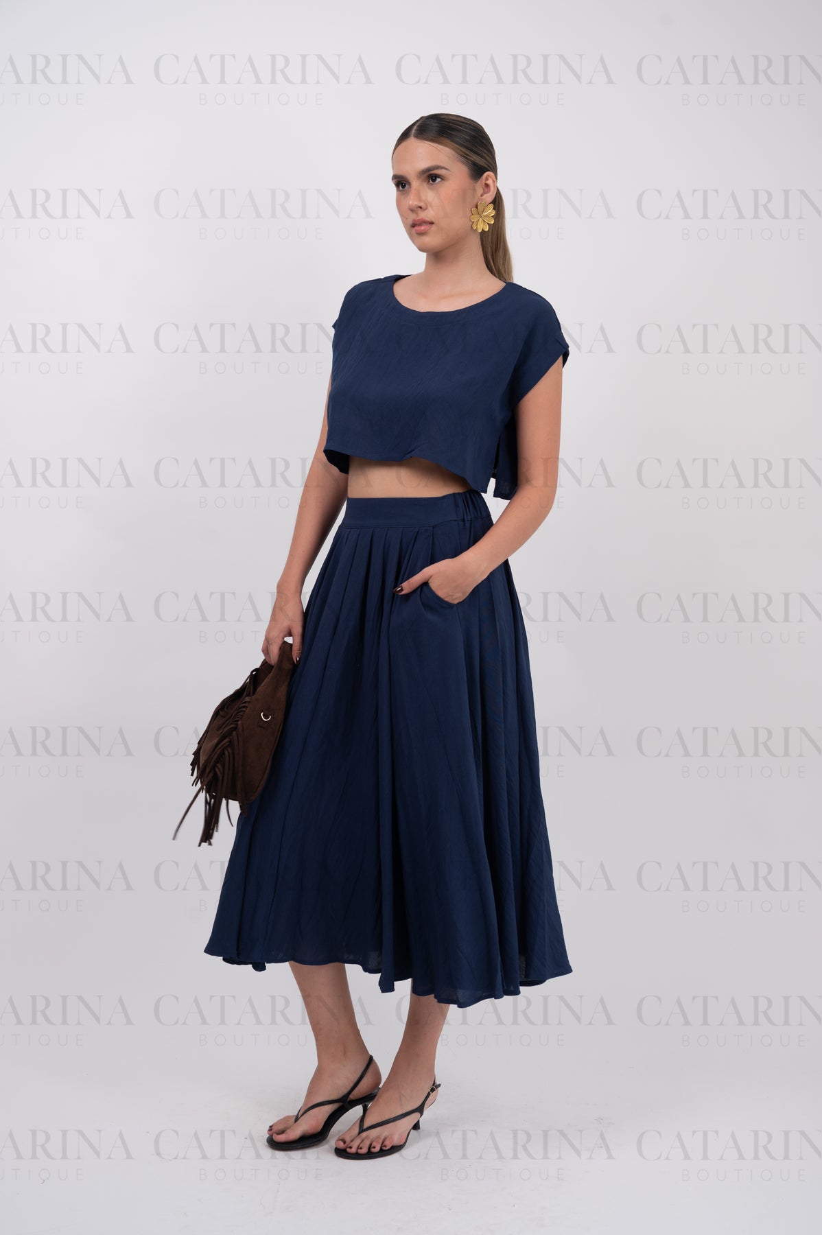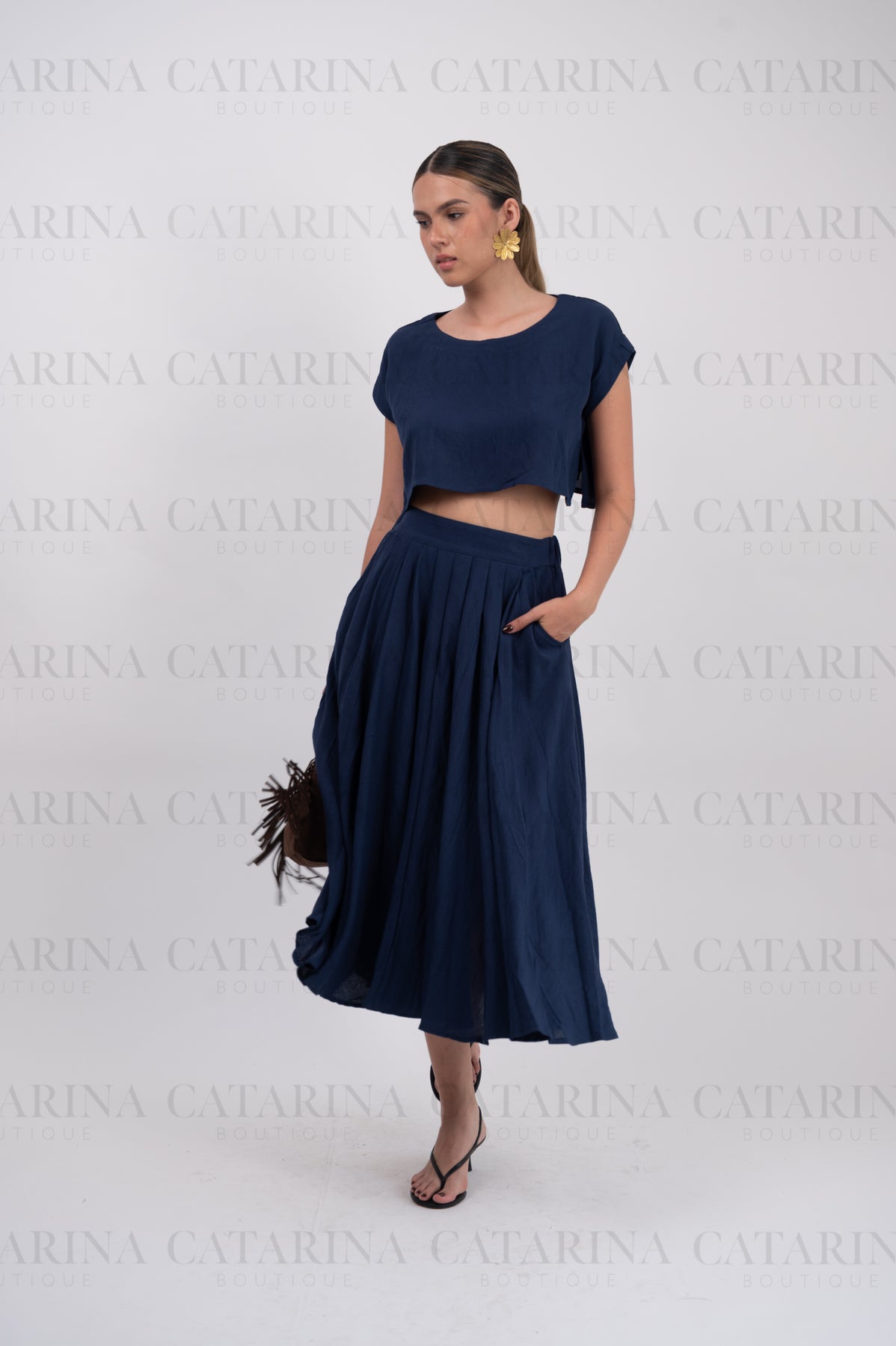 Conjunto de top de escote redondo. Manga corta. Falda larga con volante.