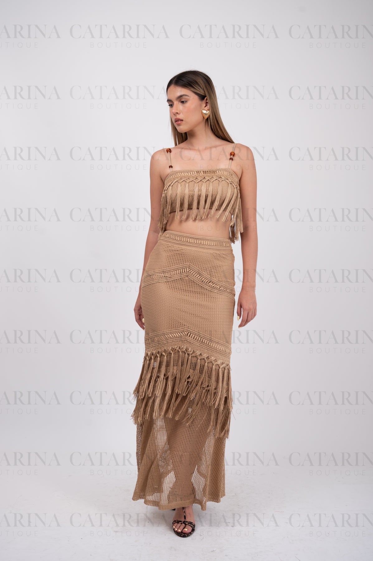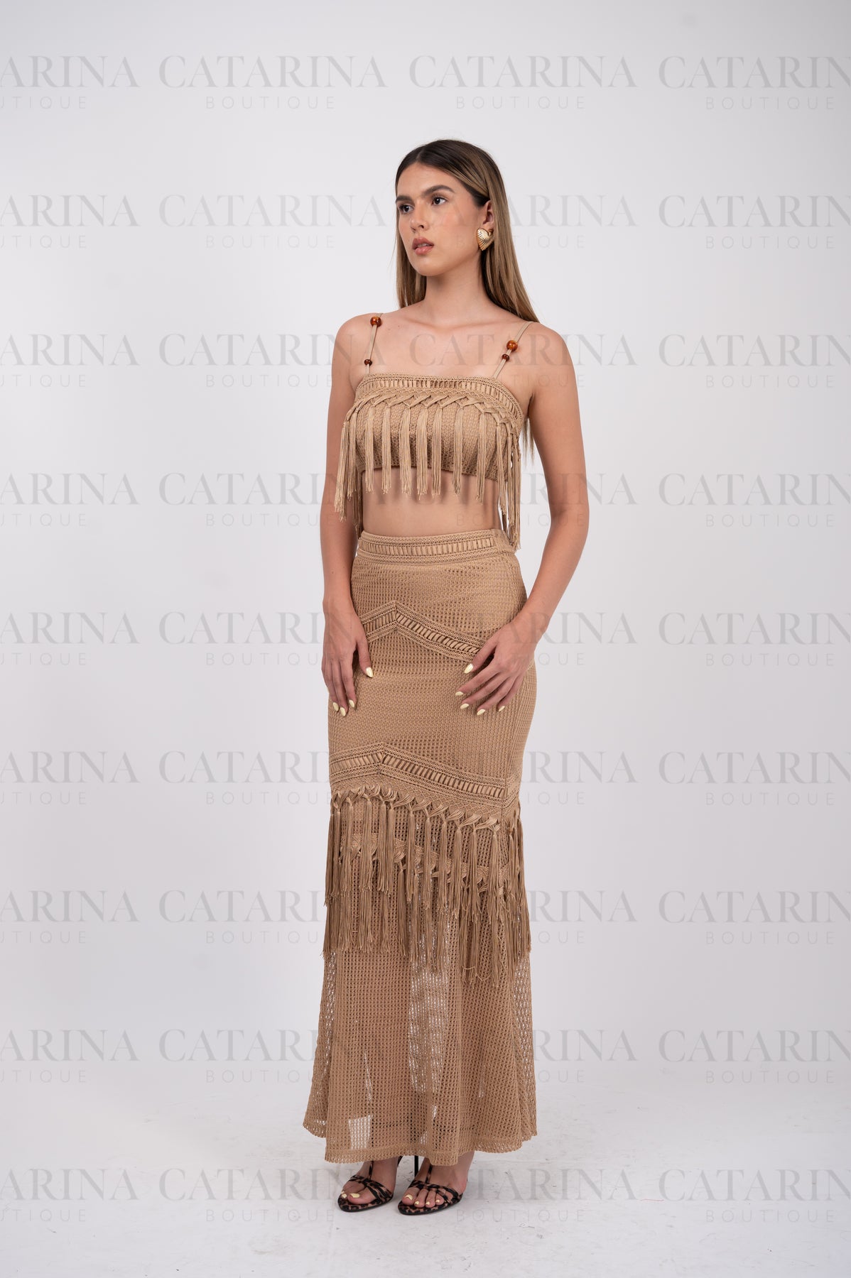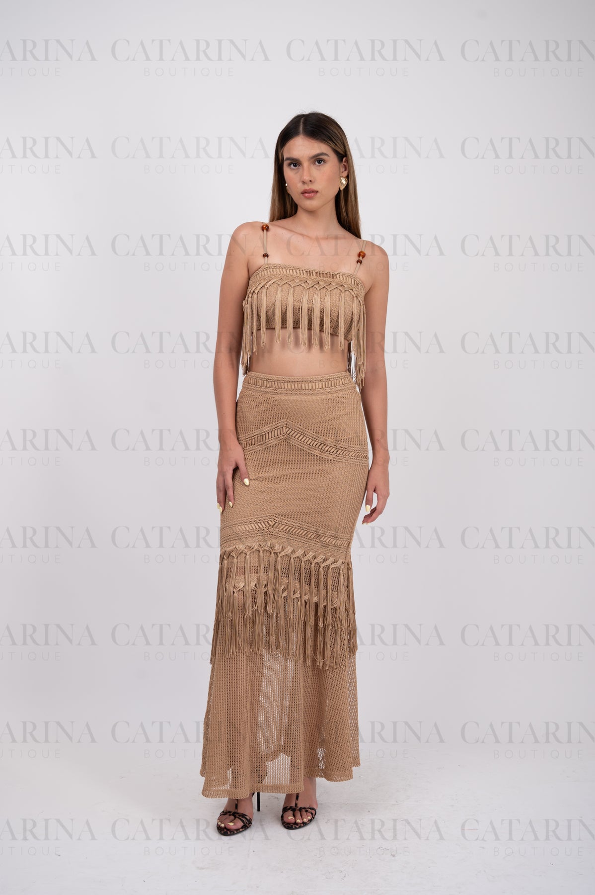 Conjunto de blusa y falda. Top de escote recto. Tirantes delgados ajustables. Falda lisa. Bajo acabado recto. Detalle de hilos sueltos.COMPOSICIÓN:100% Poliéster.Material que no se estira ni se encoge.*NO INCLUYE ACCESORIOS*