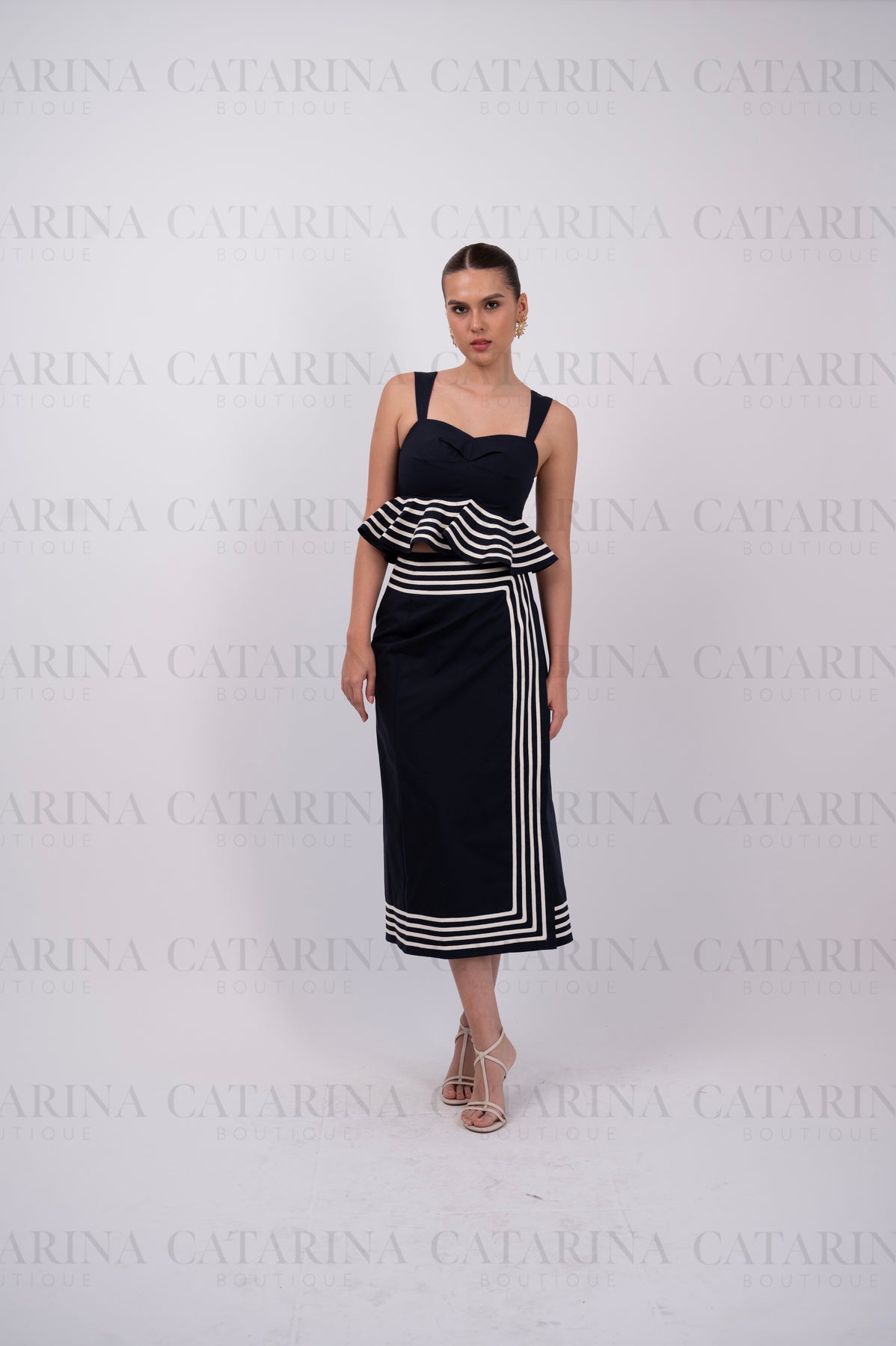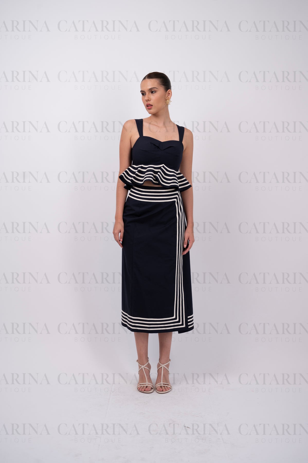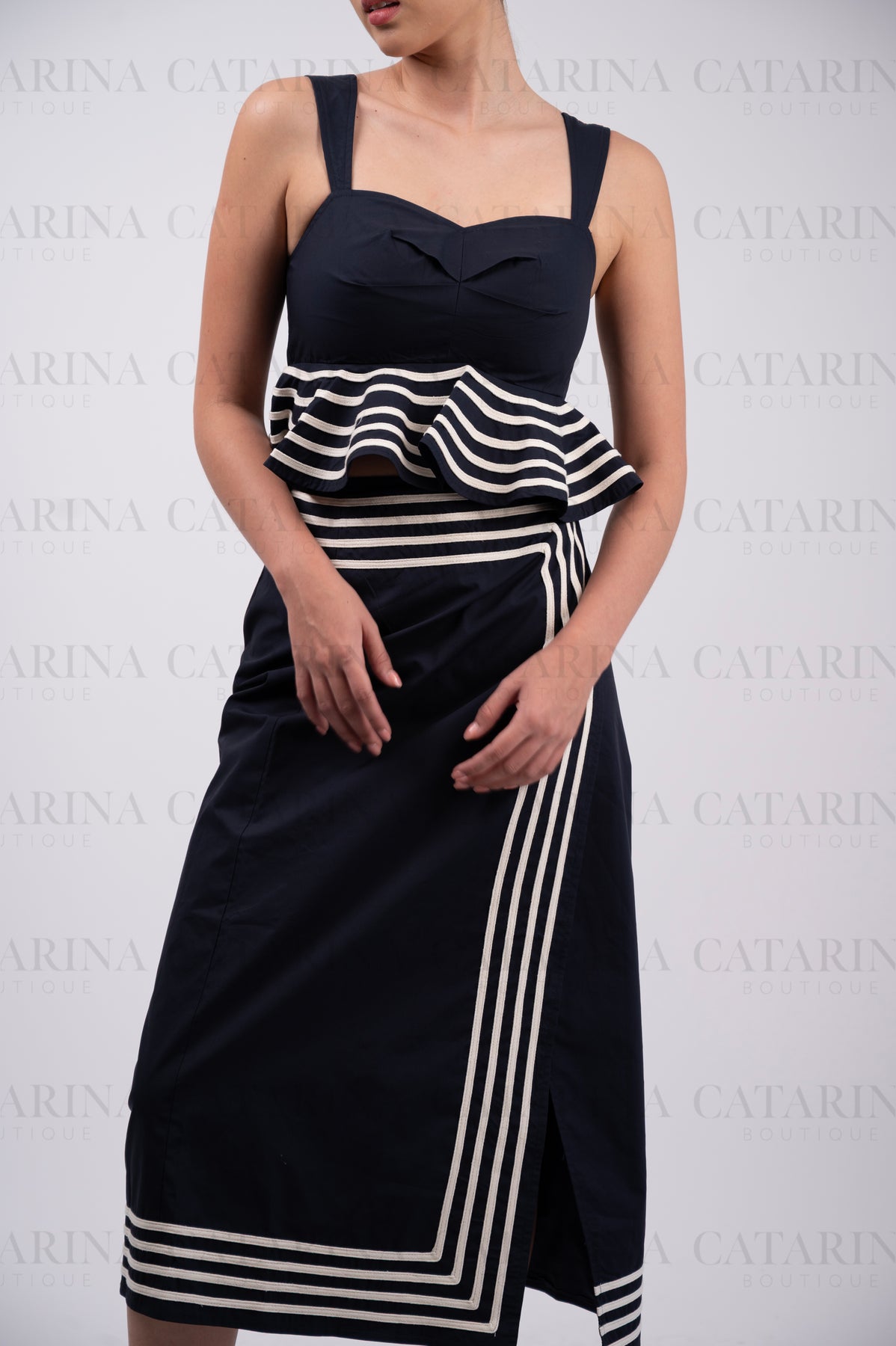 Conjunto de top y Falda. Top corto con escote en forma de corazón y un distintivo olan en el bajo. Falda a juego.
