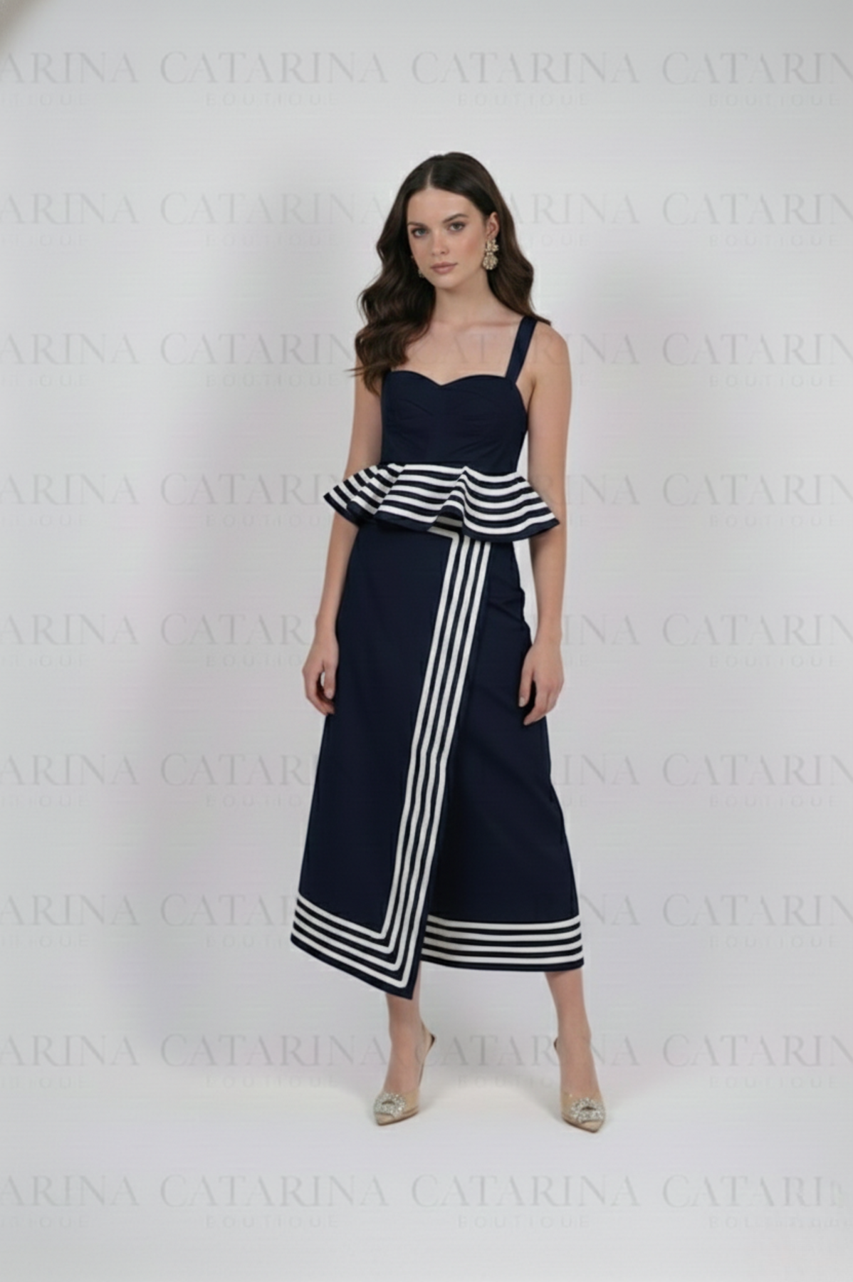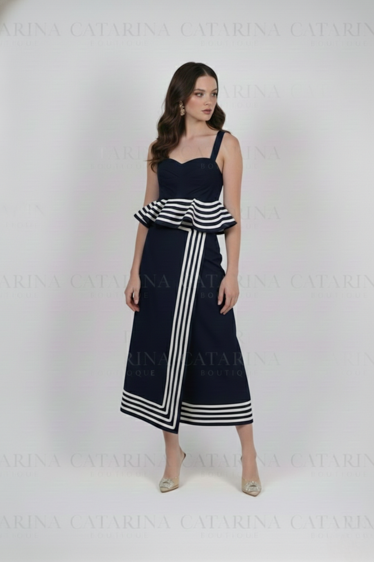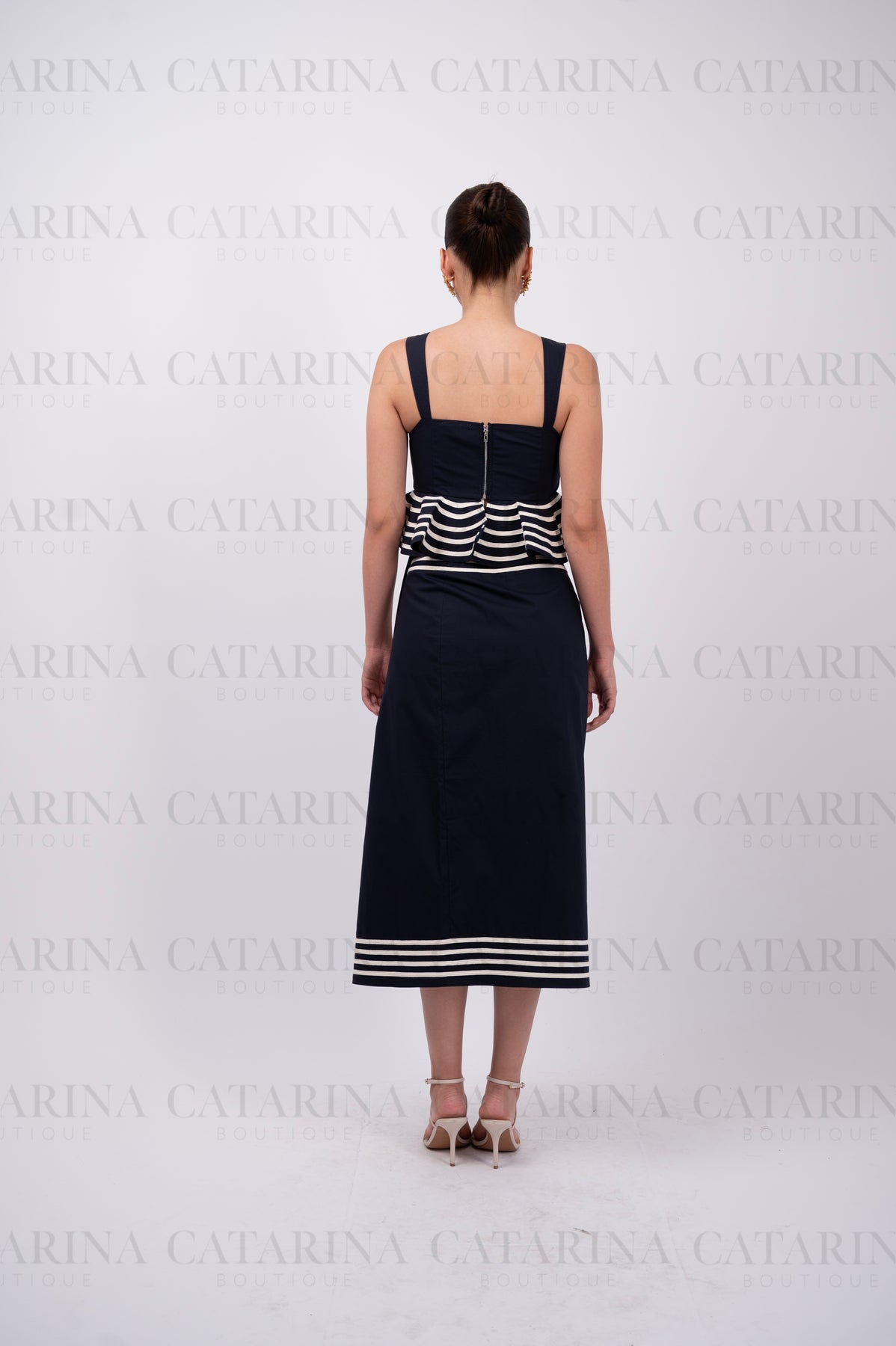 Conjunto de top y Falda. Top corto con escote en forma de corazón y un distintivo olan en el bajo. Falda a juego.