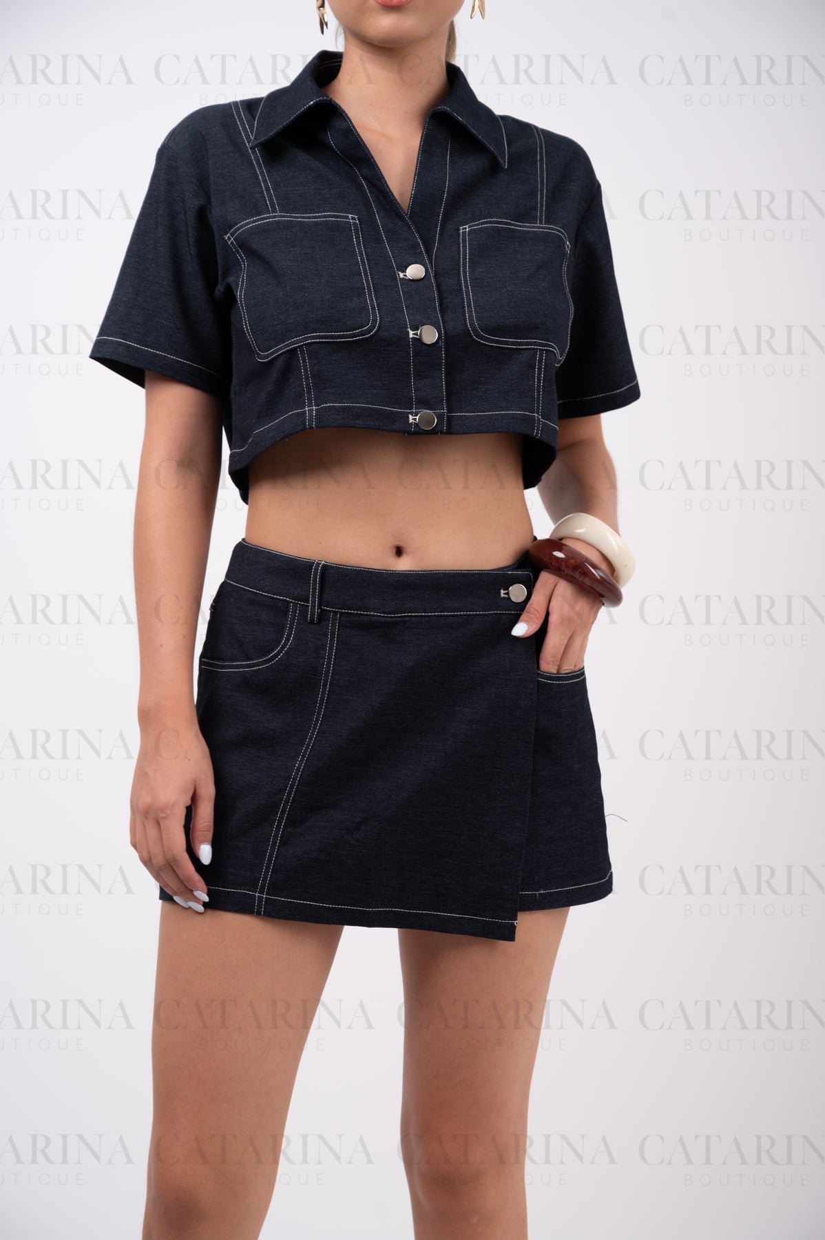 Conjunto de camisa y short-falda. Camisa manga corta. Cuello tipo americano. Botones al frente. Short-falda de tiro alto. Bajo acabado recto.