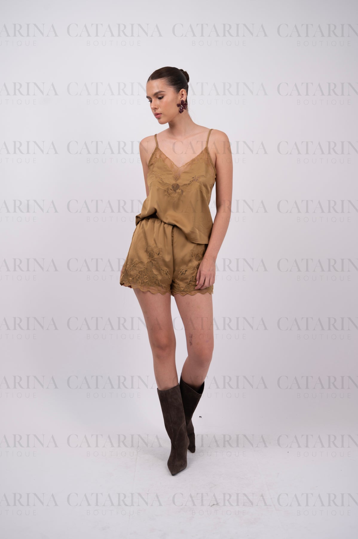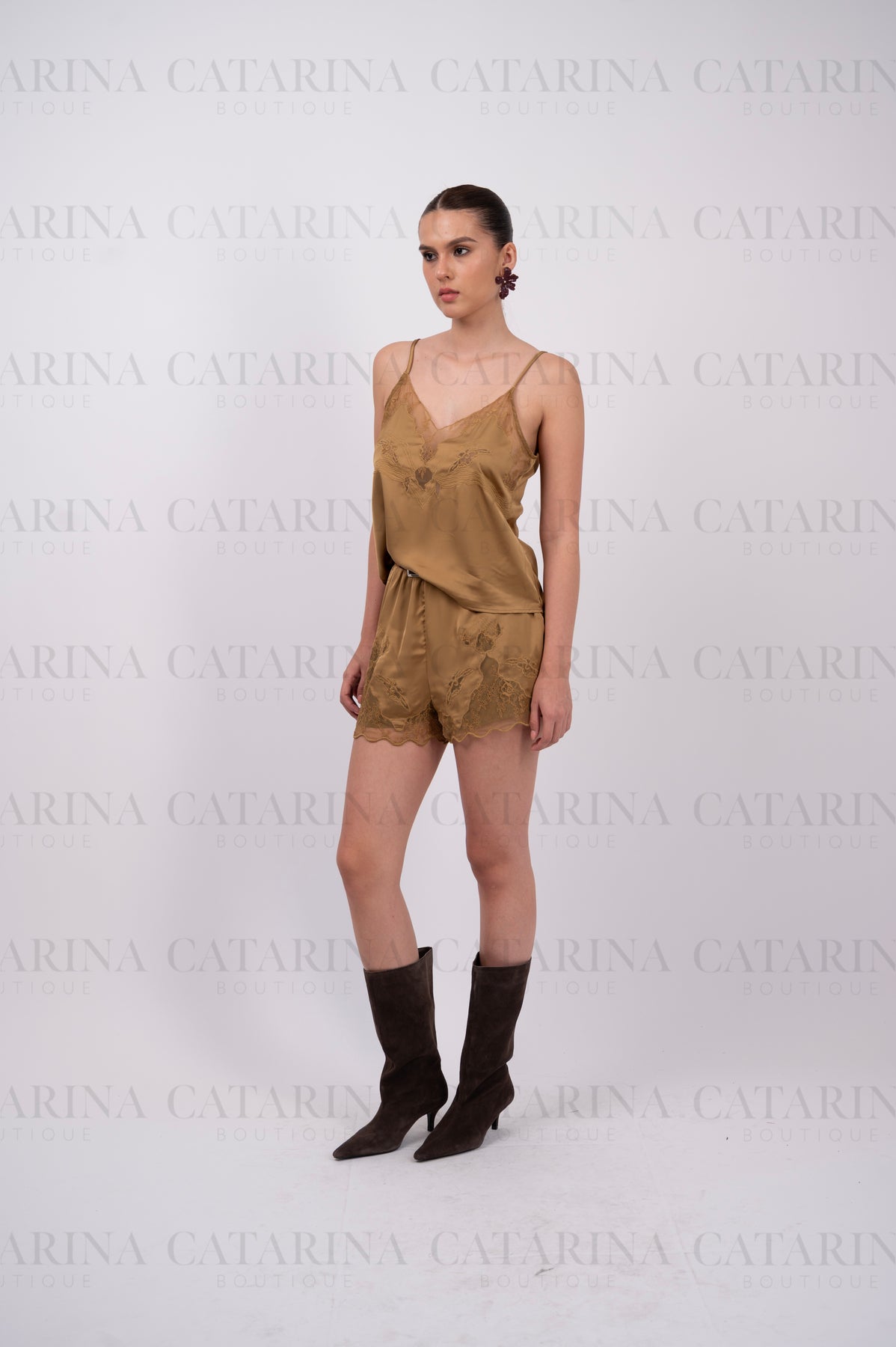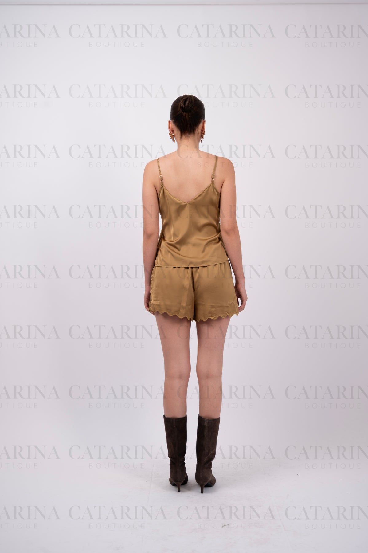 Conjunto de blusa y short. Blusa de tirantes delgados y ajustables. Escote en v. Short de tiro alto. Bajo acabado en volante.