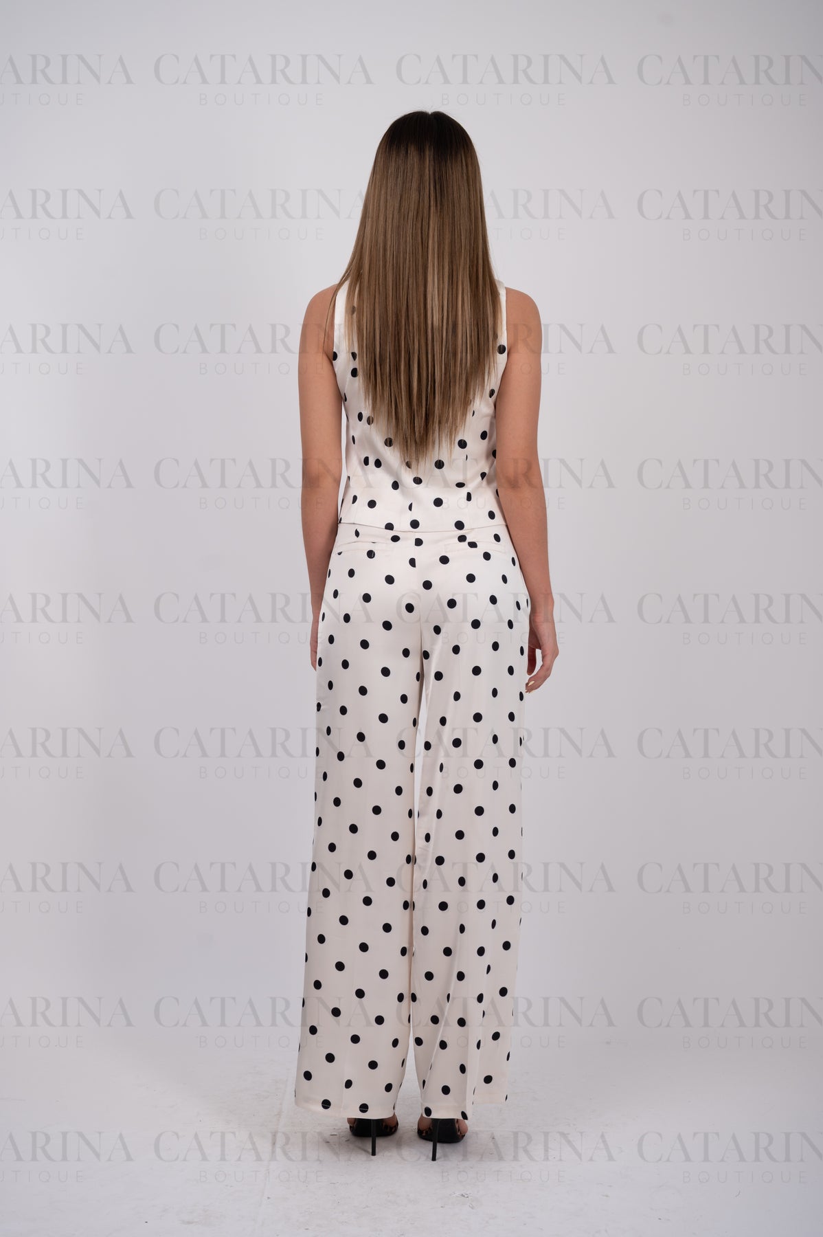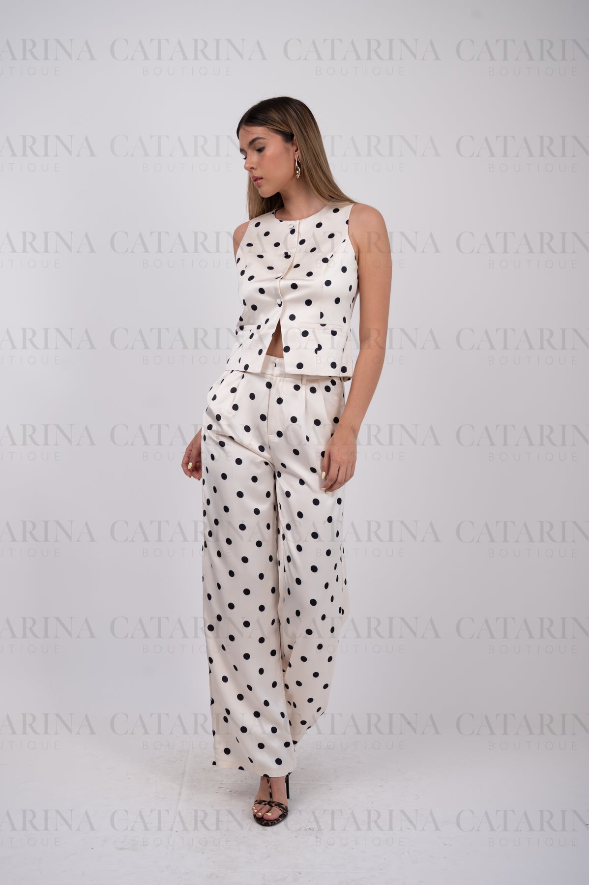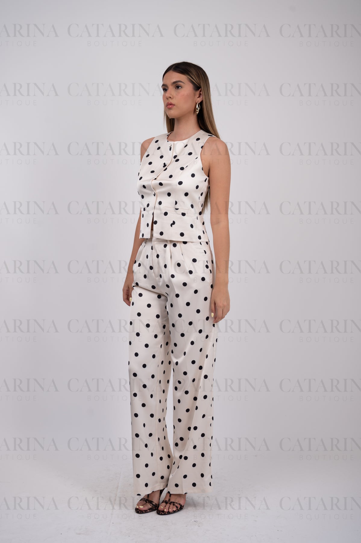 Conjunto de chaleco y pantalón. Chaleco de cuello redondo y manga resacada. Abertura en delantero con botones. Con bolsillos falsos al frente. Forrado. Pantalón liso de tiro alto. Bolsillos delanteros y bolsillos falsos traseros. Pretina con cierre oculto y broche. Pinzas traseras y tablón corte a la cintura. Tela satinada. Marca Vogue Vibes. Tela que no estira.